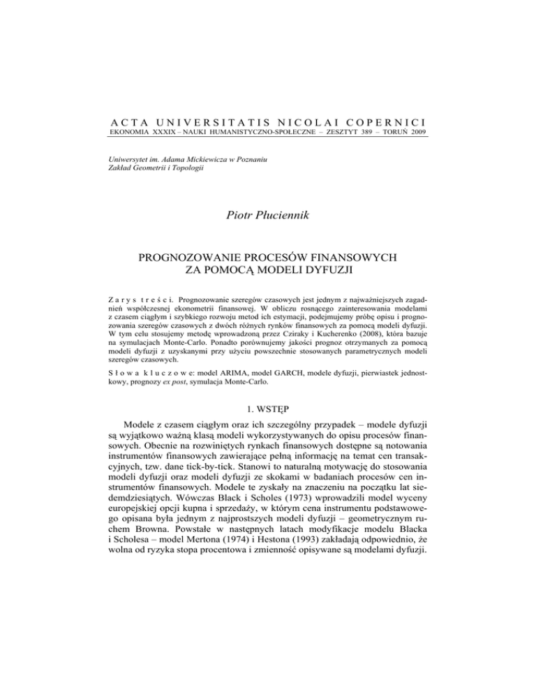 ACTA UNIVERSITATIS NICOLAI COPERNICI EKONOMIA XXXIX – NAUKI HUMANISTYCZNO-SPOŁECZNE – ZESZTYT 389 – TORUŃ 2009 Uniwersytet im. Adama Mickiewicza w Poznaniu Zakład Geometrii i Topologii Piotr Płuciennik PROGNOZOWANIE PROCESÓW FINANSOWYCH ZA POMOCĄ MODELI DYFUZJI Z a r y s t r e ś c i. Prognozowanie szeregów czasowych jest jednym z najważniejszych zagadnień współczesnej ekonometrii finansowej. W obliczu rosnącego zainteresowania modelami z czasem ciągłym i szybkiego rozwoju metod ich estymacji, podejmujemy próbę opisu i prognozowania szeregów czasowych z dwóch różnych rynków finansowych za pomocą modeli dyfuzji. W tym celu stosujemy metodę wprowadzoną przez Cziraky i Kucherenko (2008), która bazuje na symulacjach Monte-Carlo. Ponadto porównujemy jakości prognoz otrzymanych za pomocą modeli dyfuzji z uzyskanymi przy użyciu powszechnie stosowanych parametrycznych modeli szeregów czasowych. S ł o w a k l u c z o w e: model ARIMA, model GARCH, modele dyfuzji, pierwiastek jednostkowy, prognozy ex post, symulacja Monte-Carlo. 1. WSTĘP Modele z czasem ciągłym oraz ich szczególny przypadek – modele dyfuzji są wyjątkowo ważną klasą modeli wykorzystywanych do opisu procesów finansowych. Obecnie na rozwiniętych rynkach finansowych dostępne są notowania instrumentów finansowych zawierające pełną informację na temat cen transakcyjnych, tzw. dane tick-by-tick. Stanowi to naturalną motywację do stosowania modeli dyfuzji oraz modeli dyfuzji ze skokami w badaniach procesów cen instrumentów finansowych. Modele te zyskały na znaczeniu na początku lat siedemdziesiątych. Wówczas Black i Scholes (1973) wprowadzili model wyceny europejskiej opcji kupna i sprzedaży, w którym cena instrumentu podstawowego opisana była jednym z najprostszych modeli dyfuzji – geometrycznym ruchem Browna. Powstałe w następnych latach modyfikacje modelu Blacka i Scholesa – model Mertona (1974) i Hestona (1993) zakładają odpowiednio, że wolna od ryzyka stopa procentowa i zmienność opisywane są modelami dyfuzji. PIOTR PŁUCIENNIK 278 Kolejnym obszarem zastosowań wspomnianych modeli są zagadnienia dotyczące opisu i prognozowania stóp procentowych (struktury terminowej), a także restrukturyzowanych instrumentów dłużnych. Pojawiające się obecnie na rynkach finansowych zaburzenia związane są między innymi z trudnościami dotyczącymi poprawnej wyceny bardzo złożonych instrumentów pochodnych opartych na instrumentach dłużnych. Tematyka ta została podjęta m.in. przez Detemple i Osakwe (1999), którzy zaproponowali model wyceny pojawiających się obecnie w obrocie giełdowym opcji na zmienność, Jagannathana i inni (2004), którzy zastosowali wielowymiarowe modele CIR do wyceny kontraktów cap i swapcji oraz Mannoliniego i in. (2008) wyceniających kontrakty cap i floor za pomocą rozszerzonego modelu CIR. W niniejszej pracy modele dyfuzji wykorzystano do prognozowania średniej warunkowej logarytmicznych poziomów indeksów giełdowych NASDAQ i WIG20. Parametry oszacowano za pomocą nowoczesnej dwukrokowej metody Phillipsa i Yu (2009) oraz wprowadzonej przez Hansena (1982) uogólnionej metody momentów (GMM). Głównym celem pracy jest ocena jakości prognoz średniej warunkowej otrzymanych za pomocą modeli dyfuzji oraz porównanie ich jakości z prognozami otrzymanymi za pomocą powszechnie stosowanych dyskretnych modeli parametrycznych. 2. WYBRANE MODELE Do modelowania logarytmicznych poziomów indeksów giełdowych wykorzystujemy popularne modele dyfuzji. Większość z nich była pierwotnie stosowana do modelowania stóp procentowych. Istotną cechą wszystkich wykorzystanych w pracy modeli jest własność powracania procesu do średniej. Najbardziej elementarny z nich, model Vašíčka (1977) zakłada, że proces opisany jest przez następujące stochastyczne równanie różniczkowe dX t = κ ( μ − X t )dt + σdBt (1) z warunkiem początkowym X t 0 = x0 , gdzie parametry κ , μ i σ przyjmują wartości dodatnie. Parametr μ może być interpretowany jako wartość, do której zbiega wartość oczekiwana procesu X t przy t → ∞ , κ – jako tempo powracania procesu do średniej, natomiast σ określa zmienność procesu X t . Cox, Ingersoll i Ross (1985) zaproponowali następujący model, nazywany w skrócie CIR, będący modyfikacją modelu Vašíčka, w którym proces ceny modelowany jest równaniem dX t = κ ( μ − X t )dt + σ X t dBt (2) z warunkiem początkowym X t 0 = x0 . Umieszczenie pierwiastka kwadratowego w funkcji dyfuzji powoduje, że modelowany proces przyjmuje wartości nie- Prognozowanie procesów finansowych za pomocą modeli dyfuzji 279 ujemne, jeśli 2κμ > σ 2 . Chan i inni (1992) wprowadzili model, który od pierwszych liter nazwisk autorów został nazywany w skrócie modelem CKLS. Autorzy założyli, że proces modelowany jest przez następujące różniczkowe równanie stochastyczne dX t = κ ( μ − X t )dt + σX tβ dBt (3) z warunkiem początkowym X t0 = x0 , gdzie β ≥ 0 nazywany jest parametrem elastyczności wariancji, natomiast parametry κ , μ i σ przyjmują wartości dodatnie i mają taką samą interpretację, jak w wyżej opisanych modelach. Nakładając restrykcje na poszczególne parametry można uzyskać siedem różnych modeli dyfuzji, w tym również przedstawione powyżej modele Vašíčka i CIR (patrz Chan i inni, 1992). 3. WYZNACZENIE JEDNODNIOWYCH PROGNOZ EX POST Z MODELI DYFUZJI Niech Xˆ t (l ) będzie prognozą zmiennej X t + l , odpowiadającą błędowi średniokwadratowemu jako funkcji straty. Oznacza to, że prognoza jest zmienną losową dobraną w taki sposób, aby ) E[ X t +l − X t (l )]2 ≤ min E[ X t − g ( X t ,..., X 1 )]2 , (4) g Gdzie g ( X t ,..., X 1 ) jest dowolną funkcją mierzalną względem σ-ciała generowanego przez informacje na temat procesu do momentu t włącznie. Zmienną Xˆ t (l ) (lub jej realizację) nazywamy prognozą l kroków naprz