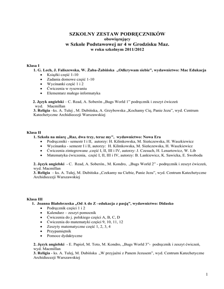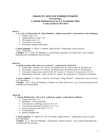 SZKOLNY ZESTAW PODRĘCZNIKÓW obowiązujący w Szkole Podstawowej nr 4 w Grodzisku Maz. w roku szkolnym 2011/2012 Klasa I 1. G. Lech, J. Faliszewska, W. Żaba-Żabińska „Odkrywam siebie”, wydawnictwo: Mac Edukacja • Książki część 1-10 • Zadania domowe część 1-10 • Wycinanki część 1 i 2 • Ćwiczenia w rysowaniu • Elementarz małego informatyka 2. Język angielski – C. Read, A. Soberón „Bugs World 1” podręcznik i zeszyt ćwiczeń wyd. Macmillan 3. Religia –ks. A. Tulej , M. Dubińska, A. Grzybowska „Kochamy Cię, Panie Jezu”, wyd. Centrum Katechetyczne Archidiecezji Warszawskiej Klasa II 1. Szkoła na miarę „Raz, dwa trzy, teraz my”, wydawnictwo: Nowa Era • Podręczniki - semestr I i II, autorzy: H. Kilmkowska, M. Sieńczewska, H. Waszkiewicz • Wycinanka - semestr I i II, autorzy: H. Kilmkowska, M. Sieńczewska, H. Waszkiewicz • Ćwiczenia zintegrowane ,część I, II, III i IV, autorzy: J. Czesuch, H. Lenartowicz, W. Lib • Matematyka ćwiczenia, część I, II, III i IV, autorzy: B. Lankiewicz, K. Sawicka, E. Swoboda 2. Język angielski - C. Read, A. Soberón., M. Kondro, „Bugs World 2” - podręcznik i zeszyt ćwiczeń, wyd. Macmillan 3. Religia – ks. A. Tulej, M. Dubińska „Czekamy na Ciebie, Panie Jezu”, wyd. Centrum Katechetyczne Archidiecezji Warszawskiej Klasa III 1. Joanna Białobrzeska „Od A do Z –edukacja z pasją”, wydawnictwo: Didasko • Podręcznik części 1 i 2 • Kalendarz – zeszyt pomocnik • Ćwiczenia do j. polskiego części A, B, C, D • Ćwiczenia do matematyki części 9, 10, 11, 12 • Zeszyty matematyczne część 1, 2, 3, 4 • Przypamiętnik • Pomoce dydaktyczne 2. Język angielski - E. Papiol, M. Toto, M. Kondro, „Bugs World 3”- podręcznik i zeszyt ćwiczeń, wyd. Macmillan 3. Religia - ks. A. Tulej, M. Dubińska „W przyjaźni z Panem Jezusem”, wyd. Centrum Katechetyczne Archidiecezji Warszawskiej 1 Klasa IV 1. język polski, wydawnictwo Operon • Małgorzata Składanek „Podręcznik. Kształcenie kulturowo-literackie - kl.4”, • Aneta Kempa, Dorota Szachnowska „Kształcenie językowe. Wiadomości i ćwiczenia - kl.4” • (obowiązuje w klasie 4b) Artur Pruszyński, Małgorzata Składanek „Zeszyt ćwiczeń - kl.4” 2. historia, wydawnictwo WSiP Martyna Deszczyńska, Marek Deszczyński „Poznajemy historię ojczystą - kl. 4”, podręcznik i ćwiczenia 3. język angielski, wyd. Oxford University Press • Cathy Lawday, Mark Hancock „Winners Plus 1”, podręcznik • Lindsay White “Winners Plus 1”, zeszyt ćwiczeń 4. matematyka, Gdańskie Wydawnictwo Oświatowe • Małgorzata Dobrowolska, Piotr Zarzycki „Matematyka 4. Podręcznik dla klasy czwartej szkoły podstawowej” (nowa wersja) • S. Wojtan, P. Zarzycki, zeszyty ćwiczeń - 3 części :„Liczby naturalne”, „Ułamki”,„Figury geometryczne” (nowa wersja) 5. przyroda, wydawnictwo WSiP E. Gromek. E. Kłos, W. Kofta, E. Laskowska, A. Melson „Przyrodo witaj - 4. W domu i w okolicy” podręcznik, ćwiczenia i atlas 6. muzyka, wydawnictwo Operon M. Rykowska, Z. Szałko „Muzyka” - podręcznik i zeszyt ćwiczeń 7. plastyka, wydawnictwo Operon • podręcznik M. Polkowska, L. Wyszkowska „Plastyka dla klas 4 - 6” • zeszyt ćwiczeń J. Tomaszewska, W. Kołyszko, B. Kubicka „Plastyka - część I” 8. technika, wydawnictwo Operon • U. Białka, J. Chrabąszcz „Technika. Część komunikacyjna.”, podręcznik 9. religia, wyd. Księgarnia św. Wojciecha, Poznań ks. J. Szpeta „Powołani przez Boga Ojca” Klasa V 1. język polski, wydawnictwo Operon • Małgorzata Składanek „ Podręcznik. Kształcenie kulturowo-literackie - kl. 5”, • Magdalena Siembor, Hanna Szaniawska „Podręcznik. Kształcenie językowe. - kl. 5” • Dorota Szachnowska „Zeszyt ćwiczeń kl.5” 2. historia, wydawnictwo WSiP Katarzyna Zielińska, Dariusz Kołodziejczyk „Poznajemy dzieje cywilizacji - kl. 5”, podręcznik i ćwiczenia 3. język angielski, wyd. Oxford University Press • Cathy Lawday, Mark Hancock „Winners Plus 2”, podręcznik • Lindsay White “Winners Plus 2”, zeszyt ćwiczeń 4. matematyka, Gdańskie Wydawnictwo Oświatowe • Małgorzata Dobrowolska, Piotr Zarzycki „Matematyka 5. Podręcznik dla klasy piątej szkoły podstawowej” (nowa wersja) • M. Dobrowolska, A. Misior, P. Zarzycki, zeszyty ćwiczeń - 3 części: „Liczby całkowite i ułamki cz.1”, „Liczby całkowite i ułamki cz.2”, „Geometria” (nowa wersja) 5. przyroda, wydawnictwo WSiP E. Gromek. E. Kłos, W. Kofta, E. Laskowska, A. Melson „Przyrodo, witaj – 5. Polska i jej mieszkańcy”, podręcznik, ćwiczenia i atlas 6. muzyka, wydawnictwo Operon M. Rykowska, Z. Szałko „Muzyka”, podręcznik i zeszyt ćwiczeń 7. plastyka, wydawnictwo Operon • M. Polkowska, L. Wyszkowska, podręcznik „Plastyka dla klas 4 - 6” • B. Kubicka „Plastyka część II”, zeszyt ćwiczeń 8. wychowanie do życia w rodzinie, wyd. Ośrodek Edukacyjny „Taurus” M. Sitarska, B. Strzemieczna „Wychowanie do życia w rodzinie” – zeszyt ucznia klasy 5. 9. religia, wyd. Księgarnia św. Wojciecha, Poznań ks. J. Szpeta, D. Jackowiak „Umiłowani w Jezusie Chrystusie” 2 Klasa VI 1. język polski, wydawnictwo Operon • Magdalena Siembor, Hanna Szaniawska „Podręcznik. Kształcenie kulturowo-językowe - kl. 6” • Magdalena Siembor, Hanna Szaniawska „Kształcenie językowe - kl. 6. Wiadomości i ćwiczenia” • D. Szachnowska „Zeszyt ćwiczeń dla uczniów szkoły podstawowej kl. 6” 2. historia, wydawnictwo WSiP A. Landan-Czajka, K. Mędrzecki „Poznajemy świat wokół nas”, podręcznik i ćwiczenia 3. język angielski, wyd. Oxford University Press • Cathy Lawday, Mark Hancock „Winners Plus 3”, podręcznik • Lindsay White “Winners Plus 3”, zeszyt ćwiczeń 4. matematyka, Gdańskie Wydawnictwo Oświatowe • Małgorzata Dobrowolska, Piotr Zarzycki „Matematyka 6”, podr