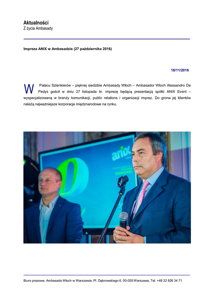 Aktualności Z życia Ambasady Impreza ANIX w Ambasadzie (27 października 2016) 18/11/2016 W Pałacu Szlenkierów – pięknej siedzibie Ambasady Włoch – Ambasador Włoch Alessandro De Pedys gościł w dniu 27 listopada br. imprezę będącą prezentacją spółki ANIX Event – wyspecjalizowaną w branży komunikacji, public relations i organizacji imprez. Do grona jej klientów należą najważniejsze korporacje międznarodowe na rynku. Biuro prasowe, Ambasada Włoch w Warszawie, Pl. Dąbrowskiego 6, 00-055 Warszawa, Tel. +48 22 826 34 71 Biuro prasowe, Ambasada Włoch w Warszawie, Pl. Dąbrowskiego 6, 00-055 Warszawa, Tel. +48 22 826 34 71 Biuro prasowe, Ambasada Włoch w Warszawie, Pl. Dąbrowskiego 6, 00-055 Warszawa, Tel. +48 22 826 34 71