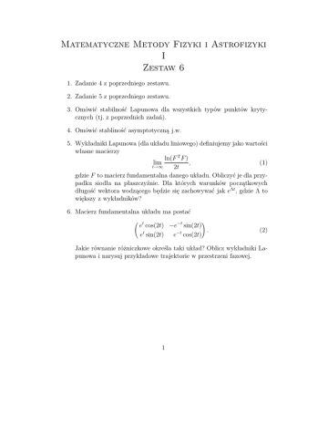 Matematyczne Metody Fizyki i Astrofizyki I Zestaw 6 1. Zadanie 4 z poprzedniego zestawu. 2. Zadanie 5 z poprzedniego zestawu. 3. Omówić stabilność Lapunowa dla wszystkich typów punktów krytycznych (tj. z poprzednich zadań). 4. Omówić stabliność asymptotyczną j.w. 5. Wykładniki Lapunowa (dla układu liniowego) definiujemy jako wartości własne macierzy ln(F T F ) lim , (1) t→∞ 2t gdzie F to macierz fundamentalna danego układu. Obliczyć je dla przypadku siodła na płaszczyźnie. Dla których warunków początkowych długość wektora wodzącego będzie się zachowywać jak eΛt , gdzie Λ to większy z wykładników? 6. Macierz fundamentalna układu ma postać et cos(2t) −e−t sin(2t) . et sin(2t) e−t cos(2t) ! (2) Jakie równanie różniczkowe określa taki układ? Oblicz wykładniki Lapunowa i narysuj przykładowe trajektorie w przestrzeni fazowej. 1