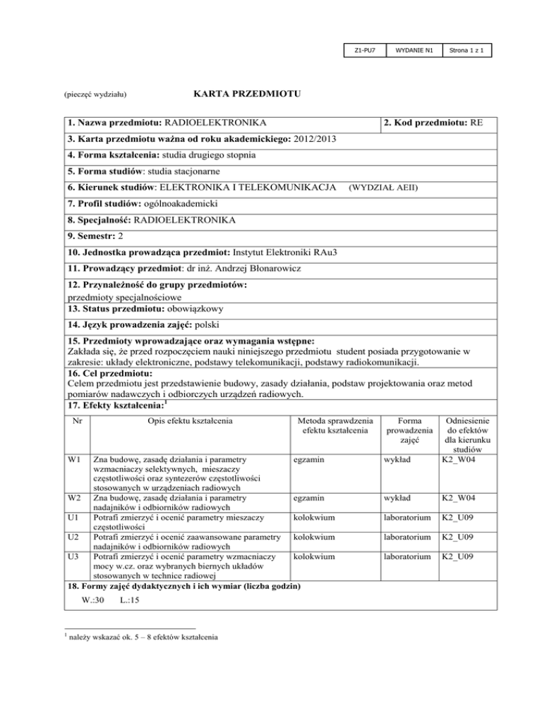 Z1-PU7 (pieczęć wydziału) WYDANIE N1 Strona 1 z 1 KARTA PRZEDMIOTU 1. Nazwa przedmiotu: RADIOELEKTRONIKA 2. Kod przedmiotu: RE 3. Karta przedmiotu ważna od roku akademickiego: 2012/2013 4. Forma kształcenia: studia drugiego stopnia 5. Forma studiów: studia stacjonarne 6. Kierunek studiów: ELEKTRONIKA I TELEKOMUNIKACJA (WYDZIAŁ AEII) 7. Profil studiów: ogólnoakademicki 8. Specjalność: RADIOELEKTRONIKA 9. Semestr: 2 10. Jednostka prowadząca przedmiot: Instytut Elektroniki RAu3 11. Prowadzący przedmiot: dr inż. Andrzej Błonarowicz 12. Przynależność do grupy przedmiotów: przedmioty specjalnościowe 13. Status przedmiotu: obowiązkowy 14. Język prowadzenia zajęć: polski 15. Przedmioty wprowadzające oraz wymagania wstępne: Zakłada się, że przed rozpoczęciem nauki niniejszego przedmiotu student posiada przygotowanie w zakresie: układy elektroniczne, podstawy telekomunikacji, podstawy radiokomunikacji. 16. Cel przedmiotu: Celem przedmiotu jest przedstawienie budowy, zasady działania, podstaw projektowania oraz metod pomiarów nadawczych i odbiorczych urządzeń radiowych. 17. Efekty kształcenia:1 Nr Opis efektu kształcenia W1 Metoda sprawdzenia efektu kształcenia Zna budowę, zasadę działania i parametry egzamin wzmacniaczy selektywnych, mieszaczy częstotliwości oraz syntezerów częstotliwości stosowanych w urządzeniach radiowych W2 Zna budowę, zasadę działania i parametry egzamin nadajników i odbiorników radiowych U1 Potrafi zmierzyć i ocenić parametry mieszaczy kolokwium częstotliwości U2 Potrafi zmierzyć i ocenić zaawansowane parametry kolokwium nadajników i odbiorników radiowych U3 Potrafi zmierzyć i ocenić parametry wzmacniaczy kolokwium mocy w.cz. oraz wybranych biernych układów stosowanych w technice radiowej 18. Formy zajęć dydaktycznych i ich wymiar (liczba godzin) W.:30 1 L.:15 należy wskazać ok. 5 – 8 efektów kształcenia Forma prowadzenia zajęć wykład Odniesienie do efektów dla kierunku studiów K2_W04 wykład K2_W04 laboratorium K2_U09 laboratorium K2_U09 laboratorium K2_U09 Z1-PU7 WYDANIE N1 Strona 2 z 2 19. Treści kształcenia: Wykład Wzmacniacze selektywne w.cz. Własności, parametry i technika realizacji wzmacniaczy selektywnych. Wzmacniacz rezonansowy. Wzmacniacz z obwodami sprzężonymi. Wzmacniacze z filtrami wieloobwodowymi i piezoceramicznymi. Przechodzenie sygnałów przez układ nieliniowy. Zniekształcenia nieliniowe, intermodulacja, modulacja skrośna, blokowanie. Przemiana częstotliwości. Układy mnożące w zakresie w.cz. Układ: z kwadratorami, z elementami nieliniowymi, Gilberta. Układy zrównoważone. Praca układu mnożącego z dużą amplitudą sygnału. Zniekształcenia sygnału w procesie przemiany częstotliwości. Porównanie parametrów układów przemiany częstotliwości. Układy odbiorników i ich własności. Zasada odbioru radiowego. Podstawowe parametry odbiornika: czyłość, selektywność, stałość częstotliwości dostrojenia. Odbiornik o bezpośrednim wzmocnieniu. Odbiornik z przemianą częstotliwości. Odbiornik z wielokrotną przemianą częstotliwości. Odbiornik szerokopasmowy z przemianą w górę. Analizator widma. Odbiornik z demodulatorem kwadraturowym. Bilans sygnałów i szumów w odbiorniku. Szczegółowe parametry odbiorników: kanały pasożytnicze, równoważna moc szumów, współczynnik szumów, odporność na intermodulację, zakres dynamiki. Układy nadajników i ich własności. Podstawowe parametry nadajników: częstotliwość i moc sygnału, parametry modulacji, szerokość zajmowanego pasma, emisje niepożądane. Nadajnik o bezpośrednim wzmocnieniu. Nadajnik z powieleniem częstotliwości. Nadajnik z przemianą częstotliwości. Nadajnik z wielokrotną przemianą częstotliwości. Nadajnik szerokopasmowy z przemianą w dół. Nadajnik z modulatorem kwadraturowym. Generatory sygnałów w.cz. w urządzeniach radiowych. Parametry generatorów sinusoidalnych: stałość częstotliwości, czystość spektralna, szumy fazowe. Generatory LC, kwarcowe, TCXO, OCXO. Syntezery częstotliwości. Bezpośrednia analogowa synteza częstotliwości. Układ PLL i jego szczegółowe własności statyczne i dynamiczne. Rodzaje detektorów fazy i częstotliwości. Wyznaczanie parametrów filtrów pętlowych dla typowych impulsowych detektorów fazy. Budowa syntezerów z układem PLL, metody: podziału częstotliwości z wykorzystaniem dwuwspółczynnikowych dzielników wstępnych, rozszerzenia zakresu częstotliwości wyjściowych, skrócenia czasu dojścia do synchronizmu, zwiększenia rozdzielczości w systemach jedno i wielopętlowych. Modulacja i demodulacja częstotliwości w układzie PLL. Bezpośrednia cyfrowa synteza częstotliwości DDS. Modulacje w układzie DDS. Laboratorium Tematy ćwiczeń: • Układy przemiany częstotliwości (badane układy: mieszacz z tranzystorem bipolarnym, mieszacz z tranzystorem polowym, mieszacz Gilberta, mieszacz pierścieniowy diodowy; pomiary: wzmocnienie przemiany, izolacje, zniekształcenia intermodulacyjne) • Układy bierne techniki radiowej ( badane układy: wąskopasmowe układy dopasowujące o stałych skupionych i rozłożonych, transformatory szerokopasmowe, transformatory z liniami TEM, filtry o stałych rozłożonych, sprzęgacze kierunkowe; pomiary: elementy macierzy rozproszenia) • Wzmacniacze mocy w.cz. (badane układy: wzmacniacz mocy rezonansowy, wzmacniacz mocy szerokopasmowy; pomiary: skuteczne wzmocnienie mocy, sprawność, impedancja • Pomiary urządzeń odbiorczych (badane urządzenie: odbiornik komunikacyjny HF z emisjami CW, AM, FM, SSB; pomiary: czułość, selektywność, tłumienie kanałów pasożytniczych, odporność na intermodulację odporność na blokowanie, współczynnik szumów, skuteczność i dynamika ARW, emisje niepożądane) • Pomiary urządzeń nadawczych (badane urządzenie: nadajnik komunikacyjny HF z emisjami CW, AM, FM, SSB; pomiary: moc w kanale użytecznym, parametry modu
