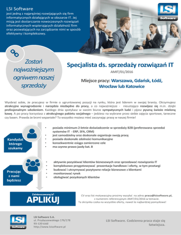 LSI Software jest jedną z najprężniej rozwijających się firm informatycznych działających w obszarze IT. Jej misją jest dostarczanie nowoczesnych rozwiązań informatycznych wspierających działalność firm oraz pozwalających na zarządzanie nimi w sposób efektywny i kompleksowy. Zostań najważniejszym ogniwem naszej sprzedaży Specjalista ds. sprzedaży rozwiązań IT AMIT/01/2016 Miejsce pracy: Warszawa, Gdańsk, Łódź, Wrocław lub Katowice Wyobraź sobie, że pracujesz w firmie o ugruntowanej pozycji na rynku, która jest liderem w swojej branży. Otrzymujesz atrakcyjne wynagrodzenie i narzędzia niezbędne do pracy, a co najważniejsze - nieustająco rozwijasz się m.in. dzięki profesjonalnym szkoleniom. Każdego dnia spotykasz w swoim biurze sympatycznych ludzi i pijesz pyszną świeżo mieloną kawę. A po pracy korzystasz z atrakcyjnego pakietu socjalnego – jedziesz na wybrane przez siebie zajęcia sportowe, taneczne czy basen. Prawda że brzmi wspaniale? To wszystko możesz mieć zaczynając pracę w naszej firmie! • Kandydat którego szukamy Pracując z nami będziesz • • • • posiada minimum 2-letnie doświadczenie w sprzedaży B2B (preferowana sprzedaż systemów IT - ERP, SFA, CRM) jest samodzielny oraz doskonale organizuje swoją pracę posiada doskonałe zdolności komunikacyjne konsekwentnie osiąga zamierzone cele ma czynne prawo jazdy kat. B • • • • • aktywnie pozyskiwać klientów biznesowych oraz sprzedawać rozwiązania IT kompleksowo przygotowywać prezentacje handlowe i oferty, w tym przetargi budować i utrzymywać pozytywne relacje biznesowe z klientami monitorować rynek obsługiwać pozyskanych klientów CV oraz list motywacyjny prosimy wysyłać na adres [email protected], z numerem referencyjnym AMIT/01/2016 w temacie. Ta skrzynka czeka na wszystkie oferty, nawet te najbardziej pomysłowe! LSI Software S.A. ul. Przybyszewskiego 176/178 93-120 Łódź http://www.lsisoftware.pl LSI Software. Codzienna praca staje się łatwiejsza.