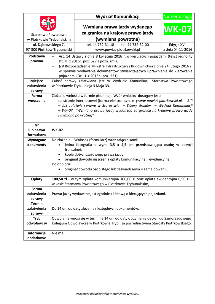 Starostwo Powiatowe w Piotrkowie Trybunalskim ul. Dąbrowskiego 7, 97-300 Piotrków Trybunalski Podstawa prawna Miejsce załatwienia sprawy Forma wnoszenia Nr lub nazwa formularza Wymagane dokumenty Opłaty Forma załatwienia sprawy Termin załatwienia sprawy Tryb odwoławczy Informacje dodatkowe Wydział Komunikacji Numer usługi: Wymiana prawa jazdy wydanego za granicą na krajowe prawo jazdy (wymiana powrotna) WK-07 tel. 44 732-31-18 tel. 44 732-32-00 www.powiat-piotrkowski.pl Edycja XVII z dnia 04-11-2016 Art. 14 Ustawy z dnia 8 kwietnia 2016 r. o kierujących pojazdami (tekst jednolity Dz. U. z 2016r. poz. 627 z późn. zm.), § 8 Rozporządzenie Ministra Infrastruktury i Budownictwa z dnia 24 lutego 2016 r. w sprawie wydawania dokumentów stwierdzających uprawnienia do kierowania pojazdami (Dz. U. z 2016r. poz. 231) Całość sprawy załatwiana jest w Wydziale Komunikacji Starostwa Powiatowego w Piotrkowie Tryb., aleja 3 Maja 33. Złożenie wniosku w formie pisemnej. Wzór wniosku dostępny jest: na stronie internetowej (forma elektroniczna): (www.powiat-piotrkowski.pl - BIP – Jak załatwić sprawę w Starostwie – Wzory druków – Wydział Komunikacji – WK-07 ”Wymiana prawa jazdy wydanego za granicą na krajowe prawo jazdy (wymiana powrotna)” WK-07 Do złożenia - Wniosek (formularz) wraz załącznikami: jedna fotografia o wym. 3,5 x 4,5 cm przedstawiająca osobę w pozycji frontalnej, kopia dotychczasowego prawa jazdy oryginał dowodu uiszczenia opłaty komunikacyjnej i ewidencyjnej. Do odbioru: oryginał dowodu osobistego lub zaświadczenia o zameldowaniu, 100,50 zł - w tym opłata komunikacyjna 100,00 zł oraz opłata ewidencyjna 0,50 zł. w kasie Starostwa Powiatowego w Piotrkowie Trybunalskim, Prawo jazdy wydawane jest zgodnie z Ustawą o kierujących pojazdami. Do 14 dni od daty złożenia niezbędnych dokumentów. Odwołanie wnosi się w terminie 14 dni od daty otrzymania decyzji do Samorządowego Kolegium Odwoławcze w Piotrkowie Tryb., za pośrednictwem Starosty Piotrkowskiego. Nie ma Dokument aktualny tylko w momencie wydruku.