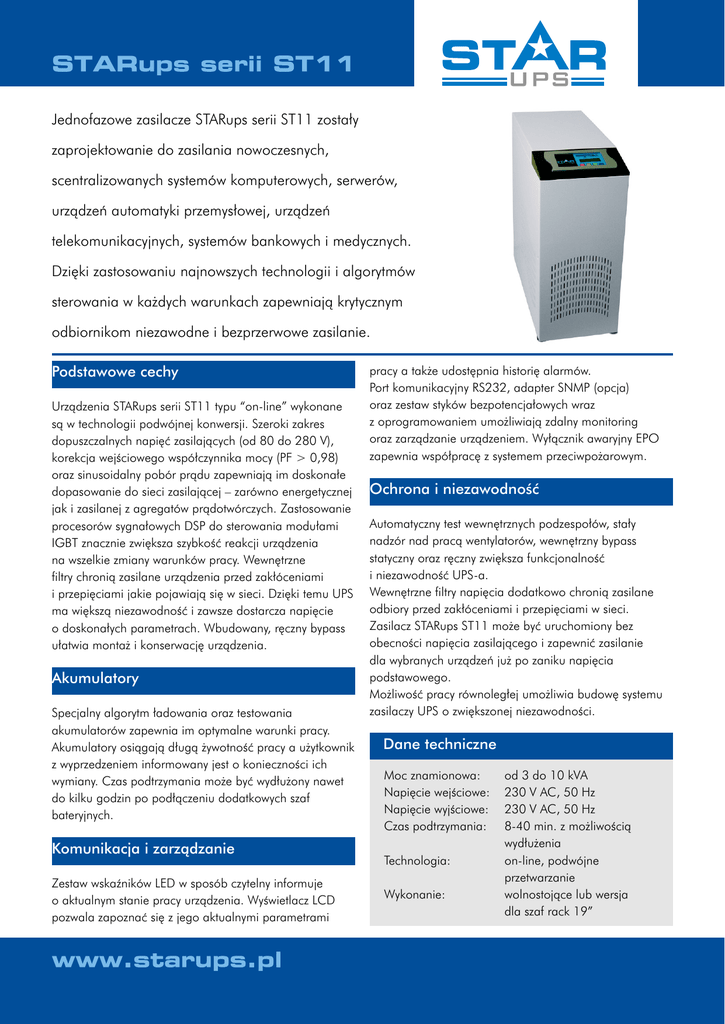 STARups serii ST11 Jednofazowe zasilacze STARups serii ST11 zostały zaprojektowanie do zasilania nowoczesnych, scentralizowanych systemów komputerowych, serwerów, urządzeń automatyki przemysłowej, urządzeń telekomunikacyjnych, systemów bankowych i medycznych. Dzięki zastosowaniu najnowszych technologii i algorytmów sterowania w ka dych warunkach zapewniają krytycznym odbiornikom niezawodne i bezprzerwowe zasilanie. Podstawowe cechy Urządzenia STARups serii ST11 typu “on-line” wykonane są w technologii podwójnej konwersji. Szeroki zakres dopuszczalnych napięć zasilających (od 80 do 280 V), korekcja wejściowego współczynnika mocy (PF > 0,98) oraz sinusoidalny pobór prądu zapewniają im doskonałe dopasowanie do sieci zasilającej – zarówno energetycznej jak i zasilanej z agregatów prądotwórczych. Zastosowanie procesorów sygnałowych DSP do sterowania modułami IGBT znacznie zwiększa szybkość reakcji urządzenia na wszelkie zmiany warunków pracy. Wewnętrzne filtry chronią zasilane urządzenia przed zakłóceniami i przepięciami jakie pojawiają się w sieci. Dzięki temu UPS ma większą niezawodność i zawsze dostarcza napięcie o doskonałych parametrach. Wbudowany, ręczny bypass ułatwia monta i konserwację urządzenia. Akumulatory Specjalny algorytm ładowania oraz testowania akumulatorów zapewnia im optymalne warunki pracy. Akumulatory osiągają długą ywotność pracy a u ytkownik z wyprzedzeniem informowany jest o konieczności ich wymiany. Czas podtrzymania mo e być wydłu ony nawet do kilku godzin po podłączeniu dodatkowych szaf bateryjnych. Komunikacja i zarządzanie Zestaw wskaźników LED w sposób czytelny informuje o aktualnym stanie pracy urządzenia. Wyświetlacz LCD pozwala zapoznać się z jego aktualnymi parametrami pracy a tak e udostępnia historię alarmów. Port komunikacyjny RS232, adapter SNMP (opcja) oraz zestaw styków bezpotencjałowych wraz z oprogramowaniem umo liwiają zdalny monitoring oraz zarządzanie urządzeniem. Wyłącznik awaryjny EPO zapewnia współpracę z systemem przeciwpo arowym. Ochrona i niezawodność Automatyczny test wewnętrznych podzespołów, stały nadzór nad pracą wentylatorów, wewnętrzny bypass statyczny oraz ręczny zwiększa funkcjonalność i niezawodność UPS-a. Wewnętrzne filtry napięcia dodatkowo chronią zasilane odbiory przed zakłóceniami i przepięciami w sieci. Zasilacz STARups ST11 mo e być uruchomiony bez obecności napięcia zasilającego i zapewnić zasilanie dla wybranych urządzeń ju po zaniku napięcia podstawowego. Mo liwość pracy równoległej umo liwia budowę systemu zasilaczy UPS o zwiększonej niezawodności. Dane techniczne Moc znamionowa: Napięcie wejściowe: Napięcie wyjściowe: Czas podtrzymania: Technologia: Wykonanie: od 3 do 10 kVA 230 V AC, 50 Hz 230 V AC, 50 Hz 8-40 min. z mo liwością wydłu enia on-line, podwójne przetwarzanie wolnostojące lub wersja dla szaf rack 19” Model wolnostojący Model rack 19" Moc (kVA) ( pf=0,7) ST 11-3 ST11-3RM 3 ST 11-5 ST 11-5RM 5 ST 11-6 ST 11-6RM 6 ST 11-7,5 7,5 ST 11-10 10 WEJŚCIE Napięcie 220V / 230V Napięcie minimalne (50% obciążenia) 80V Napięcie minimalne (100% obciążenia) 157V 176V Maksymalne napięcie 280V Zakres częstotliwości 45-65 Hz Współczynnik mocy > 0,99 THD prądu wejściowego < 5% WYJŚCIE Napięcie 220V lub 230V (programowalne) THD napięcia 100% obciążenie liniowe <3% 100% obciążenie nieliniowe <3,8% Częstotliwość 50Hz lub 60Hz (programowane) Tolerancja statyczna napięcia (0%-100% ) <1% Współczynnik szczytu 3:1 Przeciążenie (0-150% przeciążenie) 63 sec 35 sec Sprawność > 92% Sprawność w trybie ECO > 98% 49 sec BATERIE Typ Bezobsługowe Czas podtrzymania standardowo (min) Czas niestandardowe Pozostałe 10-15 min dodatkowe szafy na baterie zewnętrzne Kompensacja temperaturowa napięcia ładowania, zabezpieczenie przed niewłaściwym ładowaniem i rozładowaniem BYPASS Dopuszczalne napięcie 10% (programowalne) Dopuszczalny zakres częstotliwości 3Hz (programowalne) Czas przełączenia bezprzerwowy - 0 ms KOMUNIKACJA RS232 i styki bezpotencjałowe, adapter WEB/SNMP (opcja) NORMY Bezpieczeństwo EN50091-1 EMC EN50091-2 Parametry EN62040-3, EN 50091-3 Ochrona IP 20 OGÓLNE Temperatura pracy 0˚C …… 40 ˚C Temperatura magazynowania -15˚C …... +55˚C Wilgotność 0- 95% Hałas słyszalny z 1m <50 dB <55 dB Wersja wolnostojąca Masa bez akumulatorów 42kg 49kg Wymiary (mm) (WxDxH) 50kg 56kg 52kg 275x680x685 Wersja rack 19" Masa bez akumulatorów Wymiary (mm) (WxDxH) 29kg 32kg 32,5kg - 485x550x222 - STARups - wszelkie prawa zastrzeżone. Specyfikacja techniczna może ulec zmianie bez wcześniejszego powiadomienia. dealer