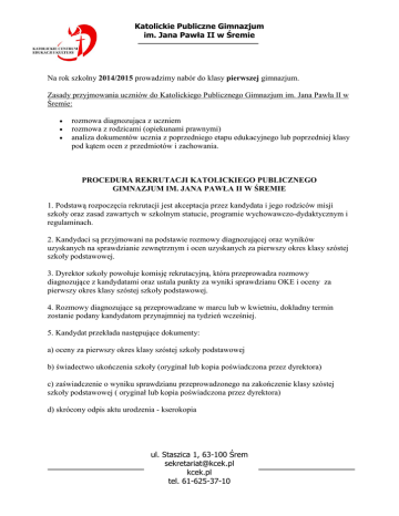 Katolickie Publiczne Gimnazjum im. Jana Pawła II w Śremie Na rok szkolny 2014/2015 prowadzimy nabór do klasy pierwszej gimnazjum. Zasady przyjmowania uczniów do Katolickiego Publicznego Gimnazjum im. Jana Pawła II w Śremie: rozmowa diagnozująca z uczniem rozmowa z rodzicami (opiekunami prawnymi) analiza dokumentów ucznia z poprzedniego etapu edukacyjnego lub poprzedniej klasy pod kątem ocen z przedmiotów i zachowania. PROCEDURA REKRUTACJI KATOLICKIEGO PUBLICZNEGO GIMNAZJUM IM. JANA PAWŁA II W ŚREMIE 1. Podstawą rozpoczęcia rekrutacji jest akceptacja przez kandydata i jego rodziców misji szkoły oraz zasad zawartych w szkolnym statucie, programie wychowawczo-dydaktycznym i regulaminach. 2. Kandydaci są przyjmowani na podstawie rozmowy diagnozującej oraz wyników uzyskanych na sprawdzianie zewnętrznym i ocen uzyskanych za pierwszy okres klasy szóstej szkoły podstawowej. 3. Dyrektor szkoły powołuje komisję rekrutacyjną, która przeprowadza rozmowy diagnozujące z kandydatami oraz ustala punkty za wyniki sprawdzianu OKE i oceny za pierwszy okres klasy szóstej szkoły podstawowej. 4. Rozmowy diagnozujące są przeprowadzane w marcu lub w kwietniu, dokładny termin zostanie podany kandydatom przynajmniej na tydzień wcześniej. 5. Kandydat przekłada następujące dokumenty: a) oceny za pierwszy okres klasy szóstej szkoły podstawowej b) świadectwo ukończenia szkoły (oryginał lub kopia poświadczona przez dyrektora) c) zaświadczenie o wyniku sprawdzianu przeprowadzonego na zakończenie klasy szóstej szkoły podstawowej ( oryginał lub kopia poświadczona przez dyrektora) d) skrócony odpis aktu urodzenia - kserokopia ul. Staszica 1, 63-100 Śrem [email protected] kcek.pl tel. 61-625-37-10 Katolickie Publiczne Gimnazjum im. Jana Pawła II w Śremie e) orzeczenie kwalifikacyjne poradni psychologiczno – pedagogicznej (dotyczy kandydatów z wadami słuchu, wzroku, koordynacji ruchu i innymi schorzeniami), f) zaświadczenie o osiągnięciach szkolnych lub artystycznych na szczeblu co najmniej powiatowym (jeśli dotyczy), g) zaświadczenie o uczestnictwie w pozaszkolnych konkursach na szczeblu co najmniej powiatowym (jeśli dotyczy), h) 3 zdjęcia legitymacyjne (podpisane na odwrocie). 6. Wniosek o przyjęcie do klasy pierwszej gimnazjum kandydaci składają od września roku poprzedzającego rozpoczęcie nauki. 7.Terminarz rekrutacji: l.p. Terminy Rodzaj zadania od 3 marca (poniedziałek) do 16 maja (piątek) składanie dokumentów (kwestionariusz osobowy) 1. 2. od 19 maja (poniedziałek) do 30 maja (piątek) rozmowy rekrutacyjne z kandydatami 3. 2 czerwca (poniedziałek) ogłoszenie wstępnej listy kandydatów 4. do 1 lipca (wtorek) złożenie świadectwa ukończenia szkoły podstawowej i zaświadczenia o wynikach sprawdzianu (oryginałów lub kserokopii poświadczonych za zgodność z oryginałem) 5. do 3 lipca (czwartek) ogłoszenie listy kandydatów zakwalifikowanych i listy kandydatów niezakwalifikowanych do szkoły 6. do 7 lipca (poniedziałek) ogłoszenie listy kandydatów przyjętych i listy kandydatów nieprzyjętych do szkoły 7. 7 dni od dnia podania do publicznej wiadomości listy kandydatów przyjętych i kandydatów nieprzyjętych do szkoły możliwość złożenia wniosku do komisji rekrutacyjnej o sporządzenie uzasadnienia odmowy przyjęcia kandydata do szkoły ul. Staszica 1, 63-100 Śrem [email protected] kcek.pl tel. 61-625-37-10 Katolickie Publiczne Gimnazjum im. Jana Pawła II w Śremie 8. 9. 10. do 5 dni od dnia złożenia wniosku o sporządzenie uzasadnienia odmowy przyjęcia przygotowanie i wydanie uzasadnienia odmowy przyjęcia do 7 dni od terminu otrzymania pisemnego uzasadnienia odmowy przyjęcia możliwość złożenia, do dyrektora odwołania od rozstrzygnięcia komisji rekrutacyjnej wyrażonego w pisemnym uzasadnieniu odmowy przyjęcia do 7 dni od dnia złożenia odwołania od rozstrzygnięcia komisji rekrutacyjnej rozstrzygnięcie przez dyrektora odwołania od rozstrzygnięcia komisji rekrutacyjnej wyrażonego w pisemnym uzasadnieniu odmowy przyjęcia 8. Do klasy pierwszej gimnazjum przyjmowani będą kandydaci, którzy: a) otrzymali największą ilość punktów podczas rekrutacji b) otrzymali w klasie szóstej szkoły podstawowej co najmniej dobrą ocenę z zachowania. 9. Kandydat otrzyma punkty rekrutacyjne, na które składają się następujące elementy: a) rozmowa diagnozująca (rozmowa z kandydatem i rodzicami), b) punkty przyznane za wyniki sprawdzianu zewnętrznego OKE c) punkty przyznane za oceny końcoworoczne z klasy szóstej szkoły podstawowej, a za ocenę z każdego przedmiotu kandydat może otrzymać odpowiednie punkty rekrutacyjne wg tabeli: Ocena/Zachowanie Punkty rekrutacyjne celująca/wz 10 bardzo dobra/bdb 8 dobra/db 6 dostateczna/dst 3 dopuszczająca/ndp 1 ul. Staszica 1, 63-100 Śrem [email protected] kcek.pl tel. 61-625-37-10 Katolickie Publiczne Gimnazjum im. Jana Pawła II w Śremie d) absolwentom Katolickiej Publicznej Szkoły Podstawowej im. Jana Pawła II w Śremie przyznaje się dodatkowe punkty w rozmowie diagnozującej. e) kandydatom, których rodzeństwo uczęszcza do naszej szkoły przyznaje się dodatkowe punkty w rozmowie diagnozującej. 10. Przy przyznawaniu punktów za rozmowę pod uwagę mogą być brane następujące elementy: motywacja wyboru szkoły, zainteresowania, ich rozwijanie i udział w konkursach, umiejętność prezentacji własnych opinii, ocena z zachowania, udział w życiu szkoły i innych organizacjach pozaszkolnych lub inne ustalone przez komisję rekrutacyjną na dany rok szkolny. 11. Ostateczną decyzję o przyjęciu ucznia do szkoły podejmuje Dyrektor po zapoznaniu się z wynikami postępowania kwalifikacyjnego. 12. Dyrektor może odstąpić od wykonania wybranych elementów niniejszej procedury. Szkoła jest bezpłatna O przyjęciu do szkoły decyduje Szkolna Komisja Rekrutacyjno - Kwalifikacyjna Wymagane dokumenty: podanie kwestionariusz osobowy 3 fotografie oceny za pi