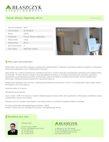 Poznań, Winiary, Piątkowska, 69 m2 Nr oferty: LW1153 Typ nieruchomości lokal Typ transakcji do wynajęcia Rynek wtórny Lokalizacja Poznań, Winiary, Piątkowska Rodzaj lokalu usługi Powierzchnia 69 m2 Ilość pomieszczeń 5 Cena najmu 3000 PLN / miesiąc Pełny opis nieruchomości Przedmiotem najmu jest lokal użytkowy o powierzchni użytkowej 69 m2, położony na pierwszym piętrze w budynku o charakterze rekreacyjno-usługowym przy ul. Piątkowskiej w Poznaniu. Lokal składa się z czterech pomieszczeń, otwartej przestrzeni w ramach której jest zaaranżowany sekretariat oraz małego aneksu kuchennego. W chwili obecnej w lokalu funkcjonuje gabinet kosmetyczny. W każdym pomieszczeniu umywalki, wentylacja, ogrzewanie oraz klimatyzacja wszystkich pomieszczeń, wejście do lokalu na zasadach bramy-rolety. Ścianki działowe typu karton-gips, możliwość aranżacji powierzchni wg potrzeb najemcy. Budynek jest ogrodzony oraz chroniony, parking przed budynkiem dla klientów w cenie 2 zł za jednorazowy wjazd. Jedno miejsce parkingowe w cenie dla najemcy. Lokal jest wolny od 1 lipca br. Wymagana kaucja zwrotna. Czynsz najmu: 3700 zł m/c łącznie z kosztami eksploatacyjnymi (woda, ścieki, prąd, ogrzewanie, klimatyzacja). Dodatkowo koszty za ewentualny Internet oraz telefon. Powyższy opis ma charakter informacyjny i nie stanowi oferty w rozumieniu przepisów Kodeksu Cywilnego. Nr licencji pośrednika odpowiedzialnego zawodowo: 10949 Kontakt: Tomasz Klim tel. 516-020-273 lub email: [email protected] Skontaktuj się z nami Tomasz Klim Numer licencji: 10949 e-mail: [email protected] tel: 516 020 273 tel: 61 852 68 66 fax: 61 852 52 51 ul. Młyńska 3, 61-729 Poznań tel. 61 852 68 66 | fax. 61 851 52 51 e-mail: [email protected] www.blaszczyk.com.pl