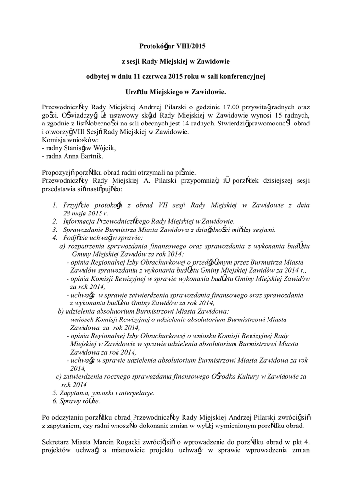 Protokół nr VIII/2015 z sesji Rady Miejskiej w Zawidowie odbytej w dniu 11 czerwca 2015 roku w sali konferencyjnej Urzędu Miejskiego w Zawidowie. Przewodniczący Rady Miejskiej Andrzej Pilarski o godzinie 17.00 przywitał radnych oraz gości. Oświadczył, że ustawowy skład Rady Miejskiej w Zawidowie wynosi 15 radnych, a zgodnie z listą obecności na sali obecnych jest 14 radnych. Stwierdził prawomocność obrad i otworzył VIII Sesję Rady Miejskiej w Zawidowie. Komisja wniosków: - radny Stanisław Wójcik, - radna Anna Bartnik. Propozycję porządku obrad radni otrzymali na piśmie. Przewodniczący Rady Miejskiej A. Pilarski przypomniał, iż porządek dzisiejszej sesji przedstawia się następująco: 1. Przyjęcie protokołu z obrad VII sesji Rady Miejskiej w Zawidowie z dnia 28 maja 2015 r. 2. Informacja Przewodniczącego Rady Miejskiej w Zawidowie. 3. Sprawozdanie Burmistrza Miasta Zawidowa z działalności między sesjami. 4. Podjęcie uchwał w sprawie: a) rozpatrzenia sprawozdania finansowego oraz sprawozdania z wykonania budżetu Gminy Miejskiej Zawidów za rok 2014: - opinia Regionalnej Izby Obrachunkowej o przedłożonym przez Burmistrza Miasta Zawidów sprawozdaniu z wykonania budżetu Gminy Miejskiej Zawidów za 2014 r., - opinia Komisji Rewizyjnej w sprawie wykonania budżetu Gminy Miejskiej Zawidów za rok 2014, - uchwała w sprawie zatwierdzenia sprawozdania finansowego oraz sprawozdania z wykonania budżetu Gminy Zawidów za rok 2014, b) udzielenia absolutorium Burmistrzowi Miasta Zawidowa: - wniosek Komisji Rewizyjnej o udzielenie absolutorium Burmistrzowi Miasta Zawidowa za rok 2014, - opinia Regionalnej Izby Obrachunkowej o wniosku Komisji Rewizyjnej Rady Miejskiej w Zawidowie w sprawie udzielenia absolutorium Burmistrzowi Miasta Zawidowa za rok 2014, - uchwała w sprawie udzielenia absolutorium Burmistrzowi Miasta Zawidowa za rok 2014, c) zatwierdzenia rocznego sprawozdania finansowego Ośrodka Kultury w Zawidowie za rok 2014 5. Zapytania, wnioski i interpelacje. 6. Sprawy różne. Po odczytaniu porządku obrad Przewodniczący Rady Miejskiej Andrzej Pilarski zwrócił się z zapytaniem, czy radni wnoszą o dokonanie zmian w wyżej wymienionym porządku obrad. Sekretarz Miasta Marcin Rogacki zwrócił się o wprowadzenie do porządku obrad w pkt 4. projektów uchwał, a mianowicie projektu uchwały w sprawie wprowadzenia zmian w budżecie miasta Zawidowa na rok 2015, projektu uchwały w sprawie wyrażenia zgody na sprzedaż nieruchomości dot. działki nr 915/25 oraz projektu uchwały w sprawie wyrażenia zgody na sprzedaż nieruchomości dot. działki nr 915/26. Wobec braku uwag Przewodniczący Rady A. Pilarski poddał ww. wniosek pod głosowanie. Rada Miejska w obecności 14 radnych, w głosowaniu:/ za -14, przeciw-0, wstrzymujących się - 0, przyjęła ww. wniosek. Wobec powyższego Przewodniczący Rady Miejskiej A. Pilarski przekazał, iż porządek dzisiejszej sesji przedstawia się następująco: 1. Przyjęcie protokołu z obrad VII sesji Rady Miejskiej w Zawidowie z dnia 28 maja 2015 r. 2. Informacja Przewodniczącego Rady Miejskiej w Zawidowie. 3. Sprawozdanie Burmistrza Miasta Zawidowa z działalności między sesjami. 4. Podjęcie uchwał w sprawie: a) rozpatrzenia sprawozdania finansowego oraz sprawozdania z wykonania budżetu Gminy Miejskiej Zawidów za rok 2014: - opinia Regionalnej Izby Obrachunkowej o przedłożonym przez Burmistrza Miasta Zawidów sprawozdaniu z wykonania budżetu Gminy Miejskiej Zawidów za 2014 r., - opinia Komisji Rewizyjnej w sprawie wykonania budżetu Gminy Miejskiej Zawidów za rok 2014, - uchwała w sprawie zatwierdzenia sprawozdania finansowego oraz sprawozdania z wykonania budżetu Gminy Zawidów za rok 2014, b) udzielenia absolutorium Burmistrzowi Miasta Zawidowa: - wniosek Komisji Rewizyjnej o udzielenie absolutorium Burmistrzowi Miasta Zawidowa za rok 2014, - opinia Regionalnej Izby Obrachunkowej o wniosku Komisji Rewizyjnej Rady Miejskiej w Zawidowie w sprawie udzielenia absolutorium Burmistrzowi Miasta Zawidowa za rok 2014, - uchwała w sprawie udzielenia absolutorium Burmistrzowi Miasta Zawidowa za rok 2014, c) zatwierdzenia rocznego sprawozdania finansowego Ośrodka Kultury w Zawidowie za rok 2014, d) wprowadzenia zmian w budżecie miasta Zawidowa na rok 2015, e) wyrażenia zgody na sprzedaż nieruchomości, f) wyrażenia zgody na sprzedaż nieruchomości. 5. Zapytania, wnioski i interpelacje. 6. Sprawy różne. 1. Przyjęcie protokołu z obrad VII sesji Rady Miejskiej w Zawidowie z dnia 28 maja 2015 r. Przewodniczący Rady A. Pilarski poprosił o wnoszenie uwag do protokołu z obrad VII sesji Rady Miejskiej z dnia 28 maja 2015 r. Wobec braku uwag do protokołu Przewodniczący A. Pilarski poddał pod głosowanie projekt protokołu z obrad VII z sesji Rady Miejskiej z dnia 28 maja 2015 r. Rada Miejska w obecności 14 radnych, wstrzymujących się-0, przyjęła ww. protokół. w głosowaniu:/ za-14, przeciw-0, 2. Informacja Przewodniczącego Rady Miejskiej w Zawidowie. Przewodniczący Rady A. Pilarski przekazał, iż dyżury są przez niego pełnione w pierwszą i ostatnia środę miesiąca, pozostałe dyżury pełni Wiceprzewodnicząca Rady Elżbieta Sontowska. Przewodniczący Rady A. Pilarski przywitał obecnego na sesji Prezesa Zrzeszenia Powiatowego Zespołów Sportowych Pana Franciszka Habra, oraz Zastępcę Dyrektora Zespołu Szkół w Zawidowie Pana Roberta Wochna na okoliczność wręczenia przez prezydium Rady Głównej Krajowego Zrzeszenia LZS Panu Robertowi Wochna odznaki zasłużonego działacza LZS. Pan Franciszek Haber wraz z Burmistrzem Miasta Zawidowie Panem Robertem Łężnym oraz Przewodniczącym Rady Miejskiej Panem Andrzejem Pilarskim wręczyli odznaczenie Zasłużenia Działacza LZS Panu Robertowi Wochna. Pan Robert Wochna podziękował za odznaczenie oraz za stworzenie przez władze miasta za doskonałej infrastruktury sportowej, dzięki której młodzież może aktywnie spędzać czas i roz