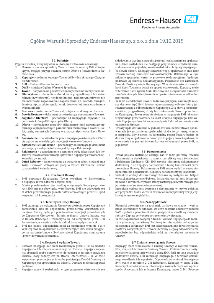 Ogólne Warunki Sprzedaży Endress+Hauser sp. z o.o. z dnia 19.10