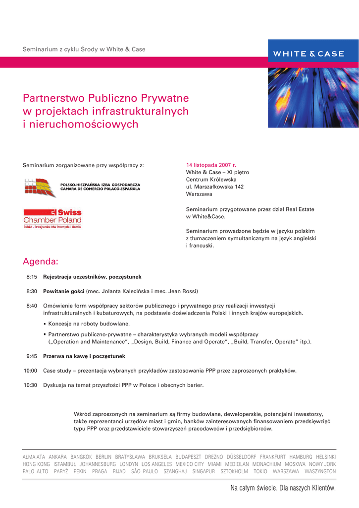 Seminarium z cyklu Środy w White & Case Partnerstwo Publiczno Prywatne w projektach infrastrukturalnych i nieruchomościowych Seminarium zorganizowane przy współpracy z: 14 listopada 2007 r. White & Case – XI pi´tro Centrum Królewska ul. Marsza∏kowska 142 Warszawa Seminarium przygotowane przez dział Real Estate w White&Case. Seminarium prowadzone b´dzie w j´zyku polskim z t∏umaczeniem symultanicznym na j´zyk angielski i francuski. Agenda: 8:15 Rejestracja uczestników, pocz´stunek 8:30 Powitanie goÊci (mec. Jolanta Kaleciƒska i mec. Jean Rossi) 8:40 Omówienie form wspó∏pracy sektorów publicznego i prywatnego przy realizacji inwestycji infrastrukturalnych i kubaturowych, na podstawie doÊwiadczenia Polski i innych krajów europejskich. Koncesje na roboty budowlane. Partnerstwo publiczno-prywatne – charakterystyka wybranych modeli wspó∏pracy („Operation and Maintenance”, „Design, Build, Finance and Operate”, „Build, Transfer, Operate” itp.). 9:45 Przerwa na kaw´ i pocz´stunek 10:00 Case study – prezentacja wybranych przyk∏adów zastosowania PPP przez zaproszonych praktyków. 10:30 Dyskusja na temat przysz∏oÊci PPP w Polsce i obecnych barier. WÊród zaproszonych na seminarium sà firmy budowlane, deweloperskie, potencjalni inwestorzy, tak˝e reprezentanci urz´dów miast i gmin, banków zainteresowanych finansowaniem przedsi´wzi´ç typu PPP oraz przedstawiciele stowarzyszeƒ pracodawców i przedsi´biorców. A¸MA ATA ANKARA BANGKOK BERLIN BRATYS¸AWA BRUKSELA BUDAPESZT DREZNO DÜSSELDORF FRANKFURT HAMBURG HELSINKI HONG KONG ISTAMBU¸ JOHANNESBURG LONDYN LOS ANGELES MEXICO CITY MIAMI MEDIOLAN MONACHIUM MOSKWA NOWY JORK PALO ALTO PARY˚ PEKIN PRAGA RIJAD SÃO PAULO SZANGHAJ SINGAPUR SZTOKHOLM TOKIO WARSZAWA WASZYNGTON Na ca∏ym Êwiecie. Dla naszych Klientów.