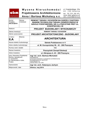 Numer Projektu: Nazwa inwestycji: PA 07/2014 Stadium: REMONT TARASU I SCHODÓW NA OGRÓD Z ZASTOSOWANIEM TECHNOLOGII TARASU ODWRÓCONEGO W SZKOLE PODSTAWOWEJ NR 4 w PSZCZYNIE PRZY UL. KONOPNICKIEJ 39 PROJEKT BUDOWLANY I WYKONAWCZY Zakres inwestycji: Zakres opracowania: nr tomu: REMONT TARASU I SCHODÓW PROJEKT ARCHITEKTONICZNO - BUDOWLANY Branża: II.A ARCHITEKTURA Nazwa obiektu budowlanego Szkoła Podstawowa nr 4 Adres obiektu budowlanego ul. M. Konopnickiej 39, 43 - 200 Pszczyna 114 Numery ewid. działek Nazwa Inwestora Pszczyński Zarząd Edukacji Adres inwestora ul. Zdrojowa 4, 43 - 200 Pszczyna Imię i Nazwisko Projektanta Branża, specjalność, nr uprawnień, Nr członkowski w Izbie, Podpis mgr inż. arch. Bartosz Michalski Opracowanie mgr inż. arch. Katarzyna Jachym Miejscowość, data Gliwice, maj 2014 (architektura) uprawnienia budowlane w specjalności architektonicznej do projektowanie bez ograniczeń 33/SLOKK/2011/II, członek ŚOIA nr SL-1530 1/II.A "Remont tarasu i schodów na ogród z zastosowaniem technologii tarasu odwróconego w szkole Podstawowej nr 4 w Pszczynie przy ul. M. Konopnickiej 39. " Stadium opracowania: projekt budowlany i wykonawczy TOM II.A - ARCHITEKTURA CZĘŚĆ OPISOWA Spis treści I.Informacje wstępne...................................................................................................................... 5 1.Przedmiot inwestycji................................................................................................................................... 5 2.Inwestor ....................................................................................................................................................... 5 3.Przedmiot opracowania............................................................................................................................... 5 4.Zakres opracowania.................................................................................................................................... 5 5.Cel opracowania.......................................................................................................................................... 5 6.Podstawa formalna opracowania .............................................................................................................. 5 6.1.Umowa z Inwestorem............................................................................................................................ 5 6.2.Wytyczne, uzgodnienia i ustalenia z Inwestorem...................................................................................5 6.3.Wizja lokalna w terenie oraz wykonany na miejscu materiał dokumentacyjno – fotograficzny...............5 7.Podstawa prawna opracowania.................................................................................................................. 5 7.1.Ustawa z dnia 4 lipca 1994 Prawo Budowlane (Dz.U. Nr 89, poz 414) z poźn. Zmianami....................5 7.2.Rozporządzenie Ministra Infrastruktury z dnia 12 kwietnia 2002 w sprawie warunków technicznych jakim powinny odpowiadać budynki i ich usytuowanie (Dz.U. Nr 75, poz. 690) z poźn. zmianami..............5 7.3.Rozporządzenie Ministra Transportu, Budownictwa i Gospodarki Morskiej w sprawie szczegółowego zakresu i formy projektu budowlanego z dnia 25 kwietnie 2012 r. (Dz.U. z 2012 r. poz. 462).....................5 7.4.Inne wiążące przepisy prawa oraz normy obowiązujące w zakresie którego dotyczy niniejsza dokumentacja.............................................................................................................................................. 5 8.Zastrzeżenie................................................................................................................................................. 6 II.Opis techniczny zagospodarowania terenu..............................................................................7 1.Istniejące zagospodarowanie działki nr 114..............................................................................................7 2.Uwarunkowania planistyczne..................................................................................................................... 7 2.Demontaże i rozbiórki.................................................................................................................................. 7 3.Projektowane zagospodarowanie terenu.................................................................................................. 7 4.Zagadnienia dotyczące ochrony konserwatorskiej..................................................................................7 5.Zagadnienia wpływu eksploatacji górniczej na teren...............................................................................7 6.Zagadnienia ochrony środowiska naturalnego.........................................................................................7 7.Ochrona interesu osób trzecich................................................................................................................. 7 III.Opis techniczny budynku.......................................................................................................... 8 1.Dane charakterystyczne obiektu i tarasu ..........................................................................................8 2.Opis stanu istniejącego............................................................................................................................... 8 3.Ocena stanu technicznego tarasu.............................................................................................................. 8 4.Funkcja obiektu........................................................................................................................................... 8 5.Forma architektoniczna, sposób dostosowania do krajobrazu i otaczającej zabudowy, dostosowanie do ustaleń miejscowego planu zagospodarowania przestrzennego.................................8 6.Proj