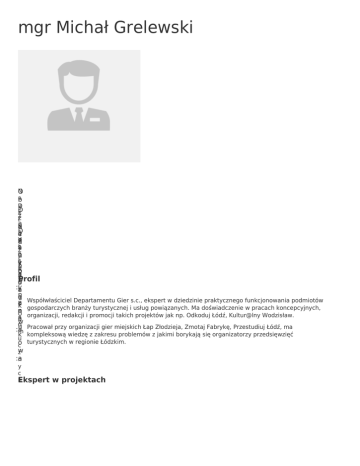 mgr Michał Grelewski N O a b u D sD k zz zi a siN e D re p d a y n zo u d a iłs k z e in cu ic a o y k n zn p o a n a lProfil w e n ru :iy zk a n e ą u Współwłaściciel Departamentu Gier s.c., ekspert w dziedzinie praktycznego funkcjonowania podmiotów a k d k gospodarczych branży turystycznej i usług powiązanych. Ma doświadczenie w pracach koncepcyjnych, zo n o organizacji, redakcji i promocji takich projektów jak np. Odkoduj Łódź, Kultur@lny Wodzisław. n a a w o Pracował przy organizacji gier miejskich Łap Złodzieja, Zmotaj Fabrykę, Przestudiuj Łódź, ma n :u a im k kompleksową wiedzę z zakresu problemów z jakimi borykają się organizatorzy przedsięwzięć i u turystycznych w regionie Łódzkim. o c w z :a n y c h Ekspert w projektach Turyzm dla Regionu – Zintegrowan y Program Rozwoju Doktorantó w Strona CBI Pro-Akademia używa ciasteczek (cookies), dzięki którym nasz serwis może działać lepiej. Zobacz