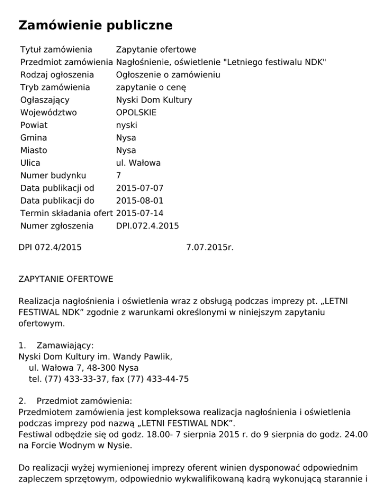 Zamówienie publiczne - nyski dom kultury im. wandy pawlik