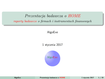 Prezentacja badawcza o HOME raporty badawcze o firmach i instrumentach finansowych AlgoExe 1 stycznia 2017 AlgoExe AlgoExe Prezentacja badawcza o HOME 1 stycznia 2017 1 / 19 Prezentujemy badania o HOME. Prezentacja zawiera prognozy dla HOME. Słowa kluczowe: raporty badawcze, firmy, akcje, forex, analityka predykcyjna, uczenie maszynowe, eksploracja danych, big data. AlgoExe AlgoExe Prezentacja badawcza o HOME 1 stycznia 2017 2 / 19 1 Wstęp 2 Predykcja Dniowa Miesina Kwartalna Roczna AlgoExe AlgoExe Prezentacja badawcza o HOME 1 stycznia 2017 3 / 19 Wstęp symbol: HOME nazwa: AT HOME GROUP giełda: US ostatnia cena (2016–12–30): 14.63 cena minimalna z ostatnich 5 dni: 14.5 cena maksymalna z ostatnich 5 dni: 15.08 AlgoExe AlgoExe Prezentacja badawcza o HOME 1 stycznia 2017 4 / 19 Ceny akcji Przewidywana cena akcji dla 2016–12–30: 14.69. y 15 11 2016/10 x 2016/12 Rysunek 1 : Dniowe ceny akcji dla HOME jako przewidywana funkcja czasu. Punkty reprezentują historyczne dniowe ceny akcji. AlgoExe AlgoExe Prezentacja badawcza o HOME 1 stycznia 2017 5 / 19 Ceny akcji Przewidywana cena akcji dla 2017–01: 12.97. y 16 8 2011/07 x 2016/12 Rysunek 2 : Miesine ceny akcji dla HOME jako przewidywana funkcja czasu. Punkty reprezentują historyczne miesine ceny akcji. AlgoExe AlgoExe Prezentacja badawcza o HOME 1 stycznia 2017 6 / 19 Rozkład wolumenu po cenie 10-kwantyle: 1 to 10.87, 2 to 11.25, 8 to 14.14, 9 to 14.49. 0.9 y y 1.0 0.0 11 x 15 (a) 11 x 15 (b) Rysunek 3 : Przewidywany miesiny rozkład prawdopodobieństwa dniowego wolumenu po cenie dla HOME. (a) Przewidywana dystrybuanta oraz punkty reprezentujące dane. (b) Przewidywana funkcja gęstości prawdopodobieństwa AlgoExe Prezentacja badawcza o HOME 1 stycznia 2017 AlgoExe 7 / 19 Rozkład zmiany ceny 10-kwantyle: 8 to 3.20%, 9 to 3.76%. 2.0 y y 0.9 0.0 0.0 0 x 6 (a) 0 x 6 (b) Rysunek 4 : Przewidywany miesiny rozkład prawdopodobieństwa dniowych zmian cen dla HOME. (a) Przewidywana dystrybuanta oraz punkty reprezentujące dane. (b) Przewidywana funkcja gęstości prawdopodobieństwa AlgoExe Prezentacja badawcza o HOME 1 stycznia 2017 AlgoExe 8 / 19 Wartość księgowa na akcję Przewidywana wartość księgowa na akcję dla 2017–1st quarter: 9.42. y 8 6 2015/08 x 2016/10 Rysunek 5 : Kwartalna wartość księgowa na akcję dla HOME jako przewidywana funkcja czasu. Punkty reprezentują historyczną kwartaln wartość księgową na akcję. AlgoExe AlgoExe Prezentacja badawcza o HOME 1 stycznia 2017 9 / 19 Dywidenda na akcję Przewidywana dywidenda na akcję dla 2014–1st quarter: 0.06. y 0.2 0.1 2012/08 x 2014/02 Rysunek 6 : Kwartalna dywidenda na akcję dla HOME jako przewidywana funkcja czasu. Punkty reprezentują historyczną kwartaln dywidendę na akcję. AlgoExe AlgoExe Prezentacja badawcza o HOME 1 stycznia 2017 10 / 19 Dochód Przewidywany dochód dla 2017–1st quarter: -0.00. y 0 -0 2015/08 x 2016/10 Rysunek 7 : Kwartalny dochód dla HOME jako przewidywana funkcja czasu. Punkty reprezentują historyczny kwartalny dochód. AlgoExe AlgoExe Prezentacja badawcza o HOME 1 stycznia 2017 11 / 19 Przychód Przewidywany przychód dla 2017–1st quarter: 0.00. y 0 0 2015/08 x 2016/10 Rysunek 8 : Kwartalny przychód dla HOME jako przewidywana funkcja czasu. Punkty reprezentują historyczny kwartalny przychód. AlgoExe AlgoExe Prezentacja badawcza o HOME 1 stycznia 2017 12 / 19 Ceny akcji Przewidywana cena akcji dla 2017: 14.78. y 14 9 2005 x 2016 Rysunek 9 : Roczne ceny akcji dla HOME jako przewidywana funkcja czasu. Punkty reprezentują historyczne roczne ceny akcji. AlgoExe AlgoExe Prezentacja badawcza o HOME 1 stycznia 2017 13 / 19 Wartość księgowa na akcję Przewidywana wartość księgowa na akcję dla 2016: 7.54. y 7 6 2015 x 2016 Rysunek 10 : Roczna wartość księgowa na akcję dla HOME jako przewidywana funkcja czasu. Punkty reprezentują historyczną roczn wartość księgową na akcję. AlgoExe AlgoExe Prezentacja badawcza o HOME 1 stycznia 2017 14 / 19 Dywidenda na akcję Przewidywana dywidenda na akcję dla 2014: 0.06. y 0.08 0.05 2008 x 2014 Rysunek 11 : Roczna dywidenda na akcję dla HOME jako przewidywana funkcja czasu. Punkty reprezentują historyczną roczn dywidendę na akcję. AlgoExe AlgoExe Prezentacja badawcza o HOME 1 stycznia 2017 15 / 19 Dochód Przewidywany dochód dla 2016: -0.00. y 0 -0 2015 x 2016 Rysunek 12 : Roczny dochód dla HOME jako przewidywana funkcja czasu. Punkty reprezentują historyczny roczny dochód. AlgoExe AlgoExe Prezentacja badawcza o HOME 1 stycznia 2017 16 / 19 Przychód Przewidywany przychód dla 2016: 0.00. y 0 0 2015 x 2016 Rysunek 13 : Roczny przychód dla HOME jako przewidywana funkcja czasu. Punkty reprezentują historyczny roczny przychód. AlgoExe AlgoExe Prezentacja badawcza o HOME 1 stycznia 2017 17 / 19 Rozkład wolumenu po cenie 10-kwantyle: 1 to 11.99, 2 to 12.58, 8 to 15.50, 9 to 15.79. 0.9 y y 2.0 0.0 0.0 11 x 16 (a) 11 x 16 (b) Rysunek 14 : Przewidywany roczny rozkład prawdopodobieństwa dniowego wolumenu po cenie dla HOME. (a) Przewidywana dystrybuanta oraz punkty reprezentujące dane. (b) Przewidywana funkcja gęstości prawdopodobieństwa AlgoExe Prezentacja badawcza o HOME 1 stycznia 2017 AlgoExe 18 / 19 Rozkład zmiany ceny 10-kwantyle: 8 to 2.36%, 9 to 3.37%. 0.9 y y 3.0 0.0 0.0 0 x 16 (a) 0 x 16 (b) Rysunek 15 : Przewidywany roczny rozkład prawdopodobieństwa dniowych zmian cen dla HOME. (a) Przewidywana dystrybuanta oraz punkty reprezentujące dane. (b) Przewidywana funkcja gęstości prawdopodobieństwa AlgoExe Prezentacja badawcza o HOME 1 stycznia 2017 AlgoExe 19 / 19