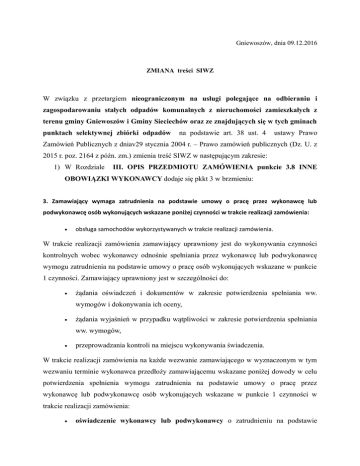 Gniewoszów, dnia 09.12.2016 ZMIANA treści SIWZ W związku z przetargiem nieograniczonym na usługi polegające na odbieraniu i zagospodarowaniu stałych odpadów komunalnych z nieruchomości zamieszkałych z terenu gminy Gniewoszów i Gminy Sieciechów oraz ze znajdujących się w tych gminach punktach selektywnej zbiórki odpadów na podstawie art. 38 ust. 4 ustawy Prawo Zamówień Publicznych z dniav29 stycznia 2004 r. – Prawo zamówień publicznych (Dz. U. z 2015 r. poz. 2164 z późn. zm.) zmienia treść SIWZ w następującym zakresie: 1) W Rozdziale III. OPIS PRZEDMIOTU ZAMÓWIENIA punkcie 3.8 INNE OBOWIĄZKI WYKONAWCY dodaje się pkkt 3 w brzmieniu: 3. Zamawiający wymaga zatrudnienia na podstawie umowy o pracę przez wykonawcę lub podwykonawcę osób wykonujących wskazane poniżej czynności w trakcie realizacji zamówienia: obsługa samochodów wykorzystywanych w trakcie realizacji zamówienia. W trakcie realizacji zamówienia zamawiający uprawniony jest do wykonywania czynności kontrolnych wobec wykonawcy odnośnie spełniania przez wykonawcę lub podwykonawcę wymogu zatrudnienia na podstawie umowy o pracę osób wykonujących wskazane w punkcie 1 czynności. Zamawiający uprawniony jest w szczególności do: żądania oświadczeń i dokumentów w zakresie potwierdzenia spełniania ww. wymogów i dokonywania ich oceny, żądania wyjaśnień w przypadku wątpliwości w zakresie potwierdzenia spełniania ww. wymogów, przeprowadzania kontroli na miejscu wykonywania świadczenia. W trakcie realizacji zamówienia na każde wezwanie zamawiającego w wyznaczonym w tym wezwaniu terminie wykonawca przedłoży zamawiającemu wskazane poniżej dowody w celu potwierdzenia spełnienia wymogu zatrudnienia na podstawie umowy o pracę przez wykonawcę lub podwykonawcę osób wykonujących wskazane w punkcie 1 czynności w trakcie realizacji zamówienia: oświadczenie wykonawcy lub podwykonawcy o zatrudnieniu na podstawie umowy o pracę osób wykonujących czynności, których dotyczy wezwanie zamawiającego. Oświadczenie to powinno zawierać w szczególności: dokładne określenie podmiotu składającego oświadczenie, datę złożenia oświadczenia, wskazanie, że objęte wezwaniem czynności wykonują osoby zatrudnione na podstawie umowy o pracę wraz ze wskazaniem liczby tych osób, rodzaju umowy o pracę i wymiaru etatu oraz podpis osoby uprawnionej do złożenia oświadczenia w imieniu wykonawcy lub podwykonawcy; poświadczoną za zgodność z oryginałem odpowiednio przez wykonawcę lub podwykonawcę kopię umowy/umów o pracę osób wykonujących w trakcie realizacji zamówienia czynności, których dotyczy ww. oświadczenie wykonawcy lub podwykonawcy (wraz z dokumentem regulującym zakres obowiązków, jeżeli został sporządzony). Kopia umowy/umów powinna zostać zanonimizowana w sposób zapewniający ochronę danych osobowych pracowników, zgodnie z przepisami ustawy z dnia 29 sierpnia 1997 r. o ochronie danych osobowych (tj. w szczególności1 bez imion, nazwisk, adresów, nr PESEL pracowników). Informacje takie jak: data zawarcia umowy, rodzaj umowy o pracę i wymiar etatu powinny być możliwe do zidentyfikowania; zaświadczenie właściwego oddziału ZUS, potwierdzające opłacanie przez wykonawcę lub podwykonawcę składek na ubezpieczenia społeczne i zdrowotne z tytułu zatrudnienia na podstawie umów o pracę za ostatni okres rozliczeniowy; poświadczoną za zgodność z oryginałem odpowiednio przez wykonawcę lub podwykonawcę kopię dowodu potwierdzającego zgłoszenie pracownika przez pracodawcę do ubezpieczeń, zanonimizowaną w sposób zapewniający ochronę danych osobowych pracowników, zgodnie z przepisami ustawy z dnia 29 sierpnia 1997 r. o ochronie danych osobowych. Z tytułu niespełnienia przez wykonawcę lub podwykonawcę wymogu zatrudnienia na podstawie umowy o pracę osób wykonujących wskazane w punkcie 1 czynności zamawiający przewiduje sankcję w postaci obowiązku zapłaty przez wykonawcę kary umownej w wysokości określonej w istotnych postanowieniach umowy w sprawie zamówienia publicznego. Niezłożenie przez wykonawcę w 1 Wyliczenie ma charakter przykładowy. Umowa o pracę może zawierać również inne dane, które podlegają anonimizacji. Każda umowa powinna zostać przeanalizowana przez składającego pod kątem przepisów ustawy z dnia 29 sierpnia 1997 r. o ochronie danych osobowych; zakres anonimizacji umowy musi być zgodny z przepisami ww. ustawy. wyznaczonym przez zamawiającego terminie żądanych przez zamawiającego dowodów w celu potwierdzenia spełnienia przez wykonawcę lub podwykonawcę wymogu zatrudnienia na podstawie umowy o pracę traktowane będzie jako niespełnienie przez wykonawcę lub podwykonawcę wymogu zatrudnienia na podstawie umowy o pracę osób wykonujących wskazane przez Zamawiającego czynności. W przypadku uzasadnionych wątpliwości co do przestrzegania prawa pracy przez wykonawcę lub podwykonawcę, zamawiający może zwrócić się o przeprowadzenie kontroli przez Państwową Inspekcję Pracy. 2) W UMOWIE STANOWIĄCEJ W ZAŁACZNIK Nr 2 do SIWZ: a) W § 4 dodaje się ust. 6 w brzmieniu: 6. Zamawiający wymaga zatrudnienia na podstawie umowy o pracę przez wykonawcę lub podwykonawcę osób wykonujących wskazane poniżej czynności w trakcie realizacji zamówienia: obsługa samochodów wykorzystywanych w trakcie realizacji zamówienia. W trakcie realizacji zamówienia zamawiający uprawniony jest do wykonywania czynności kontrolnych wobec wykonawcy odnośnie spełniania przez wykonawcę lub podwykonawcę wymogu zatrudnienia na podstawie umowy o pracę osób wykonujących wskazane w punkcie 1 czynności. Zamawiający uprawniony jest w szczególności do: żądania oświadczeń i dokumentów w zakresie potwierdzenia spełniania ww. wymogów i dokonywania ich oceny, żądania wyjaśnień w przypadku wątpliwości w zakresie potwierdzenia spełniania ww. wymogów, przeprowadzania kontroli na m