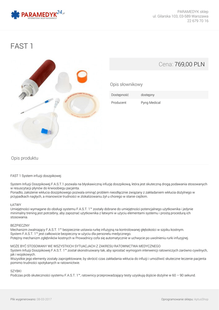 PARAMEDYK sklep ul. Gilarska 103, 03-589 Warszawa 22 679 70 16 FAST 1 Cena: 769,00 PLN Opis słownikowy Dostępność dostępny Producent Pyng Medical Opis produktu FAST 1 System infuzji doszpikowej System Infuzji Doszpikowej F.A.S.T.1 pozwala na błyskawiczną infuzję doszpikową, która jest skuteczną drogą podawania stosowanych w resuscytacji płynów do krwioobiegu pacjenta. Ponadto, założenie wkłucia doszpikowego pozwala ominąć problem nieodłącznie związany z zakładaniem wkłucia dożylnego w przypadkach nagłych, a mianowicie trudności w zlokalizowaniu żył u chorego w stanie ciężkim. ŁATWY Umiejętności wymagane do obsługi systemu F.A.S.T. 1™ zostały dobrane do umiejętności potencjalnego użytkownika i jedynie minimalny trening jest potrzebny, aby zapoznać użytkownika z łatwymi w użyciu elementami systemu i prostą procedurą ich stosowania. BEZPIECZNY Mechanizm zwalniający F.A.S.T. 1™ bezpiecznie ustawia rurkę infuzyjną na kontrolowanej głębokości w szpiku kostnym. System F.A.S.T. 1™ jest całkowicie bezpieczny w użyciu dla personelu medycznego. Potężny mechanizm zgłębników kostnych w Prowadnicy cofa się automatycznie w uchwycie po uwolnieniu rurki infuzyjnej. MOŻE BYĆ STOSOWANY WE WSZYSTKICH SYTUACJACH Z ZAKRESU RATOWNICTWA MEDYCZNEGO System Infuzji Doszpikowej F.A.S.T. 1™ został skonstruowany tak, aby sprostać wymogom interwencji ratowniczych zarówno cywilnych, jak i wojskowych. Wszystkie jego elementy zostały zaprojektowane, by skrócić czas zakładania wkłucia do infuzji i umożliwić skuteczne leczenie pacjenta pomimo trudności spotykanych w ratownictwie. SZYBKI Podczas prób skuteczności systemu F.A.S.T. 1™, ratownicy przeprowadzający testy uzyskują dojście dożylne w 60 – 90 sekund. Plik wygenerowano: 08-03-2017 Oprogramowanie sklepu: AptusShop PARAMEDYK sklep ul. Gilarska 103, 03-589 Warszawa 22 679 70 16 W doniesieniach z piśmiennictwa, użytkownicy – lekarze i ratownicy medyczni wskazują, że dojście dożylne można uzyskać w czasie krótszym niż około 90 sekund. Z kolei liczne udokumentowane badania wskazują, że założenie wkłucia dożylnego w warunkach pozaszpitalnych zajmuje zwykle od 90 sekund do 10 minut, a może potrwać znacznie dłużej. SKUTECZNY Infuzja doszpikowa, która stanowi zasadę działania systemu F.A.S.T. 1™, jest skuteczną drogą podawania stosowanych w resuscytacji płynów do krwioobiegu pacjenta. Ponadto, założenie wkłucia doszpikowego pozwala ominąć problem nieodłącznie związany z zakładaniem wkłucia dożylnego w przypadkach nagłych, a mianowicie trudności w zlokalizowaniu żył u chorego w stanie ciężkim. LECZENIE PŁYNAMI W RESUSCYTACJI System Infuzji Doszpikowej F.A.S.T. 1™ może być stosowany do podania dostatecznej objętości płynów, aby przeciwdziałać rozwojowi wstrząsu krwotocznego. Zwykła szybkość przepływu dla soli fizjologicznej wynosi 30 ml / min przy wlewie grawitacyjnym oraz 125 ml / min przy użyciu mankietu do wlewów ciśnieniowych. Rezultatem naszego zaangażowania w stworzenie skutecznego systemu infuzji doszpikowej jest opracowanie F.A.S.T. 1™. System ten sprawdził się jako szybki, skuteczny, łatwy w zastosowaniu i bezpieczny w użyciu zarówno w warunkach ratownictwa w nagłych przypadkach poza szpitalem, jak i w szpitalu. Galeria Plik wygenerowano: 08-03-2017 Powered by TCPDF (www.tcpdf.org) Oprogramowanie sklepu: AptusShop