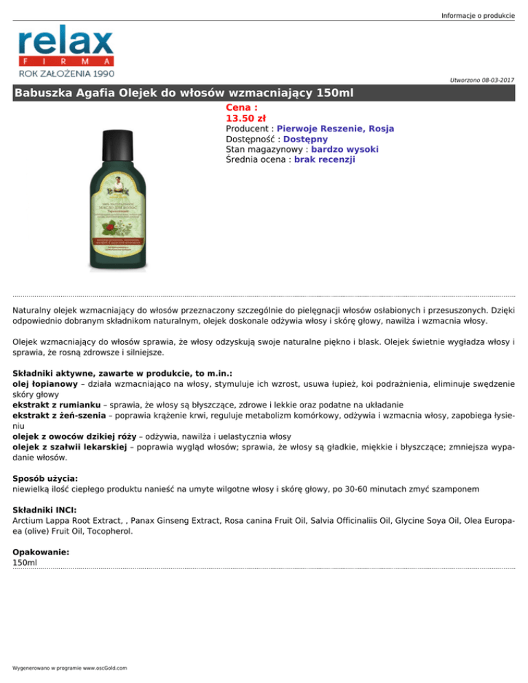 Informacje o produkcie Utworzono 08-03-2017 Babuszka Agafia Olejek do włosów wzmacniający 150ml Cena : 13.50 zł Producent : Pierwoje Reszenie, Rosja Dostępność : Dostępny Stan magazynowy : bardzo wysoki Średnia ocena : brak recenzji Naturalny olejek wzmacniający do włosów przeznaczony szczególnie do pielęgnacji włosów osłabionych i przesuszonych. Dzięki odpowiednio dobranym składnikom naturalnym, olejek doskonale odżywia włosy i skórę głowy, nawilża i wzmacnia włosy. Olejek wzmacniający do włosów sprawia, że włosy odzyskują swoje naturalne piękno i blask. Olejek świetnie wygładza włosy i sprawia, że rosną zdrowsze i silniejsze. Składniki aktywne, zawarte w produkcie, to m.in.: olej łopianowy – działa wzmacniająco na włosy, stymuluje ich wzrost, usuwa łupież, koi podrażnienia, eliminuje swędzenie skóry głowy ekstrakt z rumianku – sprawia, że włosy są błyszczące, zdrowe i lekkie oraz podatne na układanie ekstrakt z żeń-szenia – poprawia krążenie krwi, reguluje metabolizm komórkowy, odżywia i wzmacnia włosy, zapobiega łysieniu olejek z owoców dzikiej róży – odżywia, nawilża i uelastycznia włosy olejek z szałwii lekarskiej – poprawia wygląd włosów; sprawia, że włosy są gładkie, miękkie i błyszczące; zmniejsza wypadanie włosów. Sposób użycia: niewielką ilość ciepłego produktu nanieść na umyte wilgotne włosy i skórę głowy, po 30-60 minutach zmyć szamponem Składniki INCI: Arctium Lappa Root Extract, , Panax Ginseng Extract, Rosa canina Fruit Oil, Salvia Officinaliis Oil, Glycine Soya Oil, Olea Europaea (olive) Fruit Oil, Tocopherol. Opakowanie: 150ml Wygenerowano w programie www.oscGold.com