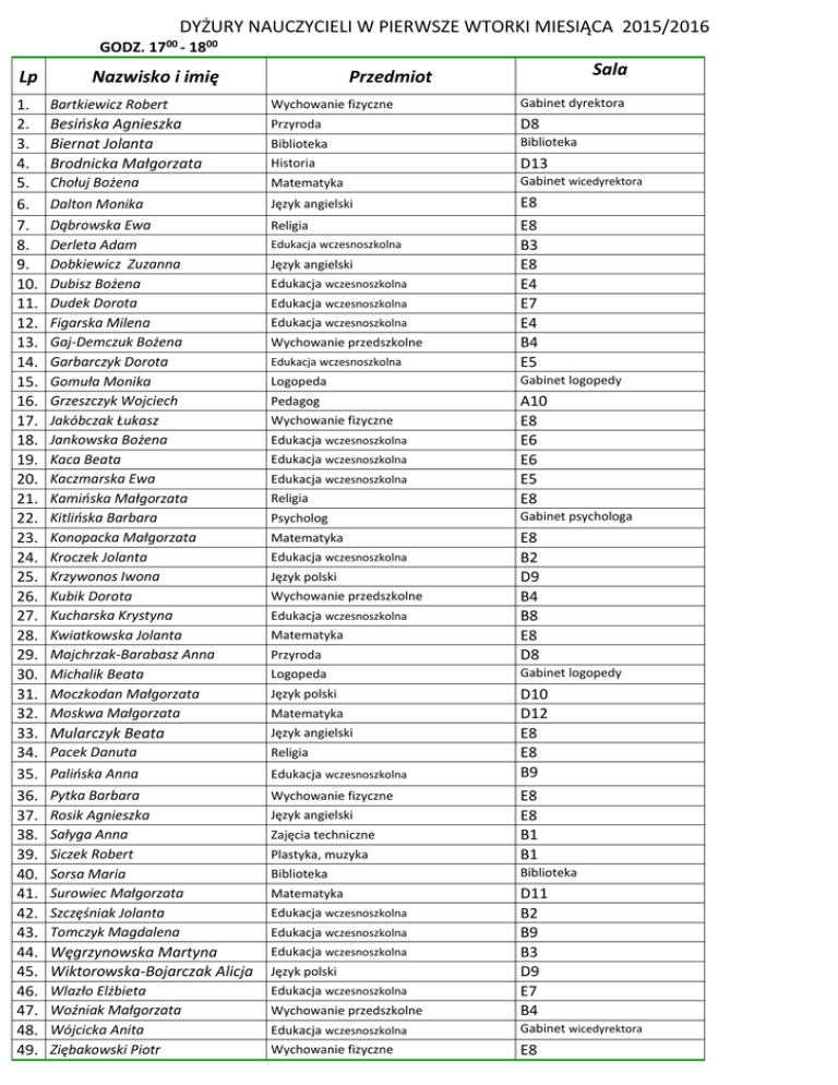 DYŻURY NAUCZYCIELI W PIERWSZE WTORKI MIESIĄCA 2015