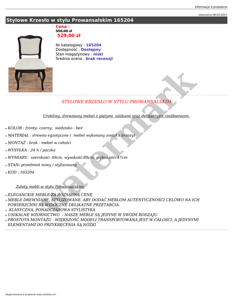 Informacje o produkcie Utworzono 08-03-2017 Stylowe Krzesło w stylu Prowansalskim 165204 Cena : 550,00 zł 529,00 zł er m ar k Nr katalogowy : 165204 Dostępność : Dostępny Stan magazynowy : niski Średnia ocena : brak recenzji STYLOWE KRZESŁO W STYLU PROWANSALSKIM Urokliwy, drewniany mebel z giętymi nóżkami oraz delikatnymi rzeźbieniami. KOLOR : fronty- czarny, siedzisko - beż ● MATERIAŁ : drewno egzotyczne ( mebel wykonany został z brzozy) ● MONTAŻ : brak - mebel w całości ● WYSYŁKA : 24 h / paczka ● WYMIARY: szerokość: 49cm, wysokość:89cm, głębokość: 47cm ● STAN: przedmiot nowy / stylizowany ● KOD : 165204 at ● Zalety mebli w stylu Prowansalskim: ● ● ● ● ELEGANCKIE MEBLE ZA ROZSĄDNĄ CENĘ MEBLE DREWNIANE, STYLIZOWANE. ABY DODAĆ MEBLOM AUTENTYCZNOŚCI CELOWO NA ICH POWIERZCHNI SĄ WIDOCZNE DELIKATNE PRZETARCIA. KLASYCZNA, PONADCZASOWA STYLISTYKA UNIKALNE WZORNICTWO - NASZE MEBLE SĄ JEDYNE W SWOIM RODZAJU. PROSTOTA MONTAŻU - WIĘKSZOŚĆ MODELI TRANSPORTOWANA JEST W CAŁOŚCI, A JEDYNYMI ELEMENTAMI DO PRZYKRĘCENIA SĄ NÓŻKI w ● Wygenerowano w programie www.oscGold.com