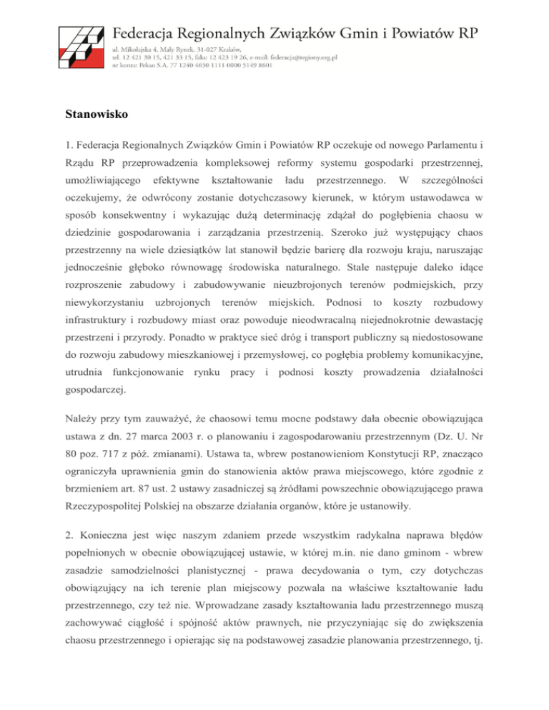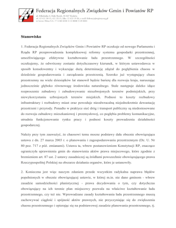 Stanowisko 1. Federacja Regionalnych Związków Gmin i Powiatów RP oczekuje od nowego Parlamentu i Rządu RP przeprowadzenia kompleksowej reformy systemu gospodarki przestrzennej, umożliwiającego efektywne kształtowanie ładu przestrzennego. W szczególności oczekujemy, że odwrócony zostanie dotychczasowy kierunek, w którym ustawodawca w sposób konsekwentny i wykazując dużą determinację zdążał do pogłębienia chaosu w dziedzinie gospodarowania i zarządzania przestrzenią. Szeroko już występujący chaos przestrzenny na wiele dziesiątków lat stanowił będzie barierę dla rozwoju kraju, naruszając jednocześnie głęboko równowagę środowiska naturalnego. Stale następuje daleko idące rozproszenie zabudowy i zabudowywanie nieuzbrojonych terenów podmiejskich, przy niewykorzystaniu uzbrojonych terenów miejskich. Podnosi to koszty rozbudowy infrastruktury i rozbudowy miast oraz powoduje nieodwracalną niejednokrotnie dewastację przestrzeni i przyrody. Ponadto w praktyce sieć dróg i transport publiczny są niedostosowane do rozwoju zabudowy mieszkaniowej i przemysłowej, co pogłębia problemy komunikacyjne, utrudnia funkcjonowanie rynku pracy i podnosi koszty prowadzenia działalności gospodarczej. Należy przy tym zauważyć, że chaosowi temu mocne podstawy dała obecnie obowiązująca ustawa z dn. 27 marca 2003 r. o planowaniu i zagospodarowaniu przestrzennym (Dz. U. Nr 80 poz. 717 z póź. zmianami). Ustawa ta, wbrew postanowieniom Konstytucji RP, znacząco ograniczyła uprawnienia gmin do stanowienia aktów prawa miejscowego, które zgodnie z brzmieniem art. 87 ust. 2 ustawy zasadniczej są źródłami powszechnie obowiązującego prawa Rzeczypospolitej Polskiej na obszarze działania organów, które je ustanowiły. 2. Konieczna jest więc naszym zdaniem przede wszystkim radykalna naprawa błędów popełnionych w obecnie obowiązującej ustawie, w której m.in. nie dano gminom - wbrew zasadzie samodzielności planistycznej - prawa decydowania o tym, czy dotychczas obowiązujący na ich terenie plan miejscowy pozwala na właściwe kształtowanie ładu przestrzennego, czy też nie. Wprowadzane zasady kształtowania ładu przestrzennego muszą zachowywać ciągłość i spójność aktów prawnych, nie przyczyniając się do zwiększenia chaosu przestrzennego i opierając się na podstawowej zasadzie planowania przestrzennego, tj. zasadzie zrównoważonego rozwoju. Ważne jest przy tym, aby zmiany wprowadzały nową jakość myślenia o przestrzeni, a nie skupiały się jedynie na kolejnym regulowaniu procedur. Właściwe gospodarowanie przestrzenią wymaga jednocześnie nie tylko wprowadzenia rozwiązań w dziedzinie planowania przestrzennego, ale również uporządkowania całego systemu prawa materialnego, warunkującego planowanie przestrzenne i realizację procesu inwestycyjnego. Poniżej zamieszczamy propozycje rozwiązań w zakresie przepisów obowiązujących, w tym ustawy o planowaniu i zagospodarowaniu przestrzennym z dnia 27 marca 2003 r., w kierunku których powinny zdążać prace nowego Parlamentu i Rządu RP. Przedstawione poniżej propozycje zmian przepisów mają na celu między innymi: 1) Usprawnienie procesu uchwalania planów miejscowych poprzez: a) przywrócenie przepisu "o spójności planu ze studium" z poprzednio obowiązującej ustawy z dn. 7 lipca 1994 r. o zagospodarowaniu przestrzennym, zamiast obecnego przepisu mówiącego "o zgodności planu ze studium"; b) przywrócenie procedury sporządzania "studium", obowiązującej w ustawie o zagospodarowaniu przestrzennym z 1994 r.; c) umożliwienie gminom (w przypadku konieczności powtórnego wyłożenia projektu planu do publicznego wglądu) wyłożenia planu tylko w tym zakresie, w którym nastąpiły zmiany. 2) Odblokowanie terenów inwestycyjnych dla obszarów objętych obowiązkiem sporządzania planu dla terenu górniczego poprzez: a) wprowadzenie odpowiednich zmian w ustawie Prawo geologiczne i górnicze (nowelizacji wymaga art. 53 ustawy); b) wprowadzenie odpowiednich zmian w ustawie o planowaniu i zagospodarowaniu przestrzennym. 3) Umożliwienie gminom pobierania i egzekwowania należności z tytułu renty planistycznej poprzez: a) doprowadzenie do spójności przepisu art. 37 ust. 1 z pozostałymi przepisami ustawy mówiącymi o wzroście lub obniżeniu wartości nieruchomości, w związku z uchwaleniem planu miejscowego; b) wprowadzenie dodatkowych regulacji w ustawie z dnia 17 czerwca 1966 r. "o postępowaniu egzekucyjnym w administracji," pozwalających na korzystanie z pomocy obcych państw - członków UE w zakresie egzekucji zobowiązań wynikających z renty planistycznej, należnych gminom; c) doprecyzowanie w ustawie o planowaniu i zagospodarowaniu przestrzennym w sposób jednoznaczny okresów przedawnienia, bądź wskazanie jakie przepisy mają zastosowanie do instytucji przedawnienia. 4) Zahamowanie procesu rozproszenia zabudowy (zwłaszcza suburbanizacji) i zagwarantowanie ładu przestrzennego w kraju m.in. poprzez: a) przywrócenie w ustawie o ochronie gruntów rolnych i leśnych przepisu ograniczającego zmianę przeznaczenia ww. gruntów w sytuacji braku planu; b) wprowadzenie przepisu o spójności decyzji o warunkach zabudowy i zagospodarowania terenu ze "studium"; c) jednoznaczne sprecyzowanie pojęcia "działka sąsiednia". Ponadto szczególnej uwagi wymaga uregulowanie zagadnień praktyki planowania przestrzennego, takich jak: odszkodowania (słynny art. 36), zmiany planów miejscowych, alternatywne dokumenty planistyczne, w tym tzw. warunki zabudowy itp. Istotne są też plany miejscowe zagospodarowania przestrzennego terenów szczególnych. Dzisiejszy brak precyzyjnych i racjonalnych uregulowań czyni praktykę planowania miejscowego bardzo uciążliwą. Niespójność pomiędzy elementami systemu planowania, zamiast służyć przestrzeni, tylko jej szkodzi. Dotyczy to zwłaszcza ingerujących w przestrzeń uregulowań, które nie są dokumentami planis
