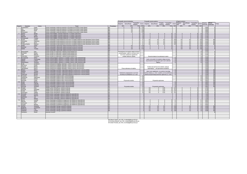 Przypadki użycia środowiska Przypadki użycia systemu Pojęcia systemu Diagram Specyfikacja Średnia Ocena Typografia i Projekty Typografia i Typografia i Ocena Diagramy Specyfikacja Ocena Ocena Uwagi klas klas końcowa końcowa estetyka ekranów estetyka estetyka 40% 50% 10% 100% 40% 30% 20% 10% 100% 50% 40% 10% 100% 3 2,5 5 2,95 0 0 0,983 2 3 2,5 5 2,95 0 0 0,983 2 3 2,5 5 2,95 0 0 0,983 2 3 2,5 5 2,95 0 0 0,983 2 4 3 5 3,6 2 2 4 5 2,7 3 3 5 3,2 3,167 3 4 3 5 3,6 2 2 4 5 2,7 3 3 5 3,2 3,167 3 4 3 5 3,6 2 2 4 5 2,7 3 3 5 3,2 3,167 3 4 3 5 3,6 2 2 4 5 2,7 3 3 5 3,2 3,167 3 4 4 5 4,1 4,5 4,5 4,5 5 4,55 4,5 4,5 5 4,55 4,400 4,5 4 4 5 4,1 4,5 4,5 4,5 5 4,55 4,5 4,5 5 4,55 4,400 4,5 4 4 5 4,1 4,5 4,5 4,5 5 4,55 4,5 4,5 5 4,55 4,400 4,5 4 4 5 4,1 4,5 4,5 4,5 5 4,55 4,5 4,5 5 4,55 4,400 4,5 5 4,5 5 4,75 5 5 5 5 5 4,5 4,5 5 4,55 4,767 5 5 4,5 5 4,75 5 5 5 5 5 4,5 4,5 5 4,55 4,767 5 5 4,5 5 4,75 5 5 5 5 5 4,5 4,5 5 4,55 4,767 5 0 0 0 0,000 2 4 3,5 3,167 3 Rozwiązanie nie wspiera całego procesu 2 4 3,5 3,167 3 przeprowadzki, część to nie są pu środ, 2 4 3,5 3,167 3 czynności nadmiernie ogólnikowe, modele nieliczne i płytkie Znacznie lepiej niż za pierwszym razem 2 4 3,5 3,167 3 5 3,5 3,5 4,000 4 Ładne, ale system nie wspiera całego procesu 5 3,5 3,5 4,000 4 przyznawania wynagrodzeń (jest w tym zakresie 5 3,5 3,5 4,000 4 błędny) 5 3,5 3,5 4,000 4 2 4 3 3,000 3 2 4 3 3,000 3 Analiza zbyt generyczna (otwiera, wpisuje, 2 4 3 3,000 3 zapamiętuje…), ale generalnie kompletna Praca oderwana od realiów. 2 4 3 3,000 3 4 3,5 3 3,500 3,5 Jakoś mam wątpliwości, czy autorzy rozumieją 4 3,5 3 3,500 3,5 Nadmiernie zagregowane czynności 4 różnicę między p.u. środ. I systemu, bo te systemowe 3,5 3 3,500 3,5 utrudnią ich powiązanie z p.u. syst. 4 dziwnie przypominają poziomem ogólności p.u. środ. 3,5 3 3,500 3,5 4,5 5 4,5 4,667 4,5 4,5 5 4,5 4,667 4,5 4,5 5 4,5 4,667 4,5 Przyzwoita analiza Przywoicie wykonane 4,5 5 4,5 4,667 4,5 4,5 4,5 5 4,667 4,5 4,5 4,5 5 4,667 4,5 4,5 4,5 5 4,667 4,5 Przyzwoita analiza Przyzwoicie wykonane 4,5 4,5 5 4,667 4,5 4,5 4,5 5 4,75 5 4,75 5 5 5 5 4,750 5 4,5 4,5 5 4,75 5 4,75 5 5 5 5 4,750 5 4,5 4,5 5 4,75 5 4,75 5 5 5 5 4,750 5 4,5 4,5 5 4,75 5 4,75 5 5 5 5 4,750 5 4 0 0 0 0 0 1,333 2 4 0 0 0 0 0 1,333 2 4 0 0 0 0 0 1,333 2 4 0 0 0 0 0 1,333 2 4 4 4 4 5 4,1 4 4 5 4,1 4,067 4 4 4 4 4 5 4,1 4 4 5 4,1 4,067 4 4 4 4 4 5 4,1 4 4 5 4,1 4,067 4 4 4 4 4 5 4,1 4 4 5 4,1 4,067 4 4 4,5 4,5 4,5 5 4,55 4 4,5 5 4,3 4,283 4,5 4 4,5 4,5 4,5 5 4,55 4 4,5 5 4,3 4,283 4,5 4 4,5 4,5 4,5 5 4,55 4 4,5 5 4,3 4,283 4,5 4 4,5 4,5 4,5 5 4,55 4 4,5 5 4,3 4,283 4,5 4 Diagramy Zespół Nazwisko 1 Pawlukiewicz Kita Dębski Elznerowicz 2 Kędroń Piebak Majczak Chrzanowski Korpal 3 Olszewska Wujek Prewysz-Kwinto Kaleta 4 Kamiński Szleter 5 6 7 8 9 10 11 12 13 14 Kobuszewski Kucharski Talik Szlachetka Szczepański Hejman Gajowy Niespodziany Kosik Del Percio Chilczuk Jędrzejewski Malesa Zieliński Lemiec Pawluczuk Browarski Karbarczyk Kosiacki Banasiak Kraluk Dybka Saienko Kaczmar Świątek Paciorek Kubiak Antonowicz Żukowski Kosiński Ignatowicz Smaruj Słoma Ślęczka Jankowski Frączak Zielński Regliński Rzeczyca Gadawski Danilewicz Imiona Paweł Michał Kamil Jan Maciej Paweł Michał Tomasz Łukasz Katarzyna Anna Mateusz Adrian Piotr Tomasz Piotr Maciej Mariusz Arkadiusz Wiktor Przemysław Łukasz Wojciech Amadeusz Daniel Michał Marcin Marcin Tomasz Bartosz Monika Michał Aleksandra Hubert Paweł Michał Patrycja Kataryna Wojciech Eliza Radosław Marta Izabela Konrad Mariusz Jan Matusz Andrzej Wiktor Piotr Bartosz Sylwester Christopher Piotr Łukasz Daniel Temat System wspierający ewidencję pojazdów w Wydziale Komunikacji Urzędu Miasta System wspierający ewidencję pojazdów w Wydziale Komunikacji Urzędu Miasta System wspierający ewidencję pojazdów w Wydziale Komunikacji Urzędu Miasta System wspierający ewidencję pojazdów w Wydziale Komunikacji Urzędu Miasta System wspomagający obsługę postępowań w Urzędzie Patentowym System wspomagający obsługę postępowań w Urzędzie Patentowym System wspomagający obsługę postępowań w Urzędzie Patentowym System wspomagający obsługę postępowań w Urzędzie Patentowym System wspierający przeprowadzanie konkursów na projekty badawcze przez Narodowe Centrum Nauki System wspierający przeprowadzanie konkursów na projekty badawcze przez Narodowe Centrum Nauki System wspierający przeprowadzanie konkursów na projekty badawcze przez Narodowe Centrum Nauki System wspierający przeprowadzanie konkursów na projekty badawcze przez Narodowe Centrum Nauki System wspierający organizację międzynarodowej konferencji naukowej System wspierający organizację międzynarodowej konferencji naukowej System wspierający organizację międzynarodowej konferencji naukowej System wspierający organizację międzynarodowej konferencji naukowej System służący do organizacji i realizacji przeprowadzek biur System służący do organizacji i realizacji przeprowadzek biur System służący do organizacji i realizacji przeprowadzek biur System służący do organizacji i realizacji przeprowadzek biur System obsługi biegłych sądowych w wydziale cywilnym sądu powszechnego System obsługi biegłych sądowych w wydziale cywilnym sądu powszechnego System obsługi biegłych sądowych w wydziale cywilnym sądu powszechnego System obsługi biegłych sądowych w wydziale cywilnym sądu powszechnego System obsługi biura biegłego sądowego z zakresu wyceny nieruchomości System obsługi biura biegłego sądowego z zakresu wyceny nieruchomości System obsługi biura biegłego sądowego z zakresu wyceny nieruchomości System obsługi biura biegłego sądowego z zakresu wyceny nieruchomości System wspierający sprzedaż i organizację wyjazdów turystycznych w biurze podróży System wspierający sprzedaż i organizację wyjazdów turystycznych w biurze podróży System wspierający sprzedaż i organizację wyjazdów turystycz