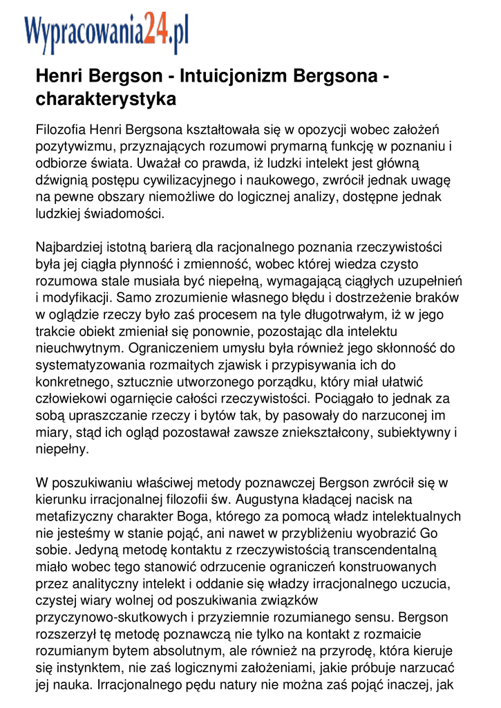 Henri Bergson - Intuicjonizm Bergsona charakterystyka Filozofia Henri Bergsona kształtowała się w opozycji wobec założeń pozytywizmu, przyznających rozumowi prymarną funkcję w poznaniu i odbiorze świata. Uważał co prawda, iż ludzki intelekt jest główną dźwignią postępu cywilizacyjnego i naukowego, zwrócił jednak uwagę na pewne obszary niemożliwe do logicznej analizy, dostępne jednak ludzkiej świadomości. Najbardziej istotną barierą dla racjonalnego poznania rzeczywistości była jej ciągła płynność i zmienność, wobec której wiedza czysto rozumowa stale musiała być niepełną, wymagającą ciągłych uzupełnień i modyfikacji. Samo zrozumienie własnego błędu i dostrzeżenie braków w oglądzie rzeczy było zaś procesem na tyle długotrwałym, iż w jego trakcie obiekt zmieniał się ponownie, pozostając dla intelektu nieuchwytnym. Ograniczeniem umysłu była również jego skłonność do systematyzowania rozmaitych zjawisk i przypisywania ich do konkretnego, sztucznie utworzonego porządku, który miał ułatwić człowiekowi ogarnięcie całości rzeczywistości. Pociągało to jednak za sobą upraszczanie rzeczy i bytów tak, by pasowały do narzuconej im miary, stąd ich ogląd pozostawał zawsze zniekształcony, subiektywny i niepełny. W poszukiwaniu właściwej metody poznawczej Bergson zwrócił się w kierunku irracjonalnej filozofii św. Augustyna kładącej nacisk na metafizyczny charakter Boga, którego za pomocą władz intelektualnych nie jesteśmy w stanie pojąć, ani nawet w przybliżeniu wyobrazić Go sobie. Jedyną metodę kontaktu z rzeczywistością transcendentalną miało wobec tego stanowić odrzucenie ograniczeń konstruowanych przez analityczny intelekt i oddanie się władzy irracjonalnego uczucia, czystej wiary wolnej od poszukiwania związków przyczynowo-skutkowych i przyziemnie rozumianego sensu. Bergson rozszerzył tę metodę poznawczą nie tylko na kontakt z rozmaicie rozumianym bytem absolutnym, ale również na przyrodę, która kieruje się instynktem, nie zaś logicznymi założeniami, jakie próbuje narzucać jej nauka. Irracjonalnego pędu natury nie można zaś pojąć inaczej, jak poprzez czysto intuicyjne „odczuwanie” kierujących nim sił i poddanie się własnemu instynktowi, który podsuwa nam częstokroć rozwiązania i odpowiedzi niespójne z żadnym systemem logicznym, z niejasnego powodu sprawiające jednak wrażenie słusznych. Bergson zdefiniował wymykające się logicznej analizie prawa kierujące światem nieco szerzej, niż tylko jako tradycyjnie pojmowany instynkt – dla ich określenia używał sformułowania „élan vital” oznaczającego „pęd życiowy”, który wykluczał zarówno kategorie ślepej i pozbawionej kontroli ewolucji, jak i racjonalnego porządku. Dla ich zrozumienia również ludzka świadomość musiała kierować się władzami leżącymi pośrodku tych dwóch systemów, czysty instynkt pozostawał bowiem bliżej życia i jego pierwotnego znaczenia, nie posiadał jednak zdolności do autorefleksji i sam w sobie był bezużyteczny; intelekt z kolei potrafił pojmować rzeczy, ale w swojej czystej formie pozostawał skupiony jedynie na ich technicznej powierzchni. Wartością łączącą te dwie zdolności człowieka miała być właśnie intuicja, rozumiana jako ufne zagłębienie się we własnej świadomości.