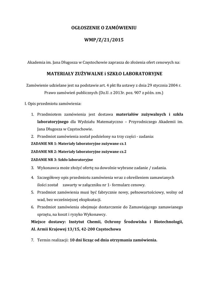 OGŁOSZENIE O ZAMÓWIENIU WMP/Z/21/2015 Akademia im. Jana Długosza w Częstochowie zaprasza do złożenia ofert cenowych na: MATERIAŁY ZUŻYWALNE i SZKŁO LABORATORYJNE Zamówienie udzielane jest na podstawie art. 4 pkt 8a ustawy z dnia 29 stycznia 2004 r. Prawo zamówień publicznych (Dz.U. z 2013r. poz. 907 z późn. zm.) I. Opis przedmiotu zamówienia: 1. Przedmiotem zamówienia jest dostawa materiałów zużywalnych i szkła laboratoryjnego dla Wydziału Matematyczno – Przyrodniczego Akademii im. Jana Długosza w Częstochowie. 2. Przedmiot zamówienia został podzielony na trzy części - zadania: ZADANIE NR 1: Materiały laboratoryjne zużywane cz.1 ZADANIE NR 2: Materiały laboratoryjne zużywane cz.2 ZADANIE NR 3: Szkło laboratoryjne 3. Wykonawca może złożyć ofertę na dowolnie wybrane zadanie / zadania. 4. Szczegółowy opis przedmiotu zamówienia wraz z określeniem zamawianych ilości został zawarty w załączniku nr 1- formularz cenowy. 5. Przedmiot zamówienia musi być fabrycznie nowy, pełnowartościowy, wolny od wad, bez wcześniejszej eksploatacji. 6. Przedmiot zamówienia obejmuje dostarczenie do Zamawiającego zamawianego sprzętu, na koszt i ryzyko Wykonawcy. Miejsce dostawy: Instytut Chemii, Ochrony Środowiska i Biotechnologii, Al. Armii Krajowej 13/15, 42-200 Częstochowa 7. Termin realizacji: 10 dni licząc od dnia otrzymania zamówienia. II. Składanie ofert Oferty cenowe wraz ze specyfikacją oferowanego sprzętu należy składać za pośrednictwem poczty elektronicznej na adres: ZADANIE nr 1. [email protected] - Sylwia Bednarek ZADANIE nr 2 i 3. [email protected] - Agnieszka Godela Termin składania ofert upływa dnia 03.07.2015 o godz. 10:00 III. Kryteria wyboru 1. Dokonując wyboru oferty Zamawiający będzie kierował się kryterium najniżej ceny brutto z wagą 100%. Zamawiający wybierze ofertę najkorzystniejszą, za którą zostanie uznana oferta z najniższą ceną (brutto) realizacji całości zamówienia spośród ofert spełniających wymagania określone przez Zamawiającego. 2. W przypadku, gdy niemożliwy będzie wybór oferty najkorzystniejszej, z uwagi na to, iż zostały złożone oferty o takiej samej cenie, Zamawiający wezwie Wykonawców, którzy złożyli te oferty do złożenia ofert dodatkowych. Wykonawcy składając oferty dodatkowe nie mogą zaoferować cen wyższych niż w złożonych ofertach. IV. Osoby do kontaktu 1. Wykonawca może kontaktować się z Zamawiającym: ZADANIE nr 1. [email protected], Sylwia Bednarek tel. 507-923-933 ZADANIE nr 2 i 3. [email protected] Agnieszka Godela tel. 724-492-512 2. Wszelkie zmiany oraz wyjaśnienia dotyczące niniejszego zamówienia, mogące mieć wpływ na złożenie oferty o udzieleniu zamówienia będą publikowane na stronie Biuletynu w Częstochowie Informacji Publicznej Akademii im. Jana Długosza
