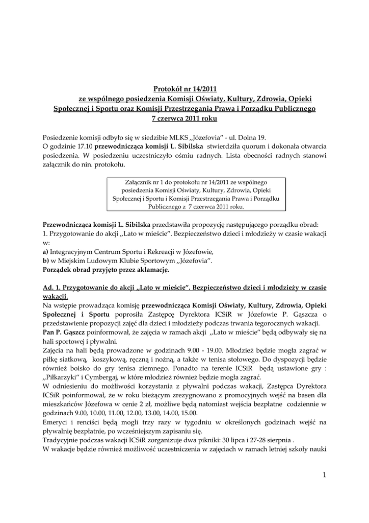 Protokół nr 14/2011 ze wspólnego posiedzenia Komisji Oświaty, Kultury, Zdrowia, Opieki Społecznej i Sportu oraz Komisji Przestrzegania Prawa i Porządku Publicznego 7 czerwca 2011 roku Posiedzenie komisji odbyło się w siedzibie MLKS ,,Józefovia” - ul. Dolna 19. O godzinie 17.10 przewodnicząca komisji L. Sibilska stwierdziła quorum i dokonała otwarcia posiedzenia. W posiedzeniu uczestniczyło ośmiu radnych. Lista obecności radnych stanowi załącznik do nin. protokołu. Załącznik nr 1 do protokołu nr 14/2011 ze wspólnego posiedzenia Komisji Oświaty, Kultury, Zdrowia, Opieki Społecznej i Sportu i Komisji Przestrzegania Prawa i Porządku Publicznego z 7 czerwca 2011 roku. Przewodnicząca komisji L. Sibilska przedstawiła propozycję następującego porządku obrad: 1. Przygotowanie do akcji ,,Lato w mieście”. Bezpieczeństwo dzieci i młodzieży w czasie wakacji w: a) Integracyjnym Centrum Sportu i Rekreacji w Józefowie, b) w Miejskim Ludowym Klubie Sportowym ,,Józefovia”. Porządek obrad przyjęto przez aklamację. Ad. 1. Przygotowanie do akcji ,,Lato w mieście”. Bezpieczeństwo dzieci i młodzieży w czasie wakacji. Na wstępie prowadząca komisję przewodnicząca Komisji Oświaty, Kultury, Zdrowia, Opieki Społecznej i Sportu poprosiła Zastępcę Dyrektora ICSiR w Józefowie P. Gąszcza o przedstawienie propozycji zajęć dla dzieci i młodzieży podczas trwania tegorocznych wakacji. Pan P. Gąszcz poinformował, że zajęcia w ramach akcji ,,Lato w mieście” będą odbywały się na hali sportowej i pływalni. Zajęcia na hali będą prowadzone w godzinach 9.00 - 19.00. Młodzież będzie mogła zagrać w piłkę siatkową, koszykową, ręczną i nożną, a także w tenisa stołowego. Do dyspozycji będzie również boisko do gry tenisa ziemnego. Ponadto na terenie ICSiR będą ustawione gry : ,,Piłkarzyki” i Cymbergaj, w które młodzież również będzie mogła zagrać. W odniesieniu do możliwości korzystania z pływalni podczas wakacji, Zastępca Dyrektora ICSiR poinformował, że w roku bieżącym zrezygnowano z promocyjnych wejść na basen dla mieszkańców Józefowa w cenie 2 zł, możliwe będą natomiast wejścia bezpłatne codziennie w godzinach 9.00, 10.00, 11.00, 12.00, 13.00, 14.00, 15.00. Emeryci i renciści będą mogli trzy razy w tygodniu w określonych godzinach wejść na pływalnię bezpłatnie, po wcześniejszym zapisaniu się. Tradycyjnie podczas wakacji ICSiR zorganizuje dwa pikniki: 30 lipca i 27-28 sierpnia . W wakacje będzie również możliwość uczestniczenia w zajęciach w ramach letniej szkoły nauki 1 pływania. Zajęcia będą płatne. W roku bieżącym zorganizowane będą dwie nowe formy dla dorosłych kobiet z Józefowa zajęcia z instruktorem w ramach letniej akademii nornic walking - prawdopodobnie dwa razy w tygodniu oraz zajęcia aqua aerobicu. W wakacje uczestniczki aqua aerobicu płaciłyby wyłącznie za wejście na basen. Nawiązując do wypowiedzi przedmówcy zabrała głos przewodnicząca Komisji Przestrzegania Prawa i Porządku Publicznego pytając o bezpieczeństwo dzieci i młodzieży na basenie i hali sportowej podczas wakacji. Zastępca Dyrektora ICSiR wyjaśnił, że dzieci do 10 r. ż muszą przebywać na pływalni pod opieką opiekuna, który może wejść na pływalnię za opłatą. Pan P. Gąszcz dodał, że na basenie przebywa cały czas min. 3 ratowników. Na hali sportowej młodzież będzie przebywała pod nadzorem opiekuna. W przypadku kiedy będzie dużo chętnych do uczestnictwa w zajęciach na hali, dyrekcja rozważy nadzór drugiego opiekuna. Radna Walkiewicz zapytała, czy dzieci korzystające z gier np. ,,Piłkarzyków”, ,,Cymbergaja”, które być może będą ustawione na korytarzu, również będą pod nadzorem osoby dorosłej. Pan Gąszcz odpowiedział, że obiekt ICSiR jest monitorowany . Ponadto pracownicy Centrum kontrolują korytarze. Mają oni duże doświadczenie i zawsze reagują w trudnych sytuacjach. Nie jest jednak przesądzone, gdzie będą postawione gry. Przewodnicząca Komisji PPiPP zapytała, czy na terenie Centrum będzie ktoś kto mógłby interweniować w trudnej sytuacji, gdyby taka zdarzyła się podczas wakacji na terenie Centrum. Pan P. Gąszcz odpowiedział, że w gabinecie dyrektora i zastępcy dyrektora znajdują się ekrany monitoringu i będzie możliwe natychmiastowe reagowanie na trudne sytuacje. Radna M. Walkiewicz zapytała także o opiekę medyczną podczas wakacji na terenie ICSiR. Zastępca Dyrektora ICSiR odpowiedział, że ratownicy mają ukończony kurs podstawowej pomocy medycznej i ich zadaniem jest udzielanie pomocy nie tylko na pływalni, ale na terenie całego obiektu. Następnie Zastępca Dyrektora ICSiR poinformował o sprawach finansowych ICSiR. Jak powiedział p. P. Gąszcz, od 1 stycznia br. zmieniły się zasady księgowania, w związku z czym Centrum ma obowiązek pokrycia kosztów amortyzacji. W przypadku ICSiR w roku bieżącym jest to kwota 130 tys. zł, na co nie stać Centrum, w związku z czym dyrekcja wystąpiła w ww. sprawie do Burmistrza Miasta. Zastępca Dyrektora ICSiR powiedział, że bardziej dokładne informacje na temat sytuacji finansowej Centrum będzie można przekazać po wakacjach . Przybliżone miesięczne koszty związane ze zużyciem energii wynoszą 50 tys. zł, gazu 50 tys. zł, wody 30 tys. zł. Dyrektor poinformował także o konieczności wykonania w roku bieżącym remontu niecki basenowej i wymiany folii oraz już w latach następnych konieczności remontu dachu, co również wiąże się z wysokimi kosztami. Pan P. Gąszcz nadmienił też o wstępnym zamyśle rozbudowy obiektu ICSiR tj. przesunięciu boiska i dobudowaniu wzdłuż ul. Wawerskiej pawilonu, w którym mieściłby się: klub fitness, pomieszczenia do sportów walki, profesjonalna baza dla tenisistów stołowych, pomieszczenia magazynowe i techniczne i zaplecze dla lodowiska. Wyjaśnił, że projekt rozbudowy Centrum wiąże się tak