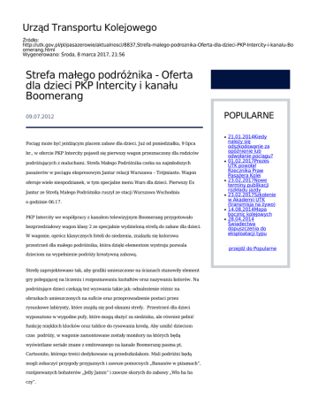 Urząd Transportu Kolejowego Źródło: http://utk.gov.pl/pl/pasazerowie/aktualnosci/8837,Strefa-malego-podroznika-Oferta-dla-dzieci-PKP-Intercity-i-kanalu-Bo omerang.html Wygenerowano: Środa, 8 marca 2017, 21:56 Strefa małego podróżnika - Oferta dla dzieci PKP Intercity i kanału Boomerang 09.07.2012 POPULARNE ● Pociąg może być jeżdżącym placem zabaw dla dzieci. Już od poniedziałku, 9 lipca br., w ofercie PKP Intercity pojawił się pierwszy wagon przeznaczony dla rodziców podróżujących z maluchami. Strefa Małego Podróżnika czeka na najmłodszych ● pasażerów w pociągu ekspresowym Jantar relacji Warszawa – Trójmiasto. Wagon oferuje wiele niespodzianek, w tym specjalne menu Wars dla dzieci. Pierwszy Ex Jantar ze Strefą Małego Podróżnika ruszył ze stacji Warszawa Wschodnia ● ● o godzinie 06.17. ● PKP Intercity we współpracy z kanałem telewizyjnym Boomerang przygotowało bezprzedziałowy wagon klasy 2 ze specjalnie wydzieloną strefą do zabaw dla dzieci. W wagonie, oprócz klasycznych foteli do siedzenia, znalazła się kolorowa przestrzeń dla małego podróżnika, która dzięki elementom wystroju pozwala dzieciom na wypełnienie podróży kreatywną zabawą. Strefę zaprojektowano tak, aby grafiki umieszczone na ścianach stanowiły element gry polegającej na liczeniu i rozpoznawaniu kształtów oraz nazywaniu kolorów. Na podróżujące dzieci czekają też wyzwania takie jak: odnalezienie różnic na obrazkach umieszczonych na suficie oraz przeprowadzenie postaci przez rysunkowe labirynty, które znajdą się pod oknami strefy. Przestrzeń dla dzieci wyposażono w wygodne pufy, które mogą służyć za siedziska, ale również pełnić funkcję miękkich klocków oraz tablice do rysowania kredą. Aby umilić dzieciom czas podróży, w wagonie zamontowane zostały monitory na których będą wyświetlane seriale znane z emitowanego na kanale Boomerang pasma pt. Cartoonito, którego treści dedykowane są przedszkolakom. Mali podróżni będą mogli zobaczyć przygody przyjaznych i zawsze pomocnych „Bananów w piżamach”, rozśpiewanych bohaterów „Jelly Jamm” i zawsze skorych do zabawy „Wło ha ha czy”. ● 21.01.2014Kiedy należy się odszkodowanie za opóźnienie lub odwołanie pociągu? 01.02.2017Prezes UTK powołał Rzecznika Praw Pasażera Kolei 23.02.2017Nowe terminy publikacji rozkładu jazdy 23.02.2017Szkolenie w Akademii UTK (transmisja na żywo) 14.08.2014Mapa bocznic kolejowych 28.04.2014 Świadectwa dopuszczenia do eksploatacji typu przejdź do Popularne Toalety wyposażono w przewijaki, a w korytarzu wydzielono przestrzeń na wózki dziecięce oraz dodatkowe miejsce na większe bagaże. Cały wagon, zarówno wewnątrz jak i zewnątrz, ozdobiony został wizerunkami popularnych postaci Cartoonitos, znanych dzieciom z kanału Boomerang. Oprócz oferowanego specjalnie dla dzieci miejsca do zabaw, przygotowane zostało również „Kids’ Menu” przez spółkę Wars, w którym najmłodsi znajdą takie dania jak omlet z konfiturą lub kawałki kurczaka w panierce. Express Jantar wyrusza ze stacji Warszawa Centralna codziennie o godzinie 6.29, aby o 12.27 dotrzeć do Gdyni. Bilety na przejazd dostępne są w trzydziestodniowej przedsprzedaży. Wagon oferuje 54 miejsca siedzące i jest objęty całkowitą rezerwacją miejsca. Aby podróżować wagonem ze strefą dla dzieci, należy podczas zakupu biletu wskazać kasjerowi wagon dziecięcy. Koszt biletu normalnego wraz miejscówką z Warszawy do Gdyni wynosi 127,50 zł. Osoby, które w trakcie przejazdu Ex Jantar skorzystają z oferty Biletu Rodzinnego za bilet zapłacą 89,55, natomiast bilet dla dziecka z ulgą ustawową 37% to koszt w wysokości 84.90 zł. Oferta Biletu Rodzinnego pozwala na podróż małej grupy ( od 2 do 5 osób), w której przynajmniej jedna z osób nie ukończyła 16 lat, ze zniżką przy zakupie biletu w wysokości 33%. Oferta obowiązuje w klasie 1 lub 2 pociągów TLK, Ex, EIC oraz EC. Dzieci podróżujące w ramach oferty rodzinnej mogą skorzystać z przysługujących im ulg ustawowych. Więcej informacji dotyczących Strefy Małego Podróżnika można znaleźć na stronie internetowej www.intercity.pl oraz w punktach informacyjnych. Osoby nie posiadające dostępu do Internetu mogą uzyskać informacje dzwoniąc pod numer Ogólnopolskiej Infolinii Kolejowej 19 757.