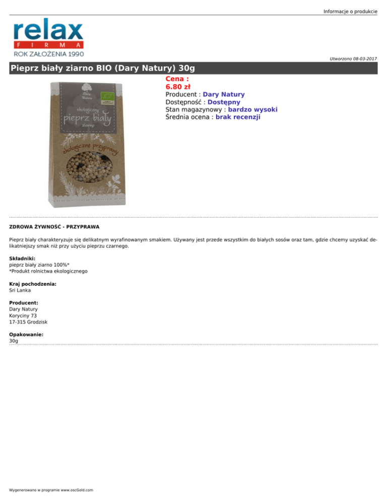 Informacje o produkcie Utworzono 08-03-2017 Pieprz biały ziarno BIO (Dary Natury) 30g Cena : 6.80 zł Producent : Dary Natury Dostępność : Dostępny Stan magazynowy : bardzo wysoki Średnia ocena : brak recenzji ZDROWA ŻYWNOŚĆ - PRZYPRAWA Pieprz biały charakteryzuje się delikatnym wyrafinowanym smakiem. Używany jest przede wszystkim do białych sosów oraz tam, gdzie chcemy uzyskać delikatniejszy smak niż przy użyciu pieprzu czarnego. Składniki: pieprz biały ziarno 100%* *Produkt rolnictwa ekologicznego Kraj pochodzenia: Sri Lanka Producent: Dary Natury Koryciny 73 17-315 Grodzisk Opakowanie: 30g Wygenerowano w programie www.oscGold.com