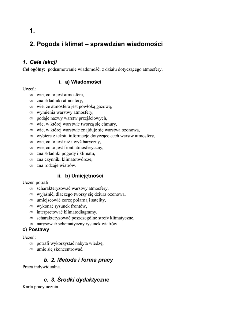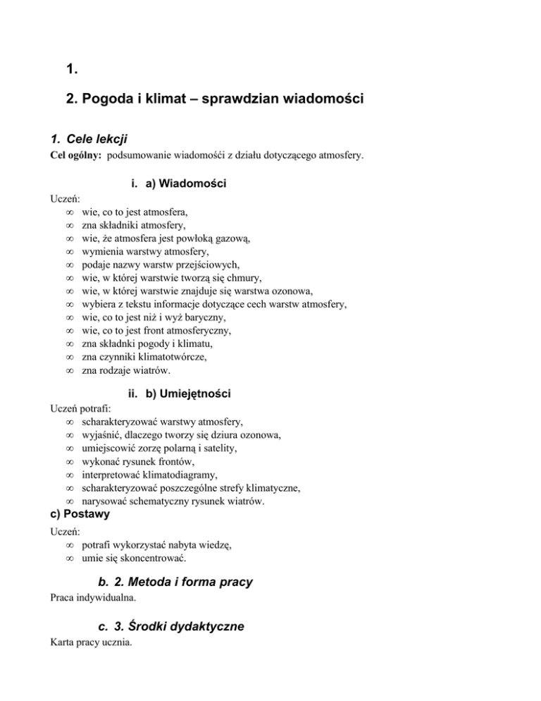1. 2. Pogoda i klimat – sprawdzian wiadomości 1. Cele lekcji Cel ogólny: podsumowanie wiadomośći z działu dotyczącego atmosfery. i. a) Wiadomości Uczeń: • wie, co to jest atmosfera, • zna składniki atmosfery, • wie, że atmosfera jest powłoką gazową, • wymienia warstwy atmosfery, • podaje nazwy warstw przejściowych, • wie, w której warstwie tworzą się chmury, • wie, w której warstwie znajduje się warstwa ozonowa, • wybiera z tekstu informacje dotyczące cech warstw atmosfery, • wie, co to jest niż i wyż baryczny, • wie, co to jest front atmosferyczny, • zna składnki pogody i klimatu, • zna czynniki klimatotwórcze, • zna rodzaje wiatrów. ii. b) Umiejętności Uczeń potrafi: • scharakteryzować warstwy atmosfery, • wyjaśnić, dlaczego tworzy się dziura ozonowa, • umiejscowić zorzę polarną i satelity, • wykonać rysunek frontów, • interpretować klimatodiagramy, • scharakteryzować poszczególne strefy klimatyczne, • narysować schematyczny rysunek wiatrów. c) Postawy Uczeń: • potrafi wykorzystać nabyta wiedzę, • umie się skoncentrować. b. 2. Metoda i forma pracy Praca indywidualna. c. 3. Środki dydaktyczne Karta pracy ucznia. d. 4. Przebieg lekcji i. a) Faza przygotowawcza Czynności organizacyjne, powitanie, sprawdzenie listy obecności. Nauczyciel rozdaje przygotowane testy (załącznik 1). ii. b) Faza realizacyjna Nauczyciel po rozdaniu testów podaje czas pracy – około 35-40 minut. Wyjaśnia zasady pisania testu: każdy pisze sam, nie wolno się odwracać, ściągać, nauczyciel raz ostrzega, a następnie zabiera kartkę; poprawa sprawdzianu w okresie do 2 tygodni. iii. c) Faza podsumowująca Nauczyciel zbiera testy. e. 5. Bibliografia 1. Modzelweska B., Piełowska E., Podstawy geografii fizycznej i geologii, SOP, Toruń 1996. 2. Wład P., Bogactwo przyrodnicze Ziemi. Geografia 1. Podręcznik dla liceum ogólnokształcącego, liceum profilowanego i technikum,Wydawnictwo Ortus, Piaseczno 2003. 3. Wład P., Bogactwo przyrodnicze Ziemi. Zeszyt ćwiczeń, Wydawnictwo Ortus, Piaseczno 2005. f. 6. Załączniki i. a) Karta pracy ucznia załącznik 1. Sprawdzian do działu ATMOSFERA Powodzenia! Imię, nazwisko, klasa Maksymalna liczba Punkty Ocena punktów 22 1. Narysuj ośrodek niskiego ciśnienia i podpisz izobary. 1 p. 2. Przyporządkuj warstwom atmosfery charakterystyczne dla nich cechy: Mezosfera A. Występowanie zorzy polarnej Stratosfera B. Występowanie warstwy ozonowej Troposfera C. Spadek temperatury do –90°C Jonosfera D. Procesy kształtujące pogodę 2 p. 3. Wymień cztery czynniki wpływające na rozkład temperatur na Ziemi: a) ..................................... b) ..................................... c) ..................................... d) ..................................... 2 p. 4. Wskaż zdania prawdziwe (wpisz literę P) oraz zdania fałszywe (wpisz literę F): Normalne ciśnienie atmosferyczne wynosi 1013 hPa. ....... Ciśnienie wzrasta wraz ze wzrostem wysokości nad poziom morza. ....... Pasaty na półkuli północnej są wiatrami północno-wschodnimi. ....... Wartość ciśnienia nie zależy od wysokości nad poziomem morza. ....... 2 p. 5. Narysuj schemat frontu atmosferycznego ciepłego. 1 p. 6. Wskaż tę odpowiedź, która podaje właściwy procentowy udział stałych składników powietrza atmosferycznego. a) 78% azotu, 20% tlenu, 1% argonu, 1% innych gazów b) 78% azotu, 21% tlenu, 1% innych gazów (wśród nich najwięcej argonu) c) 77% azotu, 21% tlenu, 2% innych gazów 1 p. 7. Podane określenia są czynnikami klimatotwórczymi lub składnikami klimatu. Dokonaj podziału i wpisz do tabeli odpowiadające określeniom oznaczenia literowe. a) sąsiedztwo występowania obszarów lądowych i morskich b) szerokość geograficzna i kąt padania promieni słonecznych c) siła i kierunek wiatru d) wysokość nad poziomem morza e) temperatura powietrza Czynniki klimatotwórcze Składniki klimatu 2,5 p. 8. Na podstawie opisu rozpoznaj strefę klimatyczną: Średnie miesięczne temperatury powietrza wynoszą ponad 20°C w ciągu roku. Amplitudy roczne są małe, wynoszą około 5°C i rosną wraz z suchością klimatu do 10°C. W strefie tej występują trzy typy klimatów różniące się rocznym przebiegiem opadów, których najwyższe wartości notowane są w okresie zenitalnego położenia Słońca. Jest to strefa ................................................................... 1 p. 9. Wymień chmury, które dają opady. .......................................................................................................................................................... .......................................................................................................................................................... 1 p. 10. Wymień nazwy głównych mas powietrza na półkuli północnej. .......................................................................................................................................................... .......................................................................................................................................................... 2 p. 11. Przedstaw na rysunkach schemat wiatru dolinnego i bryzy dziennej. 2 p. 12. Na podstawie zamieszczonego wykresu temperatur i opadów podaj: a) maksymalną sumę opadów – .............................. b) miesiąc występowania maksimum opadowego – ....................... c) minimalną sumę opadów – ...... d) minimalną wartość temperatury – ................................ e) maksymalną wartość temperatury – ........................................... f) roczną amplitudę temperatur powietrza – .................................. g) najcieplejszy miesiąc – ............................................................... h) najchłodniejszy miesiąc – ........................................................... i) strefę klimatyczną – ...