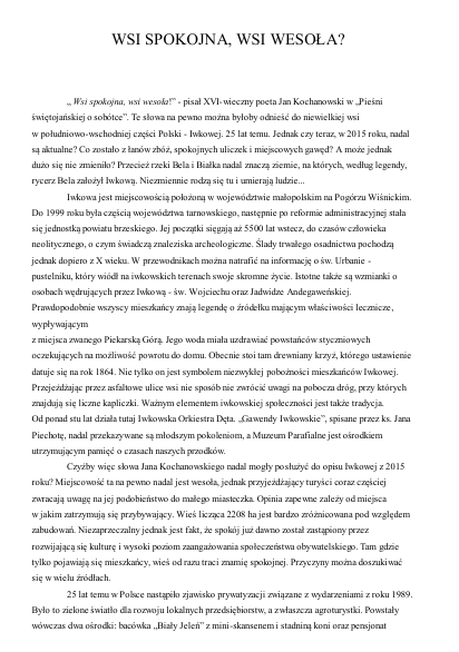 WSI SPOKOJNA, WSI WESOŁA? „ Wsi spokojna, wsi wesoła!” - pisał XVI-wieczny poeta Jan Kochanowski w „Pieśni świętojańskiej o sobótce”. Te słowa na pewno można byłoby odnieść do niewielkiej wsi w południowo-wschodniej części Polski - Iwkowej. 25 lat temu. Jednak czy teraz, w 2015 roku, nadal są aktualne? Co zostało z łanów zbóż, spokojnych uliczek i miejscowych gawęd? A może jednak dużo się nie zmieniło? Przecież rzeki Bela i Białka nadal znaczą ziemie, na których, według legendy, rycerz Bela założył Iwkową. Niezmiennie rodzą się tu i umierają ludzie... Iwkowa jest miejscowością położoną w województwie małopolskim na Pogórzu Wiśnickim. Do 1999 roku była częścią województwa tarnowskiego, następnie po reformie administracyjnej stała się jednostką powiatu brzeskiego. Jej początki sięgają aż 5500 lat wstecz, do czasów człowieka neolitycznego, o czym świadczą znaleziska archeologiczne. Ślady trwałego osadnictwa pochodzą jednak dopiero z X wieku. W przewodnikach można natrafić na informację o św. Urbanie pustelniku, który wiódł na iwkowskich terenach swoje skromne życie. Istotne także są wzmianki o osobach wędrujących przez Iwkową - św. Wojciechu oraz Jadwidze Andegaweńskiej. Prawdopodobnie wszyscy mieszkańcy znają legendę o źródełku mającym właściwości lecznicze, wypływającym z miejsca zwanego Piekarską Górą. Jego woda miała uzdrawiać powstańców styczniowych oczekujących na możliwość powrotu do domu. Obecnie stoi tam drewniany krzyż, którego ustawienie datuje się na rok 1864. Nie tylko on jest symbolem niezwykłej pobożności mieszkańców Iwkowej. Przejeżdżając przez asfaltowe ulice wsi nie sposób nie zwrócić uwagi na pobocza dróg, przy których znajdują się liczne kapliczki. Ważnym elementem iwkowskiej społeczności jest także tradycja. Od ponad stu lat działa tutaj Iwkowska Orkiestra Dęta. „Gawendy Iwkowskie”, spisane przez ks. Jana Piechotę, nadal przekazywane są młodszym pokoleniom, a Muzeum Parafialne jest ośrodkiem utrzymującym pamięć o czasach naszych przodków. Czyżby więc słowa Jana Kochanowskiego nadal mogły posłużyć do opisu Iwkowej z 2015 roku? Miejscowość ta na pewno nadal jest wesoła, jednak przyjeżdżający turyści coraz częściej zwracają uwagę na jej podobieństwo do małego miasteczka. Opinia zapewne zależy od miejsca w jakim zatrzymują się przybywający. Wieś licząca 2208 ha jest bardzo zróżnicowana pod względem zabudowań. Niezaprzeczalny jednak jest fakt, że spokój już dawno został zastąpiony przez rozwijającą się kulturę i wysoki poziom zaangażowania społeczeństwa obywatelskiego. Tam gdzie tylko pojawiają się mieszkańcy, wieś od razu traci znamię spokojnej. Przyczyny można doszukiwać się w wielu źródłach. 25 lat temu w Polsce nastąpiło zjawisko prywatyzacji związane z wydarzeniami z roku 1989. Było to zielone światło dla rozwoju lokalnych przedsiębiorstw, a zwłaszcza agroturystki. Powstały wówczas dwa ośrodki: bacówka „Biały Jeleń” z mini-skansenem i stadniną koni oraz pensjonat „Zyga” Funkcjonują one dotychczas i przyjmują znaczną ilość turystów. Wychodząc naprzeciw oczekiwaniom gości przez Iwkową zostały poprowadzone szlaki turystyczne: 2 piesze górskie i 3 rowerowe. Następnie, 15 lat później, Rzeczpospolita stała się członkiem Unii Europejskiej. Dzięki tej akcesji możliwe stało się uzyskanie dofinansowania do wielu inwestycji. Fundusz SAPARD skutecznie wspomógł modernizację wsi. Budowa dróg gminnych, wiat turystycznych, parkingów, organizacja centrum kultury, sportu i rekreacji, remont Gminnego Ośrodka Kultury, renowacja zabytków oraz promocja Iwkowej to tylko niektóre ze zrealizowanych celów. Na przestrzeni 25 lat znacząco zmienił się wygląd wsi. Ważnym elementem każdej społeczności jest kultura. Lata 1990-2015 były okresem kiedy nastąpił szczególny rozkwit literatury, śpiewu i tańca w Iwkowej. Do życia został powołany kwartalnik „Echo na Belą” oraz periodyk „Gazeta Parafialna”. Czasopisma te na bieżąco monitorują oraz komentują aktualne wydarzenia. Na stałe w dzieje wsi wpisały się huczne festyny organizowane cyklicznie każdego lata, takie jak „Powitanie Lata”, „Rodzina Zawsze Razem” oraz „Wokół Piekarskiej Góry”. Są one nie tylko odpowiedzią na zapotrzebowanie na rozrywkę, ale także wspierają lokalne inwestycje (np. budowę boiska sportowego dla dzieci). W centrum miejscowości funkcjonuje klub „Belanka”. Dyskoteki przyciągają nie tylko młodzież z Iwkowej, ale także z sąsiednich wsi. Duże zasługi dla kultury mają także GOK oraz Gminna Biblioteka Publiczna, które zajmują się organizacją licznych wydarzeń, m. in. spotkań poetyckich. Niemałe znaczenie należy także przypisać stowarzyszeniu „Na śliwkowym szlaku” oraz „Stowarzyszeniu rozwoju i promocji Gminy Iwkowa”. Okres ostatnich 25 lat to także powołanie do życia Dziecięcego Zespołu Pieśni i Tańca, który dołączył do istniejącej już Kapeli Ludowej Iwkowianie oraz Zespołu Taneczno Wokalnego „Malwinki”. W ramach programu „Kapitał Ludzki” w Iwkowej zaczęto organizować szkolenia mające na celu podniesienie kwalifikacji zawodowych mieszkańców. Należą do nich m. in. kursy obsługi komputera, kasy fiskalnej, itp. Działania te pozwalają na podjęcie pracy zarobkowej osobom dotychczas niewykwalifikowanym. Od 1990 roku poziom bezrobocia w Iwkowej systematycznie spada. W ludzkiej mentalności szanse rozwoju człowieka ze wsi zaczynają się zrównywać z szansami mieszkańca miasta. Jest to bardzo ważny etap rozwoju wsi, ponieważ psychika społeczeństwa jest tym co prowadzi do progresu lub regresu. Obecnie da się odczuć, że w Iwkowej zanika zaściankowość i stereotypy. Jednak miejscowość nadal jest miejscem, które pilnie strzeże swojego dziedzictwa, kultury i wiar