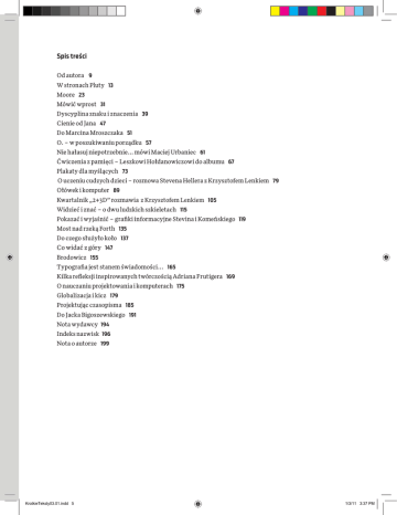 Spis treści Od autora 9 W stronach Pluty 13 Moore 23 Mówić wprost 31 Dyscyplina znaku i znaczenia 39 Cienie od Jana 47 Do Marcina Mroszczaka 51 O. – w poszukiwaniu porządku 57 Nie hałasuj niepotrzebnie... mówi Maciej Urbaniec 61 Ćwiczenia z pamięci – Leszkowi Hołdanowiczowi do albumu 67 Plakaty dla myślących 73 O uczeniu cudzych dzieci – rozmowa Stevena Hellera z Krzysztofem Lenkiem 79 Ołówek i komputer 89 Kwartalnik „2+3D” rozmawia z Krzysztofem Lenkiem 105 Widzieć i znać – o dwu ludzkich szkieletach 115 Pokazać i wyjaśnić – grafiki informacyjne Stevina i Komeńskiego 119 Most nad rzeką Forth 135 Do czego służyło koło 137 Co widać z góry 147 Brodowicz 155 Typografia jest stanem świadomości... 165 Kilka refleksji inspirowanych twórczością Adriana Frutigera 169 O nauczaniu projektowania i komputerach 175 Globalizacja i kicz 179 Projektując czasopisma 185 Do Jacka Bigoszewskiego 191 Nota wydawcy 194 Indeks nazwisk 196 Nota o autorze 199 5 KrotkieTeksty03.01.indd 5 1/3/11 3:37 PM