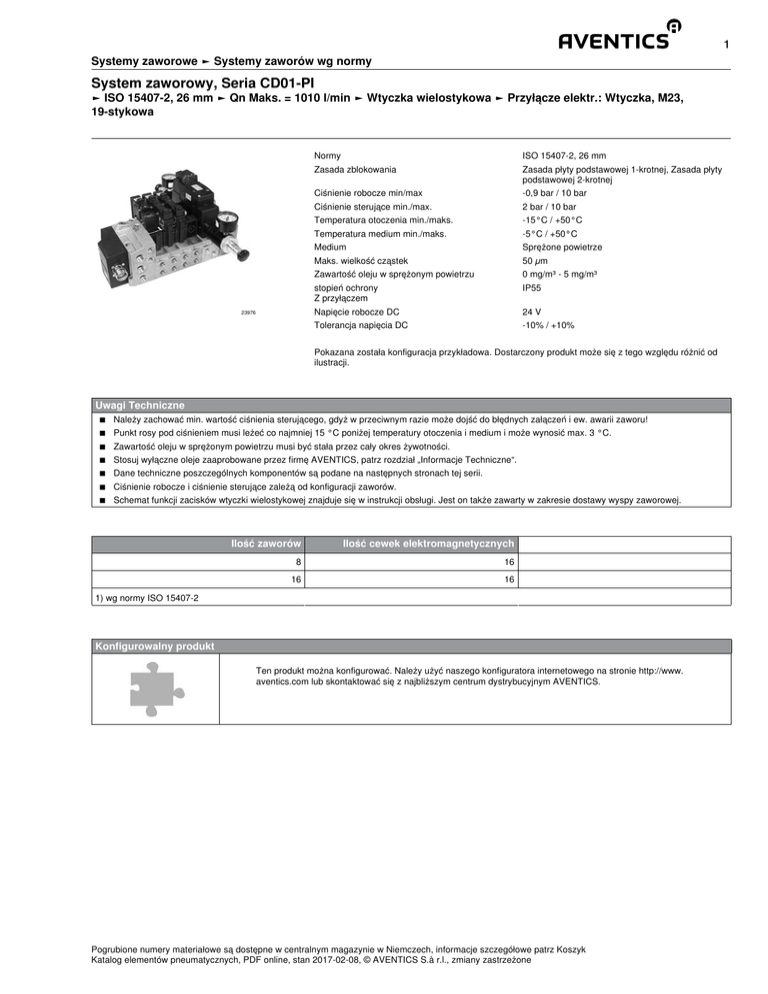 1 Systemy zaworowe ► Systemy zaworów wg normy System zaworowy, Seria CD01-PI ► ISO 15407-2, 26 mm ► Qn Maks. = 1010 l/min ► Wtyczka wielostykowa ► Przyłącze elektr.: Wtyczka, M23, 19-stykowa 23976 Normy ISO 15407-2, 26 mm Zasada zblokowania Zasada płyty podstawowej 1-krotnej, Zasada płyty podstawowej 2-krotnej Ciśnienie robocze min/max -0,9 bar / 10 bar Ciśnienie sterujące min./max. 2 bar / 10 bar Temperatura otoczenia min./maks. -15°C / +50°C Temperatura medium min./maks. -5°C / +50°C Medium Sprężone powietrze Maks. wielkość cząstek 50 µm Zawartość oleju w sprężonym powietrzu 0 mg/m³ - 5 mg/m³ stopień ochrony Z przyłączem IP55 Napięcie robocze DC 24 V Tolerancja napięcia DC -10% / +10% Pokazana została konfiguracja przykładowa. Dostarczony produkt może się z tego względu różnić od ilustracji. Uwagi Techniczne ■ Należy zachować min. wartość ciśnienia sterującego, gdyż w przeciwnym razie może dojść do błędnych załączeń i ew. awarii zaworu! ■ Punkt rosy pod ciśnieniem musi leżeć co najmniej 15 °C poniżej temperatury otoczenia i medium i może wynosić max. 3 °C. ■ Zawartość oleju w sprężonym powietrzu musi być stała przez cały okres żywotności. ■ Stosuj wyłączne oleje zaaprobowane przez firmę AVENTICS, patrz rozdział „Informacje Techniczne“. ■ Dane techniczne poszczególnych komponentów są podane na następnych stronach tej serii. ■ Ciśnienie robocze i ciśnienie sterujące zależą od konfiguracji zaworów. ■ Schemat funkcji zacisków wtyczki wielostykowej znajduje się w instrukcji obsługi. Jest on także zawarty w zakresie dostawy wyspy zaworowej. Ilość zaworów Ilość cewek elektromagnetycznych 8 16 16 16 1) wg normy ISO 15407-2 Konfigurowalny produkt Ten produkt można konfigurować. Należy użyć naszego konfiguratora internetowego na stronie http://www. aventics.com lub skontaktować się z najbliższym centrum dystrybucyjnym AVENTICS. Pogrubione numery materiałowe są dostępne w centralnym magazynie w Niemczech, informacje szczegółowe patrz Koszyk Katalog elementów pneumatycznych, PDF online, stan 2017-02-08, © AVENTICS S.à r.l., zmiany zastrzeżone 2 Systemy zaworowe ► Systemy zaworów wg normy System zaworowy, Seria CD01-PI ► ISO 15407-2, 26 mm ► Qn Maks. = 1010 l/min ► Wtyczka wielostykowa ► Przyłącze elektr.: Wtyczka, M23, 19-stykowa Rozmiary G 1/8 G 1/8 G 3/8 G 3/8 54 54 27 69 56,9 41,4 13,9 139,7 G 3/8 G 3/8 274,5 232,5 167,5 46,5 t=6 5,3 121 135 54 127 51 111,5 42 2 234,5 284 24242 Pokazana została konfiguracja przykładowa. Dostarczony produkt może się z tego względu różnić od ilustracji. Pogrubione numery materiałowe są dostępne w centralnym magazynie w Niemczech, informacje szczegółowe patrz Koszyk Katalog elementów pneumatycznych, PDF online, stan 2017-02-08, © AVENTICS S.à r.l., zmiany zastrzeżone
