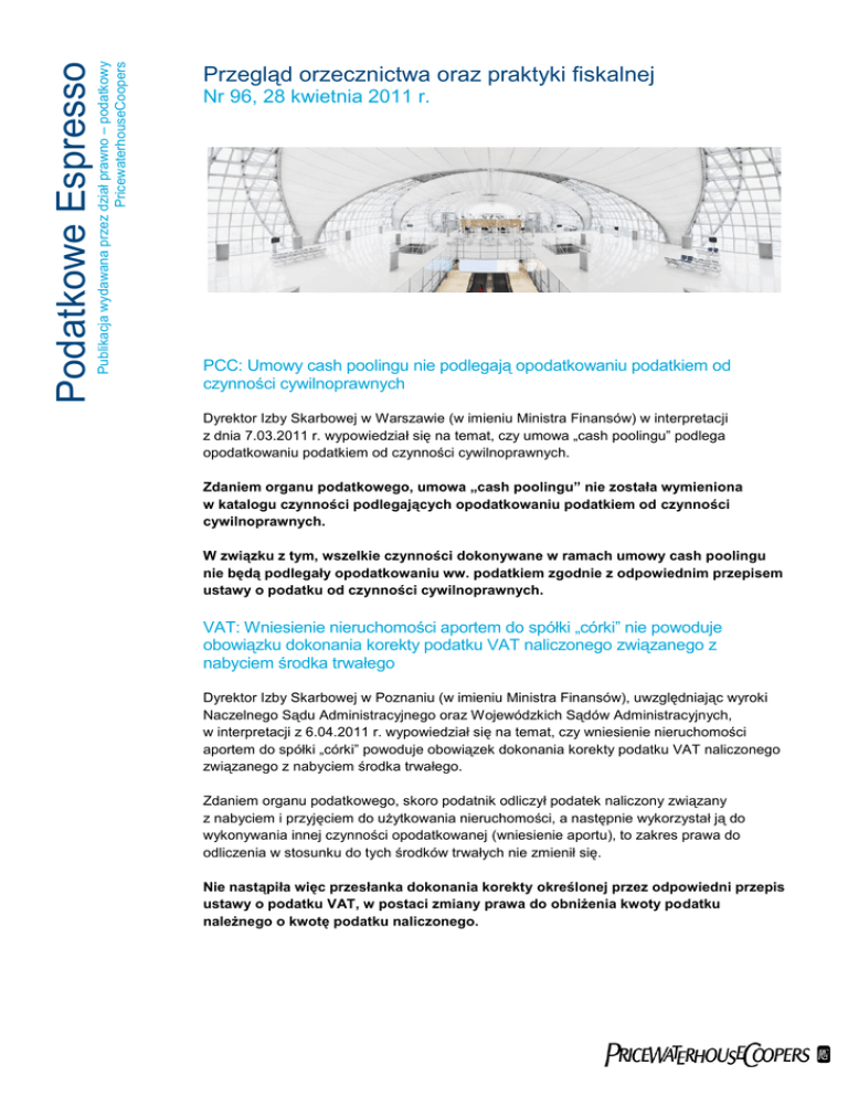 Publikacja wydawana przez dział prawno – podatkowy PricewaterhouseCoopers Podatkowe Espresso Przegląd orzecznictwa oraz praktyki fiskalnej Nr 96, 28 kwietnia 2011 r. PCC: Umowy cash poolingu nie podlegają opodatkowaniu podatkiem od czynności cywilnoprawnych Dyrektor Izby Skarbowej w Warszawie (w imieniu Ministra Finansów) w interpretacji z dnia 7.03.2011 r. wypowiedział się na temat, czy umowa „cash poolingu” podlega opodatkowaniu podatkiem od czynności cywilnoprawnych. Zdaniem organu podatkowego, umowa „cash poolingu” nie została wymieniona w katalogu czynności podlegających opodatkowaniu podatkiem od czynności cywilnoprawnych. W związku z tym, wszelkie czynności dokonywane w ramach umowy cash poolingu nie będą podlegały opodatkowaniu ww. podatkiem zgodnie z odpowiednim przepisem ustawy o podatku od czynności cywilnoprawnych. VAT: Wniesienie nieruchomości aportem do spółki „córki” nie powoduje obowiązku dokonania korekty podatku VAT naliczonego związanego z nabyciem środka trwałego Dyrektor Izby Skarbowej w Poznaniu (w imieniu Ministra Finansów), uwzględniając wyroki Naczelnego Sądu Administracyjnego oraz Wojewódzkich Sądów Administracyjnych, w interpretacji z 6.04.2011 r. wypowiedział się na temat, czy wniesienie nieruchomości aportem do spółki „córki” powoduje obowiązek dokonania korekty podatku VAT naliczonego związanego z nabyciem środka trwałego. Zdaniem organu podatkowego, skoro podatnik odliczył podatek naliczony związany z nabyciem i przyjęciem do użytkowania nieruchomości, a następnie wykorzystał ją do wykonywania innej czynności opodatkowanej (wniesienie aportu), to zakres prawa do odliczenia w stosunku do tych środków trwałych nie zmienił się. Nie nastąpiła więc przesłanka dokonania korekty określonej przez odpowiedni przepis ustawy o podatku VAT, w postaci zmiany prawa do obniżenia kwoty podatku należnego o kwotę podatku naliczonego. CIT: Określenie momentu poniesienia kosztów uzyskania przychodu w związku z nabyciem uprawnień wtórnych do emisji dwutlenku węgla CER Dyrektor Izby Skarbowej w Warszawie (w imieniu Ministra Finansów) w interpretacji z dnia 31.03.2011r. wypowiedział się na temat momentu poniesienia kosztów uzyskania przychodu w związku z nabyciem uprawnień wtórnych do emisji dwutlenku węgla CER. Zdaniem organu podatkowego należy uznać, że dzień, na który jednostki poświadczonej redukcji CER zostaną ujęte w księgach rachunkowych, będzie stanowić dla spółki dzień potrącalności kosztów uzyskania przychodów w wysokości iloczynu zakupionych jednostek i ceny nabycia jednostki. Dlatego też wydatki na nabycie jednostek poświadczonej redukcji emisji CER spółka powinna zakwalifikować, jako koszt uzyskania przychodów w dacie jego poniesienia, tj. ujęcia w księgach rachunkowych na podstawie otrzymanej faktury (rachunku) lub na podstawie innego dowodu w przypadku braku faktury (rachunku). VAT: Czynność przekazania drogi gminie nie podlega opodatkowaniu podatkiem VAT Dyrektor Izby Skarbowej w Bydgoszczy (w imieniu Ministra Finansów) w interpretacji z dnia 30.03.2011 r., uwzględniając wyrok WSA, wypowiedział się na temat, czy czynność przekazania drogi gminie podlega opodatkowaniu podatkiem VAT. Organ podatkowy zgodził się ze stanowiskiem wnioskodawcy, że nieodpłatne przekazanie drogi gminie nie podlega opodatkowaniu, gdyż przekazanie takiej infrastruktury pozostaje w związku z prowadzonym przez spółkę przedsiębiorstwem, a takie czynności co do zasady nie podlegają podatkowi VAT. Dodatkowo podkreślono, że przekazanie przedmiotowej drogi nie zmienia w niczym faktu, iż droga ta, pomimo że nie będzie własnością wnioskodawcy, nadal będzie służyć działalności opodatkowanej – z tych względów spółka wywodzi, że nie ma podstaw do korygowania pierwotnie odliczonego podatku naliczonego. W przypadku pytań, prosimy o kontakt z Tomaszem Misiakiem [email protected], Tel.: 22 523 4858, tel. kom.: 502 18 4858. Zastrzeżenie prawne: Przegląd orzecznictwa oraz praktyki fiskalnej ma jedynie charakter informacyjny i nie może stanowić jedynej podstawy do podejmowania działań. © 2011 PwC. Nazwy „PwC” i „PricewaterhouseCoopers” odnoszą się do firm wchodzących w skład sieci PricewaterhouseCoopers International Limited, z których każda stanowi odrębny i niezależny podmiot prawny.