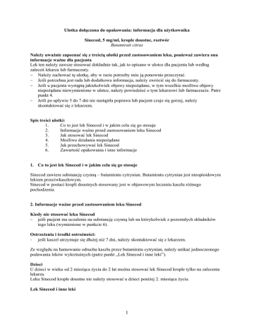 Ulotka dołączona do opakowania: informacja dla użytkownika Sinecod, 5 mg/ml, krople doustne, roztwór Butamirati citras Należy uważnie zapoznać się z treścią ulotki przed zastosowaniem leku, ponieważ zawiera ona informacje ważne dla pacjenta Lek ten należy zawsze stosować dokładnie tak, jak to opisano w ulotce dla pacjenta lub według zaleceń lekarza lub farmaceuty. Należy zachować tę ulotkę, aby w razie potrzeby móc ją ponownie przeczytać. Jeśli potrzebna jest rada lub dodatkowa informacja, należy zwrócić się do farmaceuty. Jeśli u pacjenta wystąpią jakiekolwiek objawy niepożądane, w tym wszelkie możliwe objawy niepożądane niewymienione w ulotce, należy powiedzieć o tym lekarzowi lub farmaceucie. Patrz punkt 4. Jeśli po upływie 5 do 7 dni nie nastąpiła poprawa lub pacjent czuje się gorzej, należy skontaktować się z lekarzem. Spis treści ulotki: 1. Co to jest lek Sinecod i w jakim celu się go stosuje 2. Informacje ważne przed zastosowaniem leku Sinecod 3. Jak stosować lek Sinecod 4. Możliwe działania niepożądane 5. Jak przechowywać lek Sinecod 6. Zawartość opakowania i inne informacje 1. Co to jest lek Sinecod i w jakim celu się go stosuje Sinecod zawiera substancję czynną – butamiratu cytrynian. Butamiratu cytrynian jest nieopioidowym lekiem przeciwkaszlowym. Sinecod w postaci kropli doustnych stosowany jest w objawowym leczeniu kaszlu różnego pochodzenia. 2. Informacje ważne przed zastosowaniem leku Sinecod Kiedy nie stosować leku Sinecod jeśli pacjent ma uczulenie na substancję czynną lub na którykolwiek z pozostałych składników tego leku (wymienione w punkcie 6). Ostrzeżenia i środki ostrożności: - jeśli kaszel utrzymuje się dłużej niż 7 dni, należy skontaktować się z lekarzem. Ze względu na hamowanie odruchu kaszlu przez butamiratu cytrynian, należy unikać jednoczesnego podawania leków wykrztuśnych (patrz punkt „Lek Sinecod i inne leki”). Dzieci U dzieci w wieku od 2 miesiąca życia do 2 lat można stosować lek Sinecod krople tylko na zalecenie lekarza. Leku Sinecod krople doustne nie należy stosować u dzieci poniżej 2. miesiąca życia. Lek Sinecod i inne leki 1 Należy powiedzieć lekarzowi o wszystkich przyjmowanych obecnie lub ostatnio suplementach diety i lekach, a także o lekach, które pacjent planuje przyjmować. Należy unikać jednoczesnego podawania leków wykrztuśnych, ponieważ może to prowadzić do zalegania wydzieliny w drogach oddechowych, co zwiększa ryzyko skurczu oskrzeli i zakażenia dróg oddechowych. Ciąża i karmienie piersią W ciąży i w okresie karmienia piersią lub gdy istnieje podejrzenie, że kobieta jest w ciąży lub gdy planuje ciążę, przed zastosowaniem tego leku należy poradzić się lekarza lub farmaceuty. Prowadzenie pojazdów i obsługiwanie maszyn Lek Sinecod może powodować senność. Jeżeli będzie on stosowany przez młodzież lub dorosłych należy zachować ostrożność podczas prowadzenia pojazdów lub obsługiwania maszyn. Dzieci stosujące lek powinny unikać jazdy na rowerze lub hulajnodze. Lek Sinecod zawiera: sorbitol, jeżeli stwierdzono wcześniej u pacjenta nietolerancję niektórych cukrów, pacjent powinien skontaktować się z lekarzem przed przyjęciem leku. etanol (alkohol), mniej niż 100 mg na dawkę. 3. Jak stosować lek Sinecod Ten lek należy zawsze stosować zgodnie z opisem w ulotce dla pacjenta lub według wskazań lekarza lub farmaceuty. W razie wątpliwości należy zwrócić się do lekarza lub farmaceuty. Bez konsultacji z lekarzem nie należy stosować leku Sinecod dłużej niż 5-7 dni. Lek należy stosować doustnie. Zazwyczaj stosowana dawka, to: Dzieci w wieku od 2 miesięcy do ukończenia 1. roku życia: 10 kropli cztery razy na dobę; Dzieci po ukończeniu 1. roku życia do 3 lat: 15 kropli cztery razy na dobę; Dzieci w wieku powyżej 3 lat: 25 kropli cztery razy na dobę. U dzieci w wieku od 2 miesiąca życia do 2 lat krople Sinecod można stosować wyłącznie na zalecenie lekarza. Leku Sinecod krople doustne nie należy stosować u dzieci poniżej 2. miesiąca życia. Zastosowanie większej niż zalecana dawki leku Sinecod: W przypadku zastosowania większej dawki leku niż zalecana mogą wystąpić następujące objawy: senność, nudności, wymioty, biegunka, zawroty głowy i obniżenie ciśnienia tętniczego. W przypadku przyjęcia większej niż zalecana dawki leku należy niezwłocznie zwrócić się do lekarza. Pominięcie zastosowania leku Sinecod: Nie należy stosować dawki podwójnej w celu uzupełnienia pominiętej dawki. W razie jakichkolwiek dalszych wątpliwości związanych ze stosowaniem leku należy zwrócić się do lekarza lub farmaceuty. 4. Możliwe działania niepożądane Jak każdy lek, lek ten może powodować działania niepożądane, chociaż nie u każdego one wystąpią. 2 Rzadko (częściej niż u 1 na 10 000, ale rzadziej niż u 1 na 1000 pacjentów stosujących lek) występują następujące objawy: - senność, - nudności, - biegunka, - pokrzywka. Wymienione objawy powinny ustąpić po zmniejszeniu dawki lub przerwaniu stosowania leku. Jeśli wystąpią jakiekolwiek objawy niepożądane, w tym wszelkie możliwe objawy niepożądane niewymienione w ulotce, należy zwrócić się do lekarza lub farmaceuty. Zgłaszanie działań niepożądanych Jeśli wystąpią jakiekolwiek objawy niepożądane, w tym wszelkie objawy niepożądane niewymienione w ulotce, należy powiedzieć o tym lekarzowi lub farmaceucie. Działania niepożądane można zgłaszać bezpośrednio do Departamentu Monitorowania Niepożądanych Działań Produktów Leczniczych Urzędu Rejestracji Produktów Leczniczych, Wyrobów Medycznych i Produktów Biobójczych Al. Jerozolimskie 181C, 02-222 Warszawa, tel: + 48 22 49 21 301, fax: + 48 22 49 21 309, e-mail: [email protected] Dzięki zgłaszaniu działań niepożądanych można będzie zgromadzić więcej informacji na temat bezpieczeństwa stosowa