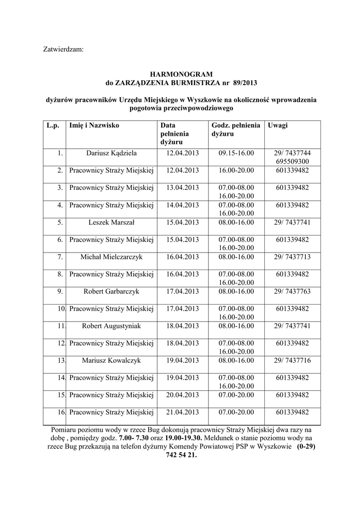Zatwierdzam: HARMONOGRAM do ZARZĄDZENIA BURMISTRZA nr 89/2013 dyżurów pracowników Urzędu Miejskiego w Wyszkowie na okoliczność wprowadzenia pogotowia przeciwpowodziowego L.p. 1. Imię i Nazwisko Dariusz Kądziela Data pełnienia dyżuru Godz. pełnienia dyżuru 12.04.2013 09.15-16.00 2. Pracownicy Straży Miejskiej 12.04.2013 16.00-20.00 3. Pracownicy Straży Miejskiej 13.04.2013 4. Pracownicy Straży Miejskiej 14.04.2013 07.00-08.00 16.00-20.00 07.00-08.00 16.00-20.00 08.00-16.00 5. Leszek Marszał 6. Pracownicy Straży Miejskiej 7. Michał Mielczarczyk 15.04.2013 15.04.2013 16.04.2013 8. Pracownicy Straży Miejskiej 16.04.2013 9. 17.04.2013 Robert Garbarczyk 10. Pracownicy Straży Miejskiej 17.04.2013 11. 18.04.2013 Robert Augustyniak 12. Pracownicy Straży Miejskiej 18.04.2013 13. 19.04.2013 Mariusz Kowalczyk 14. Pracownicy Straży Miejskiej 19.04.2013 15. Pracownicy Straży Miejskiej 16. Pracownicy Straży Miejskiej 07.00-08.00 16.00-20.00 08.00-16.00 07.00-08.00 16.00-20.00 08.00-16.00 07.00-08.00 16.00-20.00 08.00-16.00 07.00-08.00 16.00-20.00 08.00-16.00 Uwagi 29/ 7437744 695509300 601339482 601339482 601339482 29/ 7437741 601339482 29/ 7437713 601339482 29/ 7437763 601339482 29/ 7437741 601339482 29/ 7437716 601339482 20.04.2013 07.00-08.00 16.00-20.00 07.00-20.00 21.04.2013 07.00-20.00 601339482 601339482 Pomiaru poziomu wody w rzece Bug dokonują pracownicy Straży Miejskiej dwa razy na dobę , pomiędzy godz. 7.00- 7.30 oraz 19.00-19.30. Meldunek o stanie poziomu wody na rzece Bug przekazują na telefon dyżurny Komendy Powiatowej PSP w Wyszkowie (0-29) 742 54 21.