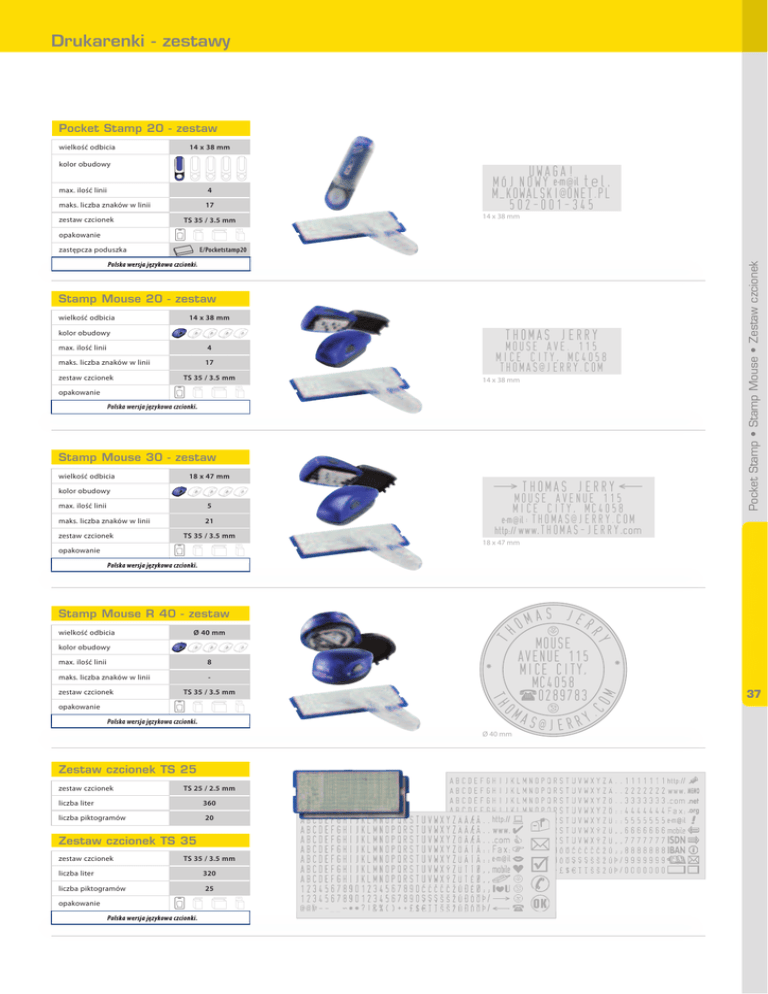 Drukarenki - zestawy Pocket Stamp 20 - zestaw 14 x 38 mm kolor obudowy max. ilość linii 4 maks. liczba znaków w linii 17 zestaw czcionek opakowanie zastępcza poduszka TS 35 / 3.5 mm UWAGA! MÓJ NOWY Ġ ¡ [email protected] 502-001-345 14 x 38 mm ò ð ï ñ A E/Pocketstamp20 Polska wersja językowa czcionki. Stamp Mouse 20 - zestaw wielkość odbicia 14 x 38 mm THOMAS JERRY kolor obudowy max. ilość linii 4 maks. liczba znaków w linii 17 zestaw czcionek TS 35 / 3.5 mm Mouse Ave. 115 Mice City, MC4058 [email protected] 14 x 38 mm òð ï ñ opakowanie Polska wersja językowa czcionki. Stamp Mouse 30 - zestaw wielkość odbicia 18 x 47 mm { THOMAS JERRY } kolor obudowy max. ilość linii 5 maks. liczba znaków w linii 21 zestaw czcionek TS 35 / 3.5 mm òð ï ñ opakowanie Mouse Avenue 115 Mice City, MC4058 Ġ : [email protected] § Ģthomas-jerryġ Pocket Stamp • Stamp Mouse • Zestaw czcionek wielkość odbicia 18 x 47 mm Polska wersja językowa czcionki. T - maks. liczba znaków w linii zestaw czcionek TS 35 / 3.5 mm th òð ï ñ opakowanie om Polska wersja językowa czcionki. Ø 40 mm Zestaw czcionek TS 25 zestaw czcionek TS 25 / 2.5 mm liczba liter 360 liczba piktogramów 20 Zestaw czcionek TS 35 zestaw czcionek TS 35 / 3.5 mm liczba liter 320 liczba piktogramów 25 opakowanie òð ï ñ Polska wersja językowa czcionki. Ğ Mouse avenue 115 mice city, mc4058 >0289783 as Ĝ * 8 max. ilość linii * kolor obudowy mas jer m ho Ø 40 mm ry wielkość odbicia co Stamp Mouse R 40 - zestaw @jerry . 37