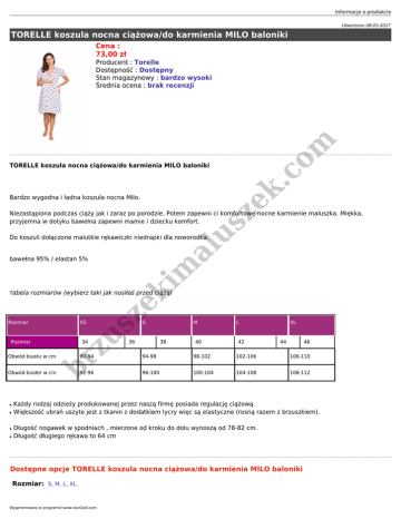 Informacje o produkcie Utworzono 08-03-2017 TORELLE koszula nocna ciążowa/do karmienia MILO baloniki Cena : 73,00 zł us ze k. co m Producent : Torelle Dostępność : Dostępny Stan magazynowy : bardzo wysoki Średnia ocena : brak recenzji TORELLE koszula nocna ciążowa/do karmienia MILO baloniki Bardzo wygodna i ładna koszula nocna Milo. Niezastąpiona podczas ciąży jak i zaraz po porodzie. Potem zapewni ci komfortowe nocne karmienie maluszka. Miękka, przyjemna w dotyku bawełna zapewni mamie i dziecku komfort. al Do koszuli dołączone malutkie rękawiczki niedrapki dla noworodka. Tabela ze ki m bawełna 95% / elastan 5% rozmiarów (wybierz taki jak nosiłaś przed ciążą) XS us Rozmiar 34 br z Rozmiar S 36 38 M 40 L 42 XL 44 46 Obwód biustu w cm 90-94 94-98 98-102 102-106 106-110 Obwód bioder w cm 92-96 96-100 100-104 104-108 108-112 ● ● ● ● Każdy rodzaj odzieży produkowanej przez naszą firmę posiada regulację ciążową. Większość ubrań uszyte jest z tkanin z dodatkiem lycry więc są elastyczne (rosną razem z brzuszkiem). Długość nogawek w spodniach , mierzone od kroku do dołu wynoszą od 78-82 cm. Długość długiego rękawa to 64 cm Dostępne opcje TORELLE koszula nocna ciążowa/do karmienia MILO baloniki Rozmiar: S, M, L, XL. Wygenerowano w programie www.oscGold.com