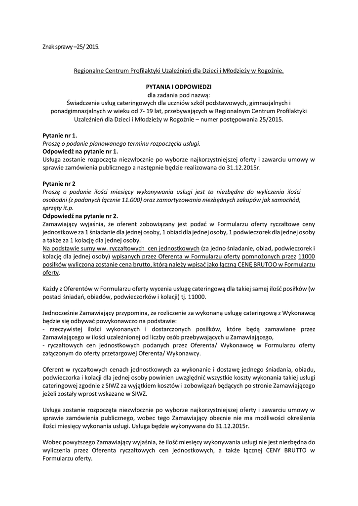 Znak sprawy –25/ 2015. Regionalne Centrum Profilaktyki Uzależnień dla Dzieci i Młodzieży w Rogoźnie. PYTANIA I ODPOWIEDZI dla zadania pod nazwą: Świadczenie usług cateringowych dla uczniów szkół podstawowych, gimnazjalnych i ponadgimnazjalnych w wieku od 7- 19 lat, przebywających w Regionalnym Centrum Profilaktyki Uzależnień dla Dzieci i Młodzieży w Rogoźnie – numer postępowania 25/2015. Pytanie nr 1. Proszę o podanie planowanego terminu rozpoczęcia usługi. Odpowiedź na pytanie nr 1. Usługa zostanie rozpoczęta niezwłocznie po wyborze najkorzystniejszej oferty i zawarciu umowy w sprawie zamówienia publicznego a następnie będzie realizowana do 31.12.2015r. Pytanie nr 2 Proszę o podanie ilości miesięcy wykonywania usługi jest to niezbędne do wyliczenia ilości osobodni (z podanych łącznie 11.000) oraz zamortyzowania niezbędnych zakupów jak samochód, sprzęty it.p. Odpowiedź na pytanie nr 2. Zamawiający wyjaśnia, że oferent zobowiązany jest podać w Formularzu oferty ryczałtowe ceny jednostkowe za 1 śniadanie dla jednej osoby, 1 obiad dla jednej osoby, 1 podwieczorek dla jednej osoby a także za 1 kolację dla jednej osoby. Na podstawie sumy ww. ryczałtowych cen jednostkowych (za jedno śniadanie, obiad, podwieczorek i kolację dla jednej osoby) wpisanych przez Oferenta w Formularzu oferty pomnożonych przez 11000 posiłków wyliczona zostanie cena brutto, którą należy wpisać jako łączną CENĘ BRUTOO w Formularzu oferty. Każdy z Oferentów w Formularzu oferty wycenia usługę cateringową dla takiej samej ilość posiłków (w postaci śniadań, obiadów, podwieczorków i kolacji) tj. 11000. Jednocześnie Zamawiający przypomina, że rozliczenie za wykonaną usługę cateringową z Wykonawcą będzie się odbywać powykonawczo na podstawie: - rzeczywistej ilości wykonanych i dostarczonych posiłków, które będą zamawiane przez Zamawiającego w ilości uzależnionej od liczby osób przebywających u Zamawiającego, - ryczałtowych cen jednostkowych podanych przez Oferenta/ Wykonawcę w Formularzu oferty załączonym do oferty przetargowej Oferenta/ Wykonawcy. Oferent w ryczałtowych cenach jednostkowych za wykonanie i dostawę jednego śniadania, obiadu, podwieczorka i kolacji dla jednej osoby powinien uwzględnić wszystkie koszty wykonania takiej usługi cateringowej zgodnie z SIWZ za wyjątkiem kosztów i zobowiązań będących po stronie Zamawiającego jeżeli zostały wprost wskazane w SIWZ. Usługa zostanie rozpoczęta niezwłocznie po wyborze najkorzystniejszej oferty i zawarciu umowy w sprawie zamówienia publicznego, wobec tego Zamawiający obecnie nie ma możliwości określenia ilości miesięcy wykonania usługi. Usługa będzie wykonywana do 31.12.2015r. Wobec powyższego Zamawiający wyjaśnia, że ilość miesięcy wykonywania usługi nie jest niezbędna do wyliczenia przez Oferenta ryczałtowych cen jednostkowych, a także łącznej CENY BRUTTO w Formularzu oferty. Pytanie nr 3. Proszę o podanie czy żywienie realizowane jest w dni robocze tj.od poniedziałku do piątku czy 7 dni w tygodniu. Odpowiedź na pytanie nr 3. Usługa cateringowa będzie świadczona przez Wykonawcę w dni wskazane przez Zamawiającego w każdorazowych zamówieniach szczegółowych. Wobec powyższego usługa cateringowa będzie realizowana przez Wykonawcę zarówno w dni robocze oraz dni wolne od pracy wskazane przez Zamawiającego. Pytanie nr 4. Proszę o podanie szacunkowej ilości dziennego zapotrzebowania na posiłki (ile żywionych osób średnio dziennie). Odpowiedź na pytanie nr 4. Ilość dziennego zapotrzebowania na posiłki uzależniona będzie od ilości osób przebywających w danym dniu u Zamawiającego. Pytanie nr 5. Proszę o podanie, która ze stron odpowiedzialna jest za zakup zastawy stołowej. Odpowiedź na pytanie nr 5. Zamawiający w swojej siedzibie zapewni zastawę stołową. Pytanie nr 6. Proszę o podanie stawki żywieniowej (koszt jednego osobodnia) aktualnie obowiązującej. Odpowiedź na pytanie nr 6. Zamawiający zwraca uwagę, że pytanie nie dotyczy przedmiotowego postępowania przetargowego. Jednocześnie należy pamiętać, że Oferent dokonując wyceny usługi cateringowej (ryczałtowych cen jednostkowych i łącznej CENY BRUTTO) w niniejszym postępowaniu przetargowym musi uwzględnić wszystkie wymagania Zamawiającego, które szczegółowo został określone w SIWZ i wzorze Umowy. Prosimy, aby dokładnie zapoznać się z wymaganiami Zamawiającego dotyczącymi niniejszego przetargu zawartymi w SIWZ oraz we wzorze Umowy. W szczególności prosimy zauważyć, że: - zestawy posiłków są niezmienne co do rodzaju menu i nie mają charakteru przykładowych, - Wykonawca zobowiązany jest do przygotowywania posiłków o najwyższym standardzie na bazie produktów najwyższej jakości, - Wykonawca dostarczający gotowe posiłki winien zapewnić odpowiednią temperaturę w chwili dostawy i odpowiednie warunki higieniczno-sanitarne dostaw, etc. Zamawiający wyjaśnia, że terminowa dostaw przez Wykonawcę posiłków oraz ich zgodność ze szczegółowymi wymaganiami Zamawiającego zawartymi w SIWZ jest dla Zamawiającego priorytetowa. W sytuacji niewykonania i/lub nienależytego wykonania usługi cateringowej przez Wykonawcę, Zamawiający będzie korzystał z przysługujących Zamawiającemu uprawnień przewidzianych w Umowie oraz w obowiązujących przepisach prawa. Rogoźno dnia 16.04.2015r.