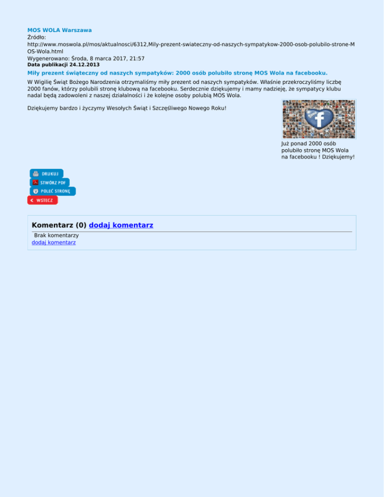 MOS WOLA Warszawa Źródło: http://www.moswola.pl/mos/aktualnosci/6312,Mily-prezent-swiateczny-od-naszych-sympatykow-2000-osob-polubilo-strone-M OS-Wola.html Wygenerowano: Środa, 8 marca 2017, 21:57 Data publikacji 24.12.2013 Miły prezent świąteczny od naszych sympatyków: 2000 osób polubiło stronę MOS Wola na facebooku. W Wigilię Świąt Bożego Narodzenia otrzymaliśmy miły prezent od naszych sympatyków. Właśnie przekroczyliśmy liczbę 2000 fanów, którzy polubili stronę klubową na facebooku. Serdecznie dziękujemy i mamy nadzieję, że sympatycy klubu nadal będą zadowoleni z naszej działalności i że kolejne osoby polubią MOS Wola. Dziękujemy bardzo i życzymy Wesołych Świąt i Szczęśliwego Nowego Roku! Już ponad 2000 osób polubiło stronę MOS Wola na facebooku ! Dziękujemy! Komentarz (0) dodaj komentarz Brak komentarzy dodaj komentarz