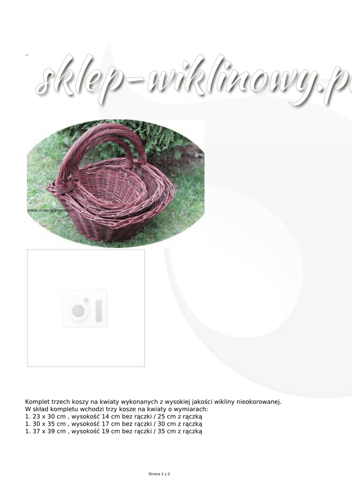 Komplet trzech koszy na kwiaty wykonanych z wysokiej jakości wikliny nieokorowanej. W skład kompletu wchodzi trzy kosze na kwiaty o wymiarach: 1. 23 x 30 cm , wysokość 14 cm bez rączki / 25 cm z rączką 1. 30 x 35 cm , wysokość 17 cm bez rączki / 30 cm z rączką 1. 37 x 39 cm , wysokość 19 cm bez rączki / 35 cm z rączką Strona 1 z 2 Strona 2 z 2