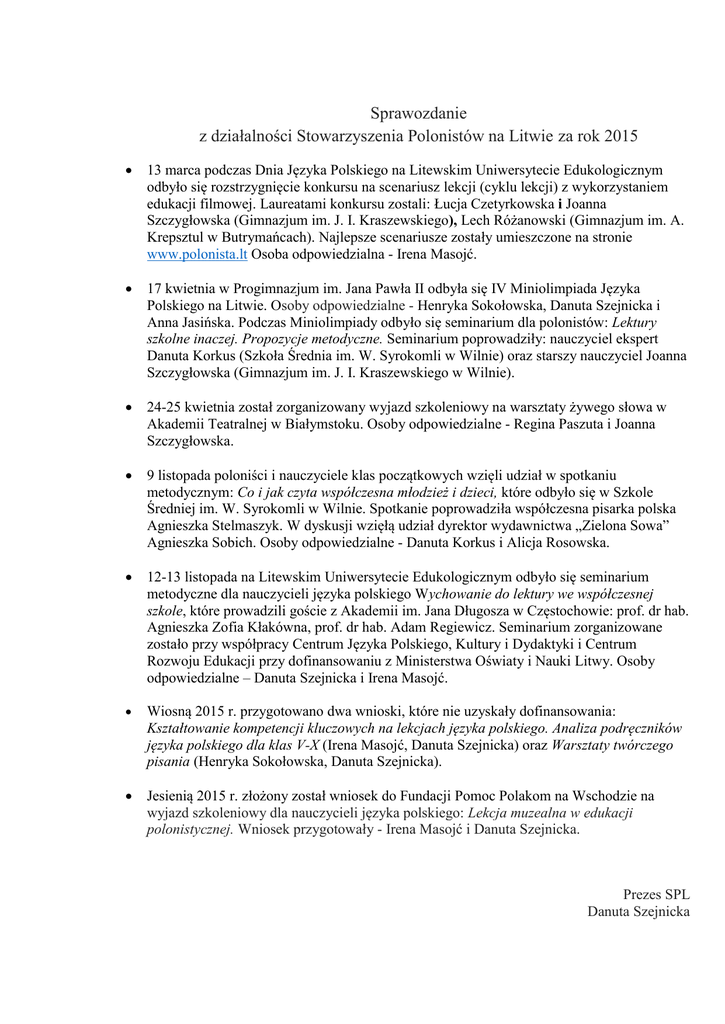 Sprawozdanie z działalności Stowarzyszenia Polonistów na Litwie za rok 2015 13 marca podczas Dnia Języka Polskiego na Litewskim Uniwersytecie Edukologicznym odbyło się rozstrzygnięcie konkursu na scenariusz lekcji (cyklu lekcji) z wykorzystaniem edukacji filmowej. Laureatami konkursu zostali: Łucja Czetyrkowska i Joanna Szczygłowska (Gimnazjum im. J. I. Kraszewskiego), Lech Różanowski (Gimnazjum im. A. Krepsztul w Butrymańcach). Najlepsze scenariusze zostały umieszczone na stronie www.polonista.lt Osoba odpowiedzialna - Irena Masojć. 17 kwietnia w Progimnazjum im. Jana Pawła II odbyła się IV Miniolimpiada Języka Polskiego na Litwie. Osoby odpowiedzialne - Henryka Sokołowska, Danuta Szejnicka i Anna Jasińska. Podczas Miniolimpiady odbyło się seminarium dla polonistów: Lektury szkolne inaczej. Propozycje metodyczne. Seminarium poprowadziły: nauczyciel ekspert Danuta Korkus (Szkoła Średnia im. W. Syrokomli w Wilnie) oraz starszy nauczyciel Joanna Szczygłowska (Gimnazjum im. J. I. Kraszewskiego w Wilnie). 24-25 kwietnia został zorganizowany wyjazd szkoleniowy na warsztaty żywego słowa w Akademii Teatralnej w Białymstoku. Osoby odpowiedzialne - Regina Paszuta i Joanna Szczygłowska. 9 listopada poloniści i nauczyciele klas początkowych wzięli udział w spotkaniu metodycznym: Co i jak czyta współczesna młodzież i dzieci, które odbyło się w Szkole Średniej im. W. Syrokomli w Wilnie. Spotkanie poprowadziła współczesna pisarka polska Agnieszka Stelmaszyk. W dyskusji wzięłą udział dyrektor wydawnictwa „Zielona Sowa” Agnieszka Sobich. Osoby odpowiedzialne - Danuta Korkus i Alicja Rosowska. 12-13 listopada na Litewskim Uniwersytecie Edukologicznym odbyło się seminarium metodyczne dla nauczycieli języka polskiego Wychowanie do lektury we współczesnej szkole, które prowadzili goście z Akademii im. Jana Długosza w Częstochowie: prof. dr hab. Agnieszka Zofia Kłakówna, prof. dr hab. Adam Regiewicz. Seminarium zorganizowane zostało przy współpracy Centrum Języka Polskiego, Kultury i Dydaktyki i Centrum Rozwoju Edukacji przy dofinansowaniu z Ministerstwa Oświaty i Nauki Litwy. Osoby odpowiedzialne – Danuta Szejnicka i Irena Masojć. Wiosną 2015 r. przygotowano dwa wnioski, które nie uzyskały dofinansowania: Kształtowanie kompetencji kluczowych na lekcjach języka polskiego. Analiza podręczników języka polskiego dla klas V-X (Irena Masojć, Danuta Szejnicka) oraz Warsztaty twórczego pisania (Henryka Sokołowska, Danuta Szejnicka). Jesienią 2015 r. złożony został wniosek do Fundacji Pomoc Polakom na Wschodzie na wyjazd szkoleniowy dla nauczycieli języka polskiego: Lekcja muzealna w edukacji polonistycznej. Wniosek przygotowały - Irena Masojć i Danuta Szejnicka. Prezes SPL Danuta Szejnicka