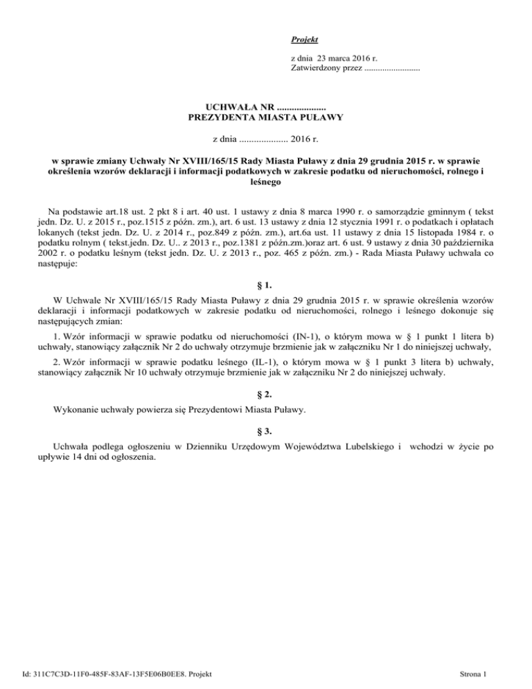 Projekt z dnia 23 marca 2016 r. Zatwierdzony przez ......................... UCHWAŁA NR .................... PREZYDENTA MIASTA PUŁAWY z dnia .................... 2016 r. w sprawie zmiany Uchwały Nr XVIII/165/15 Rady Miasta Puławy z dnia 29 grudnia 2015 r. w sprawie określenia wzorów deklaracji i informacji podatkowych w zakresie podatku od nieruchomości, rolnego i leśnego Na podstawie art.18 ust. 2 pkt 8 i art. 40 ust. 1 ustawy z dnia 8 marca 1990 r. o samorządzie gminnym ( tekst jedn. Dz. U. z 2015 r., poz.1515 z późn. zm.), art. 6 ust. 13 ustawy z dnia 12 stycznia 1991 r. o podatkach i opłatach lokanych (tekst jedn. Dz. U. z 2014 r., poz.849 z późn. zm.), art.6a ust. 11 ustawy z dnia 15 listopada 1984 r. o podatku rolnym ( tekst.jedn. Dz. U.. z 2013 r., poz.1381 z późn.zm.)oraz art. 6 ust. 9 ustawy z dnia 30 października 2002 r. o podatku leśnym (tekst jedn. Dz. U. z 2013 r., poz. 465 z późn. zm.) - Rada Miasta Puławy uchwala co następuje: § 1. W Uchwale Nr XVIII/165/15 Rady Miasta Puławy z dnia 29 grudnia 2015 r. w sprawie określenia wzorów deklaracji i informacji podatkowych w zakresie podatku od nieruchomości, rolnego i leśnego dokonuje się następujących zmian: 1. Wzór informacji w sprawie podatku od nieruchomości (IN-1), o którym mowa w § 1 punkt 1 litera b) uchwały, stanowiący załącznik Nr 2 do uchwały otrzymuje brzmienie jak w załączniku Nr 1 do niniejszej uchwały, 2. Wzór informacji w sprawie podatku leśnego (IL-1), o którym mowa w § 1 punkt 3 litera b) uchwały, stanowiący załącznik Nr 10 uchwały otrzymuje brzmienie jak w załączniku Nr 2 do niniejszej uchwały. § 2. Wykonanie uchwały powierza się Prezydentowi Miasta Puławy. § 3. Uchwała podlega ogłoszeniu w Dzienniku Urzędowym Województwa Lubelskiego i wchodzi w życie po upływie 14 dni od ogłoszenia. Id: 311C7C3D-11F0-485F-83AF-13F5E06B0EE8. Projekt Strona 1 WYPEŁNIAû NA MASZYNIE, KOMPUTEROWO LUB RĉCZNIE, DUĩYMI DRUKOWANYMI LITERAMI, CZARNYM LUB NIEBIESKIM KOLOREM. 1. Dotyczy nieruchomoĞci połoĪonej 2. Nr ewidencyjny Załącznik Nr 1 do Uchwały Nr Rady Miasta Puławy z dnia BBBBBBBBBBBBBBBBBBBB IN-1 INFORMACJA W SPRAWIE PODATKU OD NIERUCHOMOĝCI 3. Rok __ __ __ __ Podstawa prawna: Ustawa z dnia 12 stycznia 1991 r. o podatkach i opłatach lokalnych (tekst jedn.. Dz. U. z 2014 r., poz. 849 z póĨn. Składający: Formularz przeznaczony dla osób fizycznych bĊdących właĞcicielami nieruchomoĞci lub obiektów budowlanych, zm.). posiadaczami samoistnymi nieruchomoĞci lub obiektów budowlanych, uĪytkownikami wieczystymi gruntów, posiadaczami nieruchomoĞci lub ich czĊĞci albo obiektów budowlanych lub ich czĊĞci, stanowiących własnoĞü Skarbu PaĔstwa lub jednostki samorządu terytorialnego. Termin składania: W terminie 14 dni od zaistnienia okolicznoĞci mających wpływ na powstanie (wygaĞniĊcie) obowiązku podatkowego, lub wysokoĞü opodatkowania. Miejsce składania: Organ podatkowy właĞciwy ze wzglĊdu na miejsce połoĪenia przedmiotu opodatkowania. A. MIEJSCE SKŁADANIA INFORMACJI 4. Nazwa i adres siedziby organu podatkowego Prezydent Miasta Puławy 24-100 Puławy, ul. Lubelska 5 . B. OBOWIĄZEK ZŁOĩENIA INFORMACJI 5. OkolicznoĞci powodujące obowiązek złoĪenia informacji (zaznaczyü właĞciwy kwadrat): 1. informacja składana po raz pierwszy C. 2. zmiana informacji obowiązująca od: __ __ - __ __ - __ __ __ __ _ DANE PODATNIKA C.1. DANE IDENTYFIKACYJNE 6. Nazwisko 7. Pierwsze imiĊ, drugie imiĊ 8. Numer PESEL __ __ __ __ __ __ __ __ __ __ __ 9. Data urodzenia 10. ImiĊ ojca 11. ImiĊ matki __-__-____ C.2. ADRES ZAMIESZKANIA 12. Kraj 15. Gmina 13. Województwo 14. Powiat 16. Ulica 19. MiejscowoĞü 17. Nr domu 20. Kod pocztowy 18. Nr lokalu 21. Poczta C.3. DANE IDENTYFIKACYJNE WSPÓŁMAŁĩONKA (naleĪy wypełniü, gdy nieruchomoĞü stanowi małĪeĔską wspólnoĞü ustawową) 22. Nazwisko, pierwsze imiĊ, drugie imiĊ, data urodzenia 23. ImiĊ ojca, imiĊ matki 24. Numer PESEL __ __ __ __ __ __ __ __ __ __ __ C.4. ADRES ZAMIESZKANIA WSPÓŁMAĩONKA 25. Kraj 28. Gmina 26. Województwo 29. Ulica 32. MiejscowoĞü 27. Powiat 30. Nr domu 33. Kod pocztowy 31. Nr lokalu 34. Poczta IN-1 Id: 311C7C3D-11F0-485F-83AF-13F5E06B0EE8. Projekt 1/4 Strona 2 WYPEŁNIAû NA MASZYNIE, KOMPUTEROWO LUB RĉCZNIE, DUĩYMI DRUKOWANYMI LITERAMI, CZARNYM LUB NIEBIESKIM KOLOREM. D. DANE O NIERUCHOMOĝCIACH I OBIEKTACH BUDOWLANYCH PODLEGAJĄCYCH OPODATKOWANIU D. 1. DATA NABYCIA (zawarcia umowy): D. 2. POŁOĩENIE NIERUCHOMOĝCI 35. PołoĪenie nieruchomoĞci (adres) D. 3. TYTUŁ PRAWNY (zaznaczyü właĞciwy kwadrat): 36. Rodzaj własnoĞci 37. Rodzaj posiadania samoistnego 1. własnoĞü 2. współwłasnoĞü 38. Rodzaj uĪytkowania 1. uĪytkowanie wieczyste 1. posiadanie 2. współposiadanie 2. współposiadanie 39. Rodzaj posiadania zaleĪnego 2. współuĪytkowanie 1. posiadanie D. 4. IDENTYFIKATORY GEODEZYJNE DZIAŁEK, BUDYNKÓW, LOKALI 1) 40. Działki 41. Budynki 42. Lokale E. DANE DOTYCZĄCE PRZEDMIOTÓW OPODATKOWANIA NIEPODLEGAJĄCYCH ZWOLNIENIU Podstawa opodatkowania w m2 (ha) z dokładnoĞcią do 1 m2 E.1. POWIERZCHNIA GRUNTÓW 1. Grunty związane z prowadzeniem działalnoĞci gospodarczej, bez wzglĊdu na sposób zakwalifikowania w ewidencji gruntów i budynków 43. 2. Grunty pod wodami powierzchniowymi stojącymi lub pod wodami powierzchniowymi płynącymi jezior i zbiorników sztucznych 2) 44. m2 , 3.Grunty niezabudowane objĊte obszarem rewitalizacji, o którym mowa w ustawie z dnia 9 paĨdziernika 2015 r. o 45. rewitalizacji i połoĪone na terenach, dla których miejscowy plan zagospodarowania przestrzennego przewiduje przeznaczenie pod zabudowĊ mieszkaniową, usługową albo zabudowĊ o przeznaczeniu mieszanym obejmującym wyłącznie te rodzaje zabudowy, jeĪeli od dnia wejĞcia w Īycie tego planu w odniesieniu do tych gruntów upłynął okres 4 lat, a w tym czasie nie zakoĔczono budowy zgodnie z przepisami prawa budowlanego 4. Po