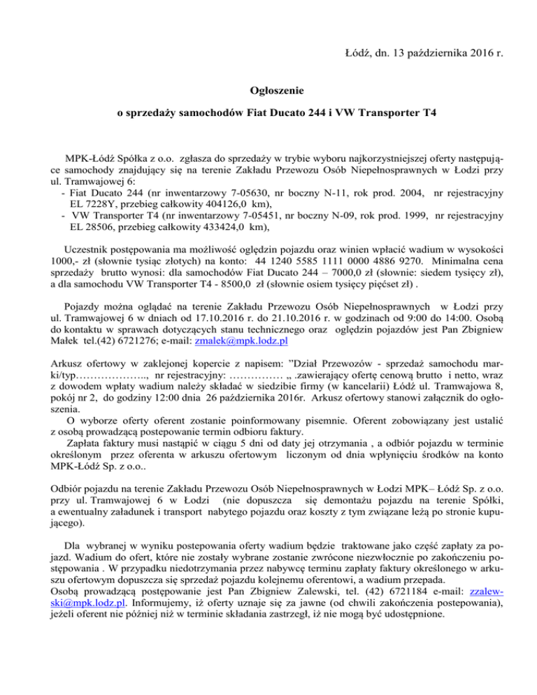 Łódź, dn. 13 października 2016 r. Ogłoszenie o sprzedaży samochodów Fiat Ducato 244 i VW Transporter T4 MPK-Łódź Spółka z o.o. zgłasza do sprzedaży w trybie wyboru najkorzystniejszej oferty następujące samochody znajdujący się na terenie Zakładu Przewozu Osób Niepełnosprawnych w Łodzi przy ul. Tramwajowej 6: - Fiat Ducato 244 (nr inwentarzowy 7-05630, nr boczny N-11, rok prod. 2004, nr rejestracyjny EL 7228Y, przebieg całkowity 404126,0 km), - VW Transporter T4 (nr inwentarzowy 7-05451, nr boczny N-09, rok prod. 1999, nr rejestracyjny EL 28506, przebieg całkowity 433424,0 km), Uczestnik postępowania ma możliwość oględzin pojazdu oraz winien wpłacić wadium w wysokości 1000,- zł (słownie tysiąc złotych) na konto: 44 1240 5585 1111 0000 4886 9270. Minimalna cena sprzedaży brutto wynosi: dla samochodów Fiat Ducato 244 – 7000,0 zł (słownie: siedem tysięcy zł), a dla samochodu VW Transporter T4 - 8500,0 zł (słownie osiem tysięcy pięćset zł) . Pojazdy można oglądać na terenie Zakładu Przewozu Osób Niepełnosprawnych w Łodzi przy ul. Tramwajowej 6 w dniach od 17.10.2016 r. do 21.10.2016 r. w godzinach od 9:00 do 14:00. Osobą do kontaktu w sprawach dotyczących stanu technicznego oraz oględzin pojazdów jest Pan Zbigniew Małek tel.(42) 6721276; e-mail: [email protected] Arkusz ofertowy w zaklejonej kopercie z napisem: ”Dział Przewozów - sprzedaż samochodu marki/typ……………….., nr rejestracyjny: …………… „ .zawierający ofertę cenową brutto i netto, wraz z dowodem wpłaty wadium należy składać w siedzibie firmy (w kancelarii) Łódź ul. Tramwajowa 8, pokój nr 2, do godziny 12:00 dnia 26 października 2016r. Arkusz ofertowy stanowi załącznik do ogłoszenia. O wyborze oferty oferent zostanie poinformowany pisemnie. Oferent zobowiązany jest ustalić z osobą prowadzącą postepowanie termin odbioru faktury. Zapłata faktury musi nastąpić w ciągu 5 dni od daty jej otrzymania , a odbiór pojazdu w terminie określonym przez oferenta w arkuszu ofertowym liczonym od dnia wpłynięciu środków na konto MPK-Łódź Sp. z o.o.. Odbiór pojazdu na terenie Zakładu Przewozu Osób Niepełnosprawnych w Łodzi MPK– Łódź Sp. z o.o. przy ul. Tramwajowej 6 w Łodzi (nie dopuszcza się demontażu pojazdu na terenie Spółki, a ewentualny załadunek i transport nabytego pojazdu oraz koszty z tym związane leżą po stronie kupującego). Dla wybranej w wyniku postepowania oferty wadium będzie traktowane jako część zapłaty za pojazd. Wadium do ofert, które nie zostały wybrane zostanie zwrócone niezwłocznie po zakończeniu postępowania . W przypadku niedotrzymania przez nabywcę terminu zapłaty faktury określonego w arkuszu ofertowym dopuszcza się sprzedaż pojazdu kolejnemu oferentowi, a wadium przepada. Osobą prowadzącą postępowanie jest Pan Zbigniew Zalewski, tel. (42) 6721184 e-mail: [email protected]. Informujemy, iż oferty uznaje się za jawne (od chwili zakończenia postepowania), jeżeli oferent nie później niż w terminie składania zastrzegł, iż nie mogą być udostępnione. Arkusz ofertowy Łódź dn. ............................................... .......................................................................................................................................................... imię, nazwisko/nazwa oferenta .......................................................................................................................................................... Adres zamieszkania / adres siedziby podmiotu gospodarczego .............................................................. NIP (oferenta)* .............................................................. KRS/Zaświadczenie o wpisie do ewidencji* 1. Za pojazd będący przedmiotem postępowania - ……………………………… nr. rejestracyjny………………..oferuję kwotę brutto …………. zł co stanowi kwotę netto ………….. zł.. 2. Ponadto oświadczam, co następuje: Osobiście zapoznałem się /nie zapoznałem się ze stanem technicznym pojazdu, który jest przedmiotem mojego zainteresowania i nie będę wnosił zastrzeżeń przy jego odbiorze. W przypadku wybrania mojej oferty, zobowiązuję się do odbioru pojazdu w ciągu ....... dni od daty wpłynięcia środków na konto MPK-Łódź Sp. z o.o. Zobowiązuję się do okazania przy odbiorze pojazdu dowodu zapłaty kwoty widniejącej na fakturze. .................................................. Podpis oferenta * dotyczy podmiotów gospodarczych