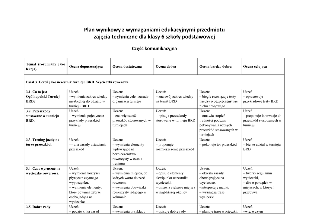 Plan wynikowy z wymaganiami edukacyjnymi przedmiotu zajęcia techniczne dla klasy 6 szkoły podstawowej Część komunikacyjna Temat (rozumiany jako lekcja) Ocena dopuszczająca Ocena dostateczna Ocena dobra Ocena bardzo dobra Ocena celująca Uczeń: ‒ biegle rozwiązuje testy wiedzy o bezpieczeństwie ruchu drogowego Uczeń: ‒ omawia stopień trudności podczas pokonywania różnych przeszkód stosowanych w turniejach Uczeń: ‒ pokonuje tor przeszkód Uczeń: ‒ opracowuje przykładowe testy BRD Dział 3. Uczeń jako uczestnik turnieju BRD. Wycieczki rowerowe Uczeń: ‒wymienia zakres wiedzy niezbędnej do udziału w turnieju BRD Uczeń: ‒ wymienia pojedyncze przykłady przeszkód turnieju Uczeń: ‒wymienia cele i zasady organizacji turnieju Uczeń: ‒ zna swój zakres wiedzy na temat BRD Uczeń: ‒ zna większość przeszkód stosowanych w turniejach Uczeń: ‒ opisuje przeszkody stosowane w turnieju BRD 3.3. Trening jazdy na torze przeszkód. Uczeń: –– zna zasady ustawiania przeszkód Uczeń: ‒ proponuje rozmieszczenie przeszkód 3.4. Czas wyruszać na wycieczkę rowerową. Uczeń: ‒ wymienia korzyści płynące z czynnego wypoczynku, ‒ wymienia elementy, które powinna zabrać osoba jadąca na wycieczkę Uczeń: ‒ podaje kilka zasad Uczeń: ‒ wymienia elementy wpływające na bezpieczeństwo rowerzysty w czasie treningu Uczeń: ‒ wymienia miejsca, do których warto dotrzeć rowerem, ‒ wymienia obowiązki rowerzysty jadącego w kolumnie Uczeń: ‒ opisuje elementy ekwipunku uczestnika wycieczki, ‒ omawia ciekawe miejsca w najbliższej okolicy Uczeń: ‒ określa zasady obowiązujące na wycieczce, ‒interpretuje mapki, ‒ wyznacza trasę wycieczki Uczeń: ‒ tworzy regulamin wycieczki, ‒ dba o porządek w miejscach, w których przebywa Uczeń: ‒ wymienia przykłady Uczeń: ‒ opisuje dobre rady Uczeń: ‒ planuje trasę wycieczki, Uczeń: ‒wie, o czym 3.1. Co to jest Ogólnopolski Turniej BRD? 3.2. Przeszkody stosowane w turnieju BRD. 3.5. Dobre rady Uczeń: ‒ proponuje innowacje do przeszkód stosowanych w turnieju Uczeń: ‒ bierze udział w turnieju BRD 3.6. Bezpieczne wakacje wpływających na bezpieczeństwo uczestnika wycieczki dobrych rad przydatnych rowerzyście przydatne rowerzyście w czasie wycieczki ‒ planuje organizację wyjazdu na wycieczkę poinformować uczestników wycieczki Uczeń: ‒ podaje przykłady spędzania wolnego czasu Uczeń: ‒ wymienia zagrożenia wynikające z nieodpowiedniego zachowania Uczeń: ‒ opisuje bezpieczne zachowania w określonych sytuacjach Uczeń: ‒ określa konsekwencje niewłaściwego postępowania Uczeń: ‒ określa niebezpieczne sytuacje i wie, jak ich uniknąć Ocena dostateczna Ocena dobra Ocena bardzo dobra Ocena celująca Uczeń: ‒ zna pojęcia: „rzut prostokątny”, „rzutnia”, „płaszczyzna główna”, ‒ rysuje przedmiot w rzucie prostokątnym Uczeń: ‒ zna pojęcie „rzut aksonometryczny”, ‒ analizuje poszczególne rzuty, ‒ rysuje przedmioty w rzutach aksonometrycznych za pomocą przyrządów geometrycznych Uczeń: ‒ omawia etapy i zasady rzutowania, stosuje je w praktyce, ‒ biegle rysuje przedmioty w rzutach prostokątnych Uczeń: ‒ omawia etapy i zasady rzutowania, stosuje je w praktyce, ‒ zna zasady i etapy rzutowania, ‒korzysta z przyrządów geometrycznych do sporządzania rysunków aksonometrycznych Uczeń: ‒ wykonuje rzutowanie prostokątne skomplikowanych przedmiotów Uczeń: – omawia materiały włókiennicze i ich Uczeń: – określa najważniejsze cechy materiałów Uczeń: – omawia zalety i wady materiałów Część techniczna Temat (rozumiany jako lekcja) Ocena dopuszczająca Dział 2. Mój pierwszy rysunek techniczny 2.5. Podstawowe zasady rzutowania prostokątnego. Uczeń: ‒ rozpoznaje rodzaje rzutów, ‒ podaje zasady rzutowania Uczeń: ‒ analizuje poszczególne rzuty, ‒ rysuje przedmiot w rzucie prostokątnym 2.6. Podstawowe zasady rzutowania aksonometrycznego. Uczeń: ‒ rozpoznaje i wskazuje rodzaje rzutów, ‒ podaje zasady rzutowania Uczeń: ‒ analizuje poszczególne rzuty, ‒ rysuje przedmiot w rzucie prostokątnym, ‒ rozpoznaje prawidłowo narysowane rzuty Uczeń: ‒ wykonuje rzutowanie skomplikowanych przedmiotów, ‒ na podstawie dwóch rzutów wykreśla trzeci rzut, ‒ na podstawie rzutów prostokątnych rysuje przedmiot w aksonometrii Dział 6. Materiały włókiennicze 6.1 Rodzaje materiałów włókienniczych. Uczeń: – wymienia materiały włókiennicze Uczeń: – rozróżnia materiały włókiennicze 6.2 Pochodzenie i zastosowanie włókien Uczeń: – zna rośliny i zwierzęta, z których uzyskuje się włókna Uczeń: – opisuje rodzaje materiałów włókienniczych 6.3 Wyrób tkanin i dzianin. Uczeń: – zna rodzaje materiałów włókienniczych Uczeń: – wyjaśnia pojęcie tkanina i dzianina – podaje przykłady tkaniny i dzianiny 6.4 Konserwacja odzieży. Jak czytać metki. Uczeń: – rozumie konieczność dbania o odzież – wie, gdzie przekazać niepotrzebną odzież 6.5 Pralka – budowa i użytkowanie Uczeń: – wymienia funkcje pralki 6.6 Żelazko – budowa i działanie. Uczeń: – wymienia funkcje żelazka – przedstawia dane znajdujące się na tabliczce znamionowej Uczeń: – odczytuje symbole stosowane na metkach – jest świadom konieczności ochrony środowiska poprzez ponowne wykorzystanie odzieży – omawia znaczenie wiedzy o składzie materiału Uczeń: – wymienia rodzaje pralek – czyta i posługuje się instrukcją obsługi Uczeń: – czyta i posługuje się instrukcją obsługi zastosowanie Uczeń: – wymienia etapy otrzymywania włókien – omawia rodzaje nitek Uczeń: – omawia sposób otrzymywania tkaniny i dzianiny – omawia budowę krosna tkackiego – wymienia rodzaje splotów tkackich i dziewiarskich Uczeń: – podaje objaśnienia symboli na metkach ubraniowych – wymienia kolory nitek oznaczających skład materiału Uczeń: –