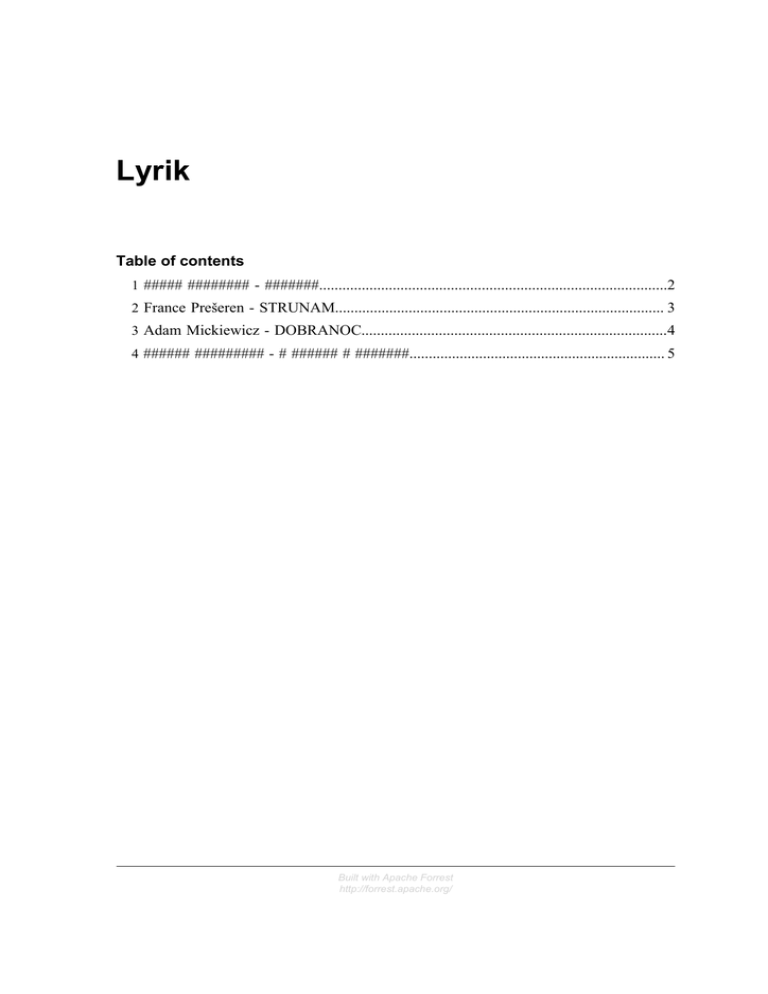 Lyrik Table of contents 1 ##### ######## - #######..........................................................................................2 2 France Prešeren - STRUNAM..................................................................................... 3 3 Adam Mickiewicz - DOBRANOC...............................................................................4 4 ###### ######### - # ###### # #######.................................................................. 5 Built with Apache Forrest http://forrest.apache.org/ Lyrik 1 ##### ######## - ####### ## ####, ## ######### #### ## ######, ##### ##### ########, ## ####### #####, ### #### ##########, # ######, # ##### #### #####, #### ####, ## #### #######. ## ###### # ####### # ##### #### #### ######... ##### # # #### # #### — ### ###### # ###### ## ###### #### ########... # ## #### — # ## #### ####. ######### ## #########. ####### ####### # ###### #### ####'# #### ########. # #### # ###'# #######, # ###'# #######, ##### ## ######## ###'##### ###### ##### ######. 2 Built with Apache Forrest http://forrest.apache.org/ Lyrik 25 ###### 1845 # ########## 2 France Prešeren - STRUNAM Strune! milo se glasite, milo, pesmica! žaluj; s#ca bole#ine skrite trdosr#ni oznanjuj: kak bledí mi moje lice, kak umira lu# o#i, kak tekó iz njih solzice, ki ljubezen jih rodi; od željá kako zdihuje, po nji hrepeni srce, kak mu je veselje tuje, kak od sre#e ni# ne ve; kak s seboj me vedno vle#e, koder hodi, njen obraz, kak obli#je nje cvete#e v srcu nosim vsaki #as; in kak vé, ki bi nje hvalo rade pele zanapréj, ak se ne usmili kmalo, mór'te utíhnit vekoméj! Té in take vé nosíte tožbe, strune! tje do nje; ako mór'te, ome#íte Built with Apache Forrest http://forrest.apache.org/ 3 Lyrik neusmiljeno srcé. 3 Adam Mickiewicz - DOBRANOC Dobranoc! ju# dzi# wi#cej nie b#dziem bawili, Niech snu anio# modrymi skrzyd#y ci# otoczy, Dobranoc! niech odpoczn# po #zach twoje oczy, Dobranoc! niech si# serce pokojem zasili. Dobranoc! z ka#dej ze mn# przemówionej chwili Niech zostanie d#wi#k jaki# cichy i uroczy, Niechaj gra w twoim uchu, a gdy my#l zamroczy, Niech si# mój obraz sennym #renicom przymili. Dobranoc! obró# jeszcze raz na mnie ocz#ta, Pozwól lica. - Dobranoc! - Chcesz na s#ugi klasn##? Daj mi pier# uca#owa#. - Dobranoc! zapi#ta. - Dobranoc! ju# uciek#a# i drzwi chcesz zatrzasn##. Dobranoc ci przez klamk# - niestety! zamkni#ta! Powtarzaj#c: dobranoc! nie da#bym ci zasn##. 4 Built with Apache Forrest http://forrest.apache.org/ Lyrik 4 ###### ######### - # ###### # ####### # ######## # ########, # ####### ##### ####### # ####### ######### #########... ########!.. ### ####### ######### # ###### #######?.. # ##### ######### – ### ####### #####! #######... ## ##### ##?.. ## ###### – ## ###### ######, # ###### ####### ###########. # ##### ## ##########? – ### ######### #### # ######: # ########, # #####, # #### ### #########... ### ########? – #### ##### ### ####### ## ######## ###### ######### ### ###### #########; # ######, ### ########### # ######### ########## ####### – ###### ####### # ####### ######... Built with Apache Forrest http://forrest.apache.org/ 5