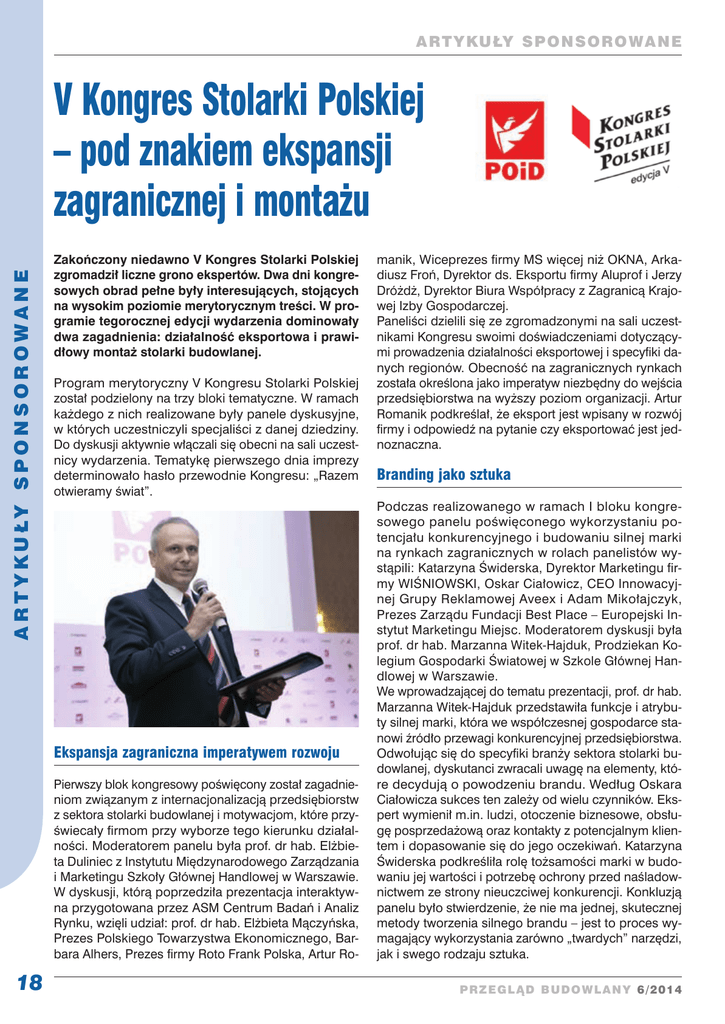 ARTYKUŁY SPON S OROWANE A R T Y K U ŁY S P ON S O R OWANE V Kongres Stolarki Polskiej – pod znakiem ekspansji zagranicznej i montażu Zakończony niedawno V Kongres Stolarki Polskiej zgromadził liczne grono ekspertów. Dwa dni kongresowych obrad pełne były interesujących, stojących na wysokim poziomie merytorycznym treści. W programie tegorocznej edycji wydarzenia dominowały dwa zagadnienia: działalność eksportowa i prawidłowy montaż stolarki budowlanej. Program merytoryczny V Kongresu Stolarki Polskiej został podzielony na trzy bloki tematyczne. W ramach każdego z nich realizowane były panele dyskusyjne, w których uczestniczyli specjaliści z danej dziedziny. Do dyskusji aktywnie włączali się obecni na sali uczestnicy wydarzenia. Tematykę pierwszego dnia imprezy determinowało hasło przewodnie Kongresu: „Razem otwieramy świat”. Ekspansja zagraniczna imperatywem rozwoju Pierwszy blok kongresowy poświęcony został zagadnieniom związanym z internacjonalizacją przedsiębiorstw z sektora stolarki budowlanej i motywacjom, które przyświecały firmom przy wyborze tego kierunku działalności. Moderatorem panelu była prof. dr hab. Elżbieta Duliniec z Instytutu Międzynarodowego Zarządzania i Marketingu Szkoły Głównej Handlowej w Warszawie. W dyskusji, którą poprzedziła prezentacja interaktywna przygotowana przez ASM Centrum Badań i Analiz Rynku, wzięli udział: prof. dr hab. Elżbieta Mączyńska, Prezes Polskiego Towarzystwa Ekonomicznego, Barbara Alhers, Prezes firmy Roto Frank Polska, Artur Ro- 18 manik, Wiceprezes firmy MS więcej niż OKNA, Arkadiusz Froń, Dyrektor ds. Eksportu firmy Aluprof i Jerzy Dróżdż, Dyrektor Biura Współpracy z Zagranicą Krajowej Izby Gospodarczej. Paneliści dzielili się ze zgromadzonymi na sali uczestnikami Kongresu swoimi doświadczeniami dotyczącymi prowadzenia działalności eksportowej i specyfiki danych regionów. Obecność na zagranicznych rynkach została określona jako imperatyw niezbędny do wejścia przedsiębiorstwa na wyższy poziom organizacji. Artur Romanik podkreślał, że eksport jest wpisany w rozwój firmy i odpowiedź na pytanie czy eksportować jest jednoznaczna. Branding jako sztuka Podczas realizowanego w ramach I bloku kongresowego panelu poświęconego wykorzystaniu potencjału konkurencyjnego i budowaniu silnej marki na rynkach zagranicznych w rolach panelistów wystąpili: Katarzyna Świderska, Dyrektor Marketingu firmy WIŚNIOWSKI, Oskar Ciałowicz, CEO Innowacyjnej Grupy Reklamowej Aveex i Adam Mikołajczyk, Prezes Zarządu Fundacji Best Place – Europejski Instytut Marketingu Miejsc. Moderatorem dyskusji była prof. dr hab. Marzanna Witek-Hajduk, Prodziekan Kolegium Gospodarki Światowej w Szkole Głównej Handlowej w Warszawie. We wprowadzającej do tematu prezentacji, prof. dr hab. Marzanna Witek-Hajduk przedstawiła funkcje i atrybuty silnej marki, która we współczesnej gospodarce stanowi źródło przewagi konkurencyjnej przedsiębiorstwa. Odwołując się do specyfiki branży sektora stolarki budowlanej, dyskutanci zwracali uwagę na elementy, które decydują o powodzeniu brandu. Według Oskara Ciałowicza sukces ten zależy od wielu czynników. Ekspert wymienił m.in. ludzi, otoczenie biznesowe, obsługę posprzedażową oraz kontakty z potencjalnym klientem i dopasowanie się do jego oczekiwań. Katarzyna Świderska podkreśliła rolę tożsamości marki w budowaniu jej wartości i potrzebę ochrony przed naśladownictwem ze strony nieuczciwej konkurencji. Konkluzją panelu było stwierdzenie, że nie ma jednej, skutecznej metody tworzenia silnego brandu – jest to proces wymagający wykorzystania zarówno „twardych” narzędzi, jak i swego rodzaju sztuka. PRz eg l Ąd bu d owl any 6/2014 A R T Y KU ŁY S P ONSOROWANE Polowanie w grupie Rezolucje kongresowe mowy podsumował Janusz Komurkiewicz, który stwierdził, że aby prowadzić skuteczną ekspansję na skalę międzynarodową, rodzime firmy powinny ze sobą ściśle współpracować i „polować w grupie”. Wymaga to także odpowiedniego wsparcia instytucji rządowych. Dzięki temu silniejsza będzie cała polska gospodarka. Prawidłowy montaż stolarki to podstawa III blok Kongresu, realizowany w drugim dniu wydarzenia w całości został poświęcony niezwykle istotnej z perspektywy funkcjonowania branży, tematyce prawidłowego montażu stolarki, związanych z nią regulacji i obowiązków przedsiębiorców. Moderatorem dysPR zeglĄ d bu d ow l an y 6/2014 Kongres zakończyło sformułowanie rezolucji, które wyznaczają dalsze kierunki funkcjonowania Związku POiD i wpływają na rozwój całej branży. Zgodnie z wnioskami płynącymi z dyskusji w trakcie paneli ustalono, że zorganizowane zostanie spotkanie z przedstawicielami Ministerstwa Infrastruktury i Rozwoju w celu przedyskutowania zapisów w warunkach technicznych dotyczących montażu stolarki budowlanej. Podobne spotkanie w gronie reprezentantów branży poświęcone będzie konsultacjom instrukcji montażu stolarki opracowanej przez Instytut Techniki Budowlanej. Uzgodniono także potrzebę cyklicznych rozmów ze środowiskiem architektów na temat prawidłowego montażu stolarki w projektach budowlanych oraz konsultacje z Ministerstwem Edukacji Narodowej odnośnie możliwości stworzenia zawodu montażysty stolarki budowlanej i rozpoczęcia procesu kształcenia w szkołach budowlanych w tym zakresie. Zgodnie z rezolucjami, przedmiotem spotkania w środowisku reprezentantów sektora będzie także Branżowy Program Promocji polskiej stolarki budowlanej na rynkach zagranicznych na lata 2015–2020. A R T Y K U ŁY S P ON S O R OWANE W trakcie pierwszego dnia obrad realizowany był również II blok kongresowy, dotyczący doświadczeń polskich liderów z działania na rynkach zagranicznych i przygotowania do prowadzenia tego typu aktywności. W roli moderatora dyskusji wystąpił prof. dr hab. Zbigniew Dworzecki z Instytutu Zarządzania Szkoł