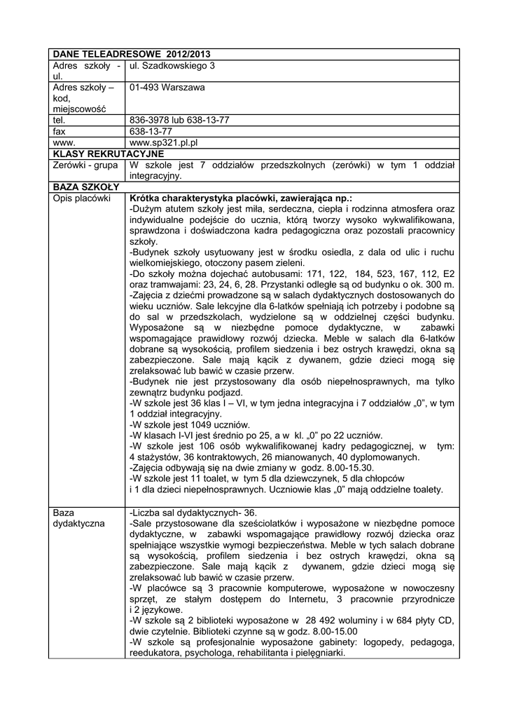 DANE TELEADRESOWE 2012/2013 Adres szkoły - ul. Szadkowskiego 3 ul. Adres szkoły – 01-493 Warszawa kod, miejscowość tel. 836-3978 lub 638-13-77 fax 638-13-77 www. www.sp321.pl.pl KLASY REKRUTACYJNE Zerówki - grupa W szkole jest 7 oddziałów przedszkolnych (zerówki) w tym 1 oddział integracyjny. BAZA SZKOŁY Opis placówki Krótka charakterystyka placówki, zawierająca np.: -Dużym atutem szkoły jest miła, serdeczna, ciepła i rodzinna atmosfera oraz indywidualne podejście do ucznia, którą tworzy wysoko wykwalifikowana, sprawdzona i doświadczona kadra pedagogiczna oraz pozostali pracownicy szkoły. -Budynek szkoły usytuowany jest w środku osiedla, z dala od ulic i ruchu wielkomiejskiego, otoczony pasem zieleni. -Do szkoły można dojechać autobusami: 171, 122, 184, 523, 167, 112, E2 oraz tramwajami: 23, 24, 6, 28. Przystanki odległe są od budynku o ok. 300 m. -Zajęcia z dziećmi prowadzone są w salach dydaktycznych dostosowanych do wieku uczniów. Sale lekcyjne dla 6-latków spełniają ich potrzeby i podobne są do sal w przedszkolach, wydzielone są w oddzielnej części budynku. Wyposażone są w niezbędne pomoce dydaktyczne, w zabawki wspomagające prawidłowy rozwój dziecka. Meble w salach dla 6-latków dobrane są wysokością, profilem siedzenia i bez ostrych krawędzi, okna są zabezpieczone. Sale mają kącik z dywanem, gdzie dzieci mogą się zrelaksować lub bawić w czasie przerw. -Budynek nie jest przystosowany dla osób niepełnosprawnych, ma tylko zewnątrz budynku podjazd. -W szkole jest 36 klas I – VI, w tym jedna integracyjna i 7 oddziałów „0”, w tym 1 oddział integracyjny. -W szkole jest 1049 uczniów. -W klasach I-VI jest średnio po 25, a w kl. „0” po 22 uczniów. -W szkole jest 106 osób wykwalifikowanej kadry pedagogicznej, w tym: 4 stażystów, 36 kontraktowych, 26 mianowanych, 40 dyplomowanych. -Zajęcia odbywają się na dwie zmiany w godz. 8.00-15.30. -W szkole jest 11 toalet, w tym 5 dla dziewczynek, 5 dla chłopców i 1 dla dzieci niepełnosprawnych. Uczniowie klas „0” mają oddzielne toalety. Baza dydaktyczna -Liczba sal dydaktycznych- 36. -Sale przystosowane dla sześciolatków i wyposażone w niezbędne pomoce dydaktyczne, w zabawki wspomagające prawidłowy rozwój dziecka oraz spełniające wszystkie wymogi bezpieczeństwa. Meble w tych salach dobrane są wysokością, profilem siedzenia i bez ostrych krawędzi, okna są zabezpieczone. Sale mają kącik z dywanem, gdzie dzieci mogą się zrelaksować lub bawić w czasie przerw. -W placówce są 3 pracownie komputerowe, wyposażone w nowoczesny sprzęt, ze stałym dostępem do Internetu, 3 pracownie przyrodnicze i 2 językowe. -W szkole są 2 biblioteki wyposażone w 28 492 woluminy i w 684 płyty CD, dwie czytelnie. Biblioteki czynne są w godz. 8.00-15.00 -W szkole są profesjonalnie wyposażone gabinety: logopedy, pedagoga, reedukatora, psychologa, rehabilitanta i pielęgniarki. Baza sportowa Świetlica - -W szkole są 3 sale gimnastyczne z pełnym zapleczem: szatnie, toalety, natryski. Największa sala ma wymiary 35 m x 14 m. -Na terenie szkoły jest zorganizowany plac zabaw dla dzieci 6-letnich. -Funkcjonuje nowoczesne boisko do piłki nożnej o wymiarach 40mx60m pokryte sztuczną trawą i bieżnia okólna L.A. -Dzieci klas 0-3 korzystają z basenu OSiR Bemowo przy ul. Oławskiej 3 - -Świetlica funkcjonuje w godzinach 7.00-18.00. -Są w niej 22 sale wyposażone w potrzebne pomoce dydaktyczne i zabawki. W roku szkolnym 2012/2013 do świetlicy uczęszcza 630 dzieci. -Dzieci sześcioletnie mają oddzielne sale świetlicowe. -W ramach zajęć świetlicowych dzieci uczestniczą w: treningach judo, programie „Od zabawy do sportu”, nauce gry w szachy, zajęciach teatralnych. -W świetlicy pracuje wykwalifikowana kadra pedagogiczna. -Zapewniamy opiekę świetlicową wszystkim chętnym uczniom klas 0-3. - Dobrowolna miesięczna opłata wynosi 20zł. Oferta -W szkole jest stołówka, którą prowadzi ajent . gastronomiczna -Jednorazowo ze stołówki może korzystać 80 dzieci. -Obiady są dwudaniowe z kompotem. -Dzieciom 6-letnim zapewniamy 3 posiłki (śniadanie, obiad i podwieczorek). -Dla sześciolatków są wyodrębnione godziny posiłków w porach, które nie kolidują z przerwami lekcyjnymi uczniów klas starszych. -Dzieci 6-letnie wszystkie posiłki spożywają w stołówce pod opieką wychowawcy i dodatkowej osoby do pomocy, która nalewa zupę przy stoliku i nadzoruje wydawanie posiłków. -Stołówka pracuje w godzinach 8.00-15.00 - Obiad kosztuje 5,5 zł, a pełne wyżywienie dla „0”zł- 7,40 zł. -Na terenie szkoły jest sklepik. Dozór placówki -Szkoła nie ma systemu alarmowego. -Drzwi do szkoły nie są zamykane, jest natomiast domofon i dzwonek przy drzwiach świetlicy. -Szkoła jest monitorowana, zainstalowano 13 kamer. -Przez całą dobę jest pełniony przez dozorcę dozór fizyczny. OFERTA EDUKACYJNA Misja szkoły Chcemy zapewnić naszym uczniom wysoką jakość nauczania, wychowania i opieki, klimat życzliwości, profesjonalizm, bogatą ofertę zajęć pozalekcyjnych, bezpieczeństwo oraz dobrą organizację pracy. Pragniemy, aby nasi uczniowie byli solidnie przygotowani do dalszej nauki, umieli dokonywać wyboru wartości ważnych w życiu, byli prawi, odpowiedzialni, tolerancyjni i kulturalni. Chcemy, aby rodzice darzyli nas zaufaniem i wspomagali w realizacji podejmowanych działań. Aby pracownicy szkoły mieli satysfakcję z wykonywanej pracy. By szkoła zapewniała uczniom poczucie bezpieczeństwa, tworzyła przyjazną atmosferą i cieszyła się uznaniem w środowisku lokalnym. Udział w -W ramach Szkolnego Programu Profilaktycznego systematycznie odbywają programach się zajęcia w poszczególnych klasach na tematy związane z potrzebami uczniów. Szkoła realizuje własny program wychowawczy: Dobre maniery łamią bariery, czyli „Grunt to dobre wychowanie ”. Innowacje -Z uczniami wybitnie zdolnymi realizowane są autorskie p