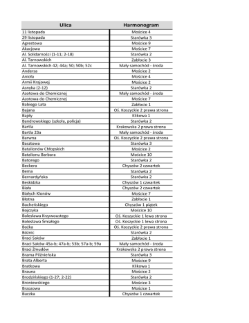 Ulica 11 listopada 29 listopada Agrestowa Akacjowa Al. Solidarności (1-11; 2-18) Al. Tarnowskich Al. Tarnowskich 42; 44a; 50; 50b; 52c Andersa Anioła Armii Krajowej Asnyka (2-12) Azotowa do Chemicznej Azotowa do Chemicznej Babiego Lata Bajana Bajdy Bandrowskiego (szkoła, policja) Bartla Bartla 23a Barwna Basztowa Batalionów Chłopskich Batalionu Barbara Batorego Beckera Bema Bernardyńska Beskidzka Biała Białych Klonów Błotna Bocheńskiego Bojczyka Bolesława Krzywoustego Bolesława Śmiałego Bożka Bóżnic Braci Saków Braci Saków 45a-b; 47a-b; 53b; 57a-b; 59a Braci Żmudów Brama Pilźnieńska Brata Alberta Bratkowa Brauna Brodzińskiego (1-27; 2-22) Broniewskiego Brzozowa Buczka Harmonogram Mościce 4 Starówka 3 Mościce 9 Mościce 7 Starówka 2 Zabłocie 3 Mały samochód - środa Mościce 2 Mościce 4 Mościce 2 Starówka 2 Mały samochód - środa Mościce 7 Zabłocie 1 Oś. Koszyckie 2 prawa strona Klikowa 1 Starówka 2 Krakowska 2 prawa strona Mały samochód - środa Oś. Koszyckie 2 prawa strona Starówka 3 Mościce 2 Mościce 10 Starówka 2 Chyszów 2 czwartek Starówka 2 Starówka 2 Chyszów 1 czwartek Chyszów 2 czwartek Mościce 7 Zabłocie 1 Chyszów 1 piątek Mościce 10 Oś. Koszyckie 1 lewa strona Oś. Koszyckie 1 lewa strona Oś. Koszyckie 2 prawa strona Starówka 2 Zabłocie 1 Mały samochód - środa Krakowska 2 prawa strona Starówka 3 Mościce 9 Klikowa 1 Mościce 2 Starówka 2 Mościce 3 Mościce 1 Chyszów 1 czwartek Budowlana Burkiewicza Bursy Cedrowa Chabrowa Chemiczna Chłopska Chopina Chrobrego Chrząstowskich Chyszowska (1-27; 2-36) Chyszowska (29-53; 38-50) Cicha Ciołkoszów Czajki Czarna Droga Czerwona Czerwonych Klonów Czupiela Czysta Daleka Dąbala Dąbrowskiego (1-25; 2-10) Dąbrowskiego (27-39, 12-38) Dębowa Do Huty Do Promu Dobra Dobrowolskiego Dobrzańskiego Dojazd Droga do Huty PKP Drzymały Dunajcowa Emerytów Esperantystów Fabryczna Falista Fasolowa Fąfary Forteczna Franciszkańska Furmańska Gałczyńskiego Gęsia Giełdowa Gliniańska Gładysza Gładysza Głęboka Krakowska 1 lewa strona Mościce 10 Chyszów 1 piątek Klikowa 1 Mościce 3 Mościce 8 Mały samochód - środa Starówka 1 Oś. Koszyckie 1 lewa strona Zabłocie 1 Starówka 1 Chyszów 1 piątek Starówka 3 Mościce 2 Klikowa 1 Mościce 9 Mościce 3 Mościce 7 Mościce 10 Chyszów 2 czwartek Mościce 1 Krakowska 2 prawa strona Starówka 3 Zabłocie 2 Starówka 3 Oś. Krakowska wtorek Mościce 7 Chyszów 1 piątek Oś. Koszyckie 2 prawa strona Oś. Koszyckie 2 prawa strona Zabłocie 4 Mały samochód - środa Zabłocie 2 Mościce 7 Mościce 3 Zabłocie 3 Krakowska 1 lewa strona Zabłocie 1 Klikowa 1 Zabłocie 2 Starówka 3 Starówka 3 Chyszów 2 czwartek Mościce 3 Zabłocie 1 Chyszów 2 czwartek Krakowska 1 lewa strona Zabłocie 1 Mały samochód - środa Zabłocie 1 Głogowa Główna Godowskiego Goldhammera (1-13; 2-12) Gołębia Goslara Gostyńskiego Goździkowa Górska Górskiego Grabowskiego Grochowa Grochowska Grota Roweckiego Grottgera (1-15; 2-12) Gruntowa Grunwaldzka (1-5; 4-28) Grzybowa Gucwy Gumniska Halskiego Harcerska Hibnera Hłaski Hodowlana Jabłoniowa Jagiellońska Jagiełły Jantona Jara Jarzębinowa Jarzynowa Jaśminowa Jordana Juraszka Juraszka Kacza Kaczkowskiego Kaflarska Kapitulna Kasprzyków Kassali Kasztanowa Katedralna Kąpielowa Kępińskiego Kilińskiego Klasztorna Kleeberga Klikowska Mościce 7 Krakowska 2 prawa strona Mościce 2 Starówka 2 Klikowa 1 Starówka 2 Oś. Koszyckie 2 prawa strona Klikowa 1 Zabłocie 4 Chyszów 2 piątek Zabłocie 1 Klikowa 1 Mościce 10 Mościce 6 Starówka 1 Chyszów 1 czwartek Oś. Krakowska wtorek Klikowa 1 Mościce 9 Zabłocie 2 Zabłocie 4 Zabłocie 3 Mościce 4 Chyszów 1 piątek Chyszów 1 czwartek Klikowa 2 Zabłocie 2 Oś. Koszyckie 1 lewa strona Zabłocie 3 Zabłocie wtorek Mościce 7 Mościce 9 Mościce 2 Mościce 2 Zabłocie 1 Mały samochód - środa Zabłocie 1 Starówka 3 Zabłocie 2 Starówka 3 Mościce 2 Krakowska 2 prawa strona Mościce 7 Starówka 3 Krakowska 1 lewa strona Mościce 4 Mościce 6 Starówka 3 Oś. Koszyckie 2 prawa strona Klikowa 1 Klikowska Klikowska (2-12) Klimeckiego Kmicica Kolejowa Konarskiego Konna Konopna Kopernika Kossaka Kosynierów Koszycka Kotulskiej Kowalskiego Kozioła Krakowska (1-35; 2-42) Krakowska (190-296; 197-309) Krakowska (83-195; 70-188) Krakowska 115a Krakusa Krasińskiego (1-51; 14-52) Kraszewskiego Kręta Królowej Jadwigi Krótka Kruczkowskiego Kruszyny Ks. Grzanki Ks. Indyka Kupiecka Kużdżała Kwiatkowskiego Kwiatowa Langiewicza Ledóchowskich Legionów (1-17; 2-30) Leliwitów Leńka Letnia Limanowskiego Lisia Lisia Liściasta Lniana Lotnicza Lotnicza 13; 75 Ludowa Lwowska (1-23; 2-20) Łanowa Łazienna Klikowa 2 Starówka 3 Mościce 6 Mościce 5 Mościce 5 Zabłocie 2 Klikowa 2 Klikowa 2 Starówka 2 Zabłocie 1 Zabłocie 1 Oś. Koszyckie 2 prawa strona Zabłocie 3 Oś. Koszyckie 2 prawa strona Klikowa 2 Starówka 1 Oś. Koszyckie 2 prawa strona Krakowska 1 lewa strona Mały samochód - środa Mościce 4 Starówka 1 Oś. Krakowska wtorek Starówka 3 Oś. Koszyckie 1 lewa strona Starówka 3 Mościce 10 Mościce 6 Mościce 7 Mościce 7 Starówka 3 Oś. Koszyckie 2 prawa strona Mościce 8 Zabłocie 3 Mościce 7 Mościce 5 Starówka 3 Mały samochód - środa Zabłocie 3 Mościce 5 Starówka 2 Mały samochód - środa Mościce 6 Oś. Koszyckie 2 prawa strona Klikowa 1 Zabłocie 3 Mały samochód - środa Mościce 3 Starówka 3 Zabłocie 2 Starówka 2 Łęgowa Łęgowa Łokietka Łukasiewicza Łyczków Łyczków Majchrzyka Malczewskiego Małe Schody Marii Panny (9-15; 2-6) Matejki Matuszewskiego Matuszewskiego Maziarskiego Mąsiora Metalowa Mickiewicza (1-27, 2-6) Mieszka I-go Mieszka I-go 58b Miętowa Miłosza Miodowa Modra Modra Mokra Monopolowa Moraczewskiego Moscickiego (1-37; 2-22) Moscickiego (87-247; 118-274) Mostowa Mroźna Muchy Murarska Muzyczna Nad Białą Nad Białą Nadbrzeżna Dolna Nadbrzeżna Górna Nadbrzeżna Górna-Boczna Nakończego Na