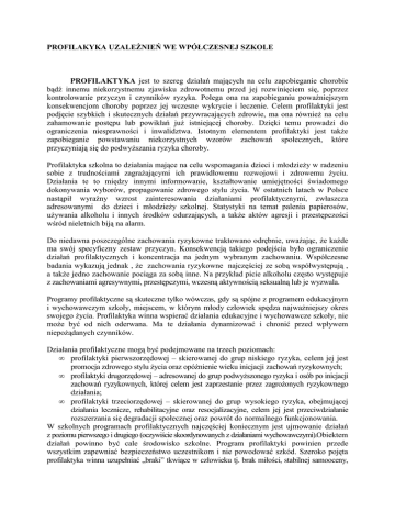 PROFILAKYKA UZALEśNIEŃ WE WPÓŁCZESNEJ SZKOLE PROFILAKTYKA jest to szereg działań mających na celu zapobieganie chorobie bądź innemu niekorzystnemu zjawisku zdrowotnemu przed jej rozwinięciem się, poprzez kontrolowanie przyczyn i czynników ryzyka. Polega ona na zapobieganiu powaŜniejszym konsekwencjom choroby poprzez jej wczesne wykrycie i leczenie. Celem profilaktyki jest podjęcie szybkich i skutecznych działań przywracających zdrowie, ma ona równieŜ na celu zahamowanie postępu lub powikłań juŜ istniejącej choroby. Dzięki temu prowadzi do ograniczenia niesprawności i inwalidztwa. Istotnym elementem profilaktyki jest takŜe zapobieganie powstawaniu niekorzystnych wzorów zachowań społecznych, które przyczyniają się do podwyŜszania ryzyka choroby. Profilaktyka szkolna to działania mające na celu wspomagania dzieci i młodzieŜy w radzeniu sobie z trudnościami zagraŜającymi ich prawidłowemu rozwojowi i zdrowemu Ŝyciu. Działania te to między innymi informowanie, kształtowanie umiejętności świadomego dokonywania wyborów, propagowanie zdrowego stylu Ŝycia. W ostatnich latach w Polsce nastąpił wyraźny wzrost zainteresowania działaniami profilaktycznymi, zwłaszcza adresowanymi do dzieci i młodzieŜy szkolnej. Statystyki na temat palenia papierosów, uŜywania alkoholu i innych środków odurzających, a takŜe aktów agresji i przestępczości wśród nieletnich biją na alarm. Do niedawna poszczególne zachowania ryzykowne traktowano odrębnie, uwaŜając, Ŝe kaŜde ma swój specyficzny zestaw przyczyn. Konsekwencją takiego podejścia było ograniczenie działań profilaktycznych i koncentracja na jednym wybranym zachowaniu. Współczesne badania wykazują jednak , Ŝe zachowania ryzykowne najczęściej ze sobą współwystępują , a takŜe jedno zachowanie pociąga za sobą inne. Na przykład picie alkoholu często występuje z zachowaniami agresywnymi, przestępczymi, wczesną aktywnością seksualną lub je wyzwala. Programy profilaktyczne są skuteczne tylko wówczas, gdy są spójne z programem edukacyjnym i wychowawczym szkoły, miejscem, w którym młody człowiek spędza najwaŜniejszy okres swojego Ŝycia. Profilaktyka winna wspierać działania edukacyjne i wychowawcze szkoły, nie moŜe być od nich oderwana. Ma te działania dynamizować i chronić przed wpływem niepoŜądanych czynników. Działania profilaktyczne mogą być podejmowane na trzech poziomach: • profilaktyki pierwszorzędowej – skierowanej do grup niskiego ryzyka, celem jej jest promocja zdrowego stylu Ŝycia oraz opóźnienie wieku inicjacji zachowań ryzykownych; • profilaktyki drugorzędowej – adresowanej do grup podwyŜszonego ryzyka i osób po inicjacji zachowań ryzykownych, której celem jest zaprzestanie przez zagroŜonych ryzykownego działania; • profilaktyki trzeciorzędowej – skierowanej do grup wysokiego ryzyka, obejmującej działania lecznicze, rehabilitacyjne oraz resocjalizacyjne, celem jej jest przeciwdziałanie rozszerzania się degradacji społecznej oraz powrót do normalnego funkcjonowania. W szkolnych programach profilaktycznych najczęściej koniecznym jest ujmowanie działań z poziomu pierwszego i drugiego (oczywiście skoordynowanych z działaniami wychowawczymi).Obiektem działań powinno być cale środowisko szkolne. Program profilaktyki powinien przede wszystkim zapewniać bezpieczeństwo uczestnikom i nie powodować szkód. Szeroko pojęta profilaktyka winna uzupełniać „braki” tkwiące w człowieku tj. brak miłości, stabilnej samooceny, wiary w siebie, umiejętności rozwiązywania problemów, brak poczucia bezpieczeństwa oraz poruszać tematy związane z rozwojem młodego człowieka, ze świadomością własnych potrzeb uczuć , z problemem w grupie rówieśniczej, z presją. Ma za zadanie uczyć podejmowania decyzji i odmawiania , gdy proponowany jest narkotyk, a takŜe kłaść nacisk na świadomość zagroŜeń i konsekwencji płynących z uzaleŜnień. Doświadczenia ostatnich lat pokazują, Ŝe skuteczna profilaktyka nie stanowi jednorazowego przedsięwzięcia, ale aby działania odniosły skutek, muszą być powtarzane i nastawione na współpracę z rodzicami. Badania przeprowadzone wśród młodzieŜy wykazały, Ŝe motywami skłaniającymi ich do sięgania po papierosy, alkohol czy narkotyki są: zła sytuacja rodzinna, niepowodzenia w szkole, ciekawość „jak to jest” oraz namowy rówieśników, a takŜe niewłaściwy przykład rodziców. Najmniejsze znaczenie ma przyjemność czerpana z uczucia odurzenia. Dla nastolatka narkotyk często bywa środkiem „ zaspakajającym” jego potrzeby. Kiedy czuje się niepewnie, nie wie co zrobić, obawia się oceny innych, chcąc poczuć się „kimś” – bierze Program profilaktyczny powinien koncentrować się na redukcji i eliminacji czynników ryzyka przy jednoczesnym wzmacnianiu czynników pozytywnych i zapobieganiu zachowaniom ryzykownym. Cele, do których naleŜy dąŜyć: • zapobieganie zachowaniom ryzykownym wśród dzieci i młodzieŜy • przekazanie wiedzy na temat konsekwencji stosowania uŜywek • podniesienie bezpieczeństwa uczniów w szkołach poprzez zwiększenie świadomości moŜliwości reagowania na sytuacje kryzysowe • obalenie mitów krąŜących wśród młodzieŜy na temat substancji psychoaktywnych • kształtowanie w uczniach poczucia własnej wartości • motywowanie do podejmowania aktywności zaspokajających potrzeby emocjonalne, społeczne i duchowe • rozwinięcie kompetencji nauczycieli i rodziców w zakresie postępowania w sytuacjach trudnych. Co powinno nas zaniepokoić? Pierwszym sygnałem ostrzegawczym dla rodziców i nauczyciela, Ŝe dziecko moŜe zaŜywać narkotyki, są zmiany jego osobowości: wahania nastrojów, draŜliwość, skrytość, apatia, nieprzewidywalność, nerwowość, bardzo często łamanie reguł Ŝycia szkolnego i domowego, zahamowanie rozwoju emocjonalnego, poczucie beznadziejności i